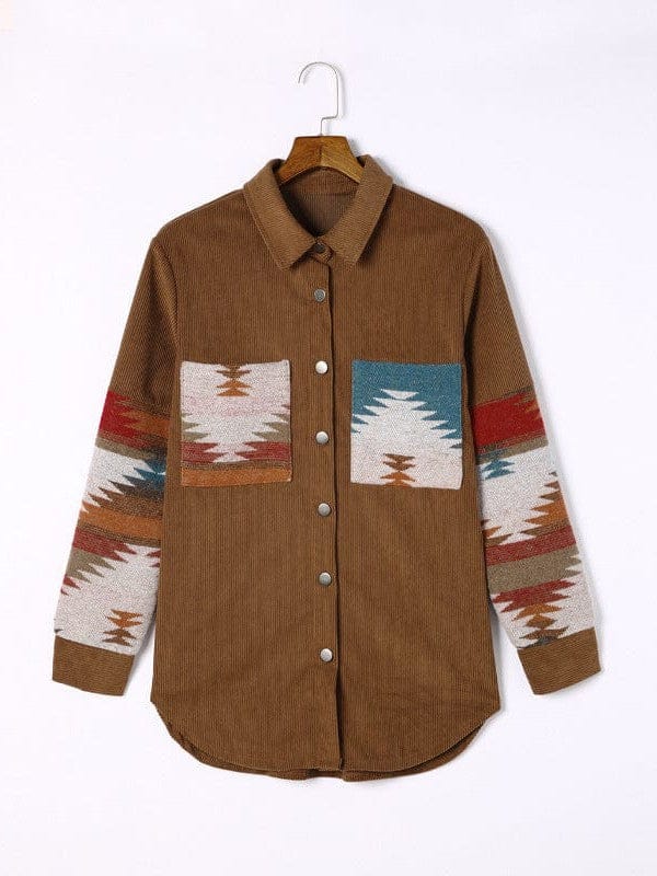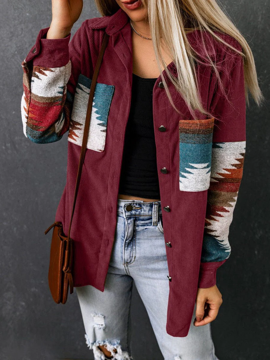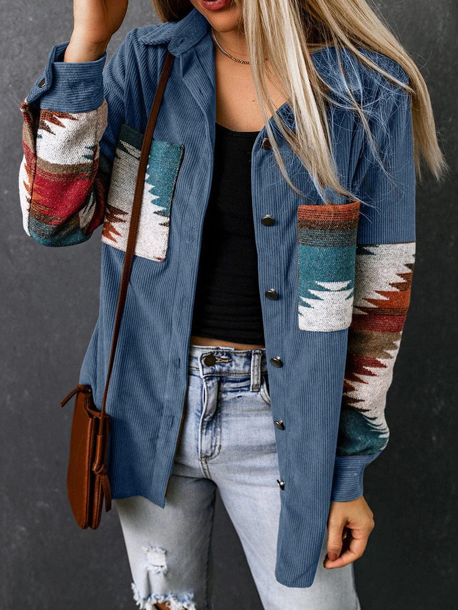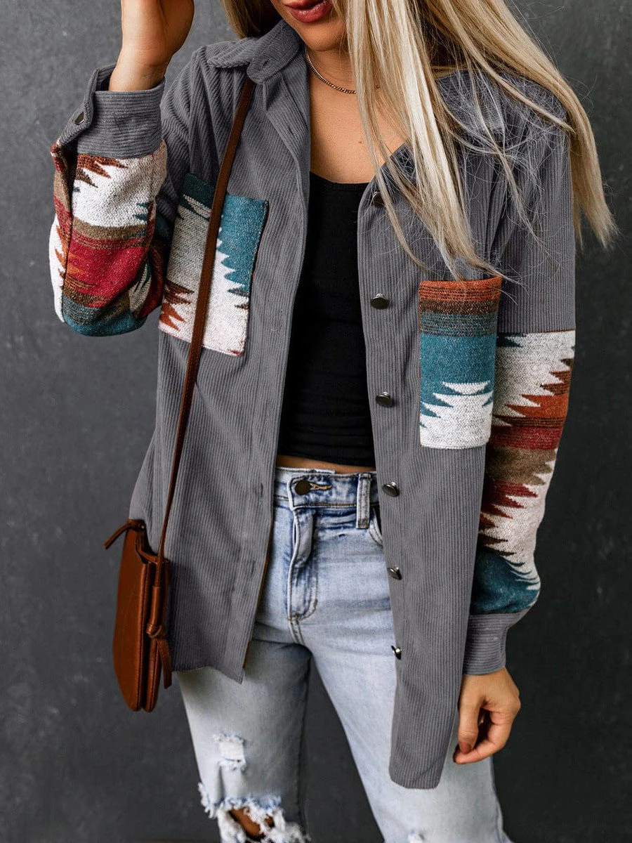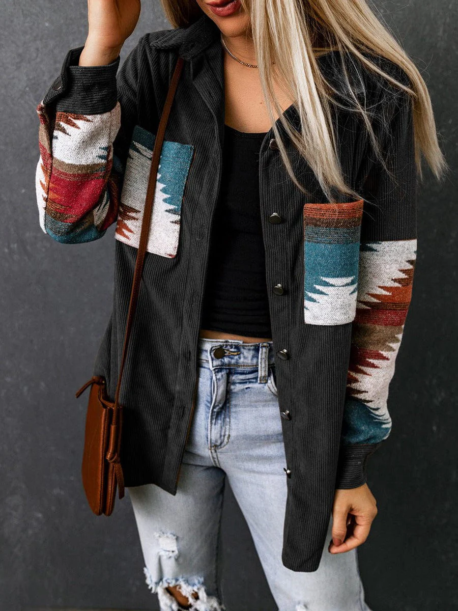• Corduroy Casual Cardigan With Western Print For Women