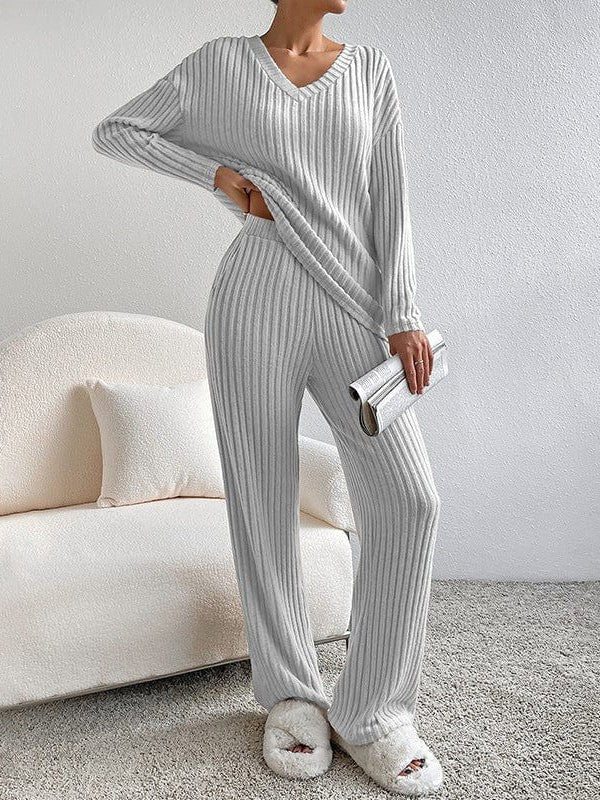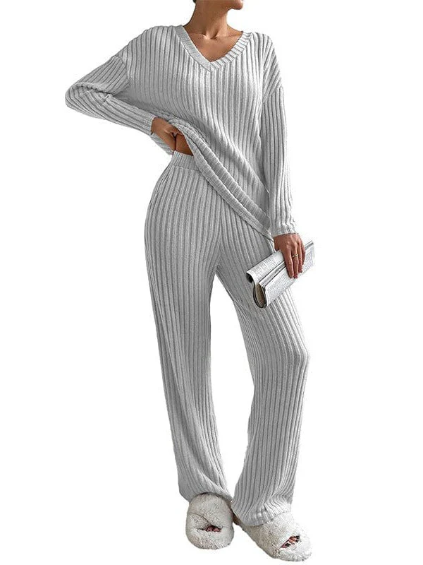 Women'S Solid Color V-Neck Suit With Long Sleeves And Straight Trousers