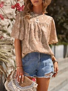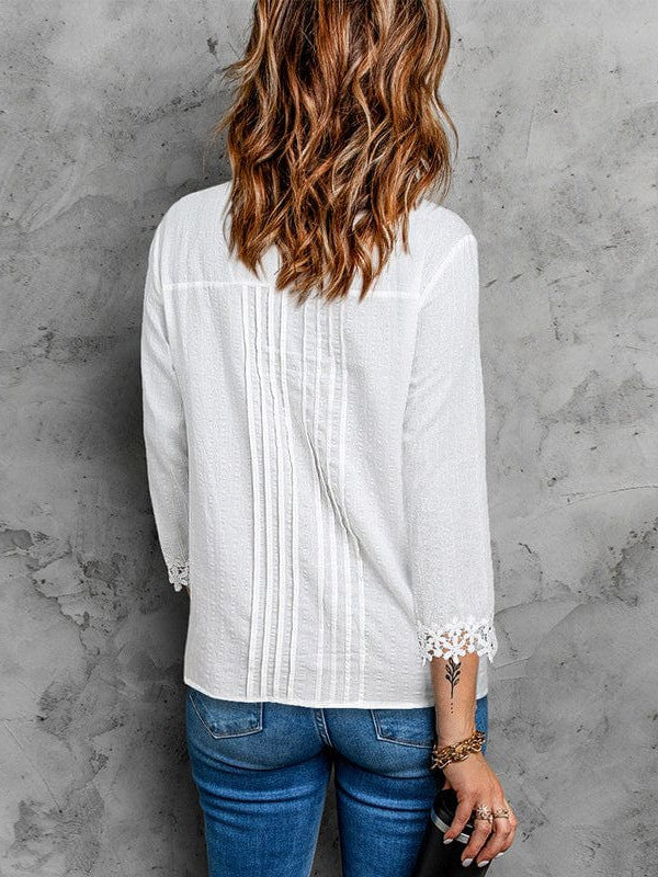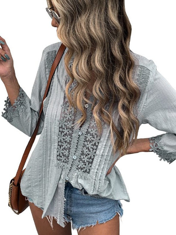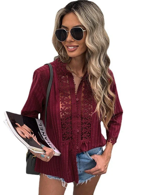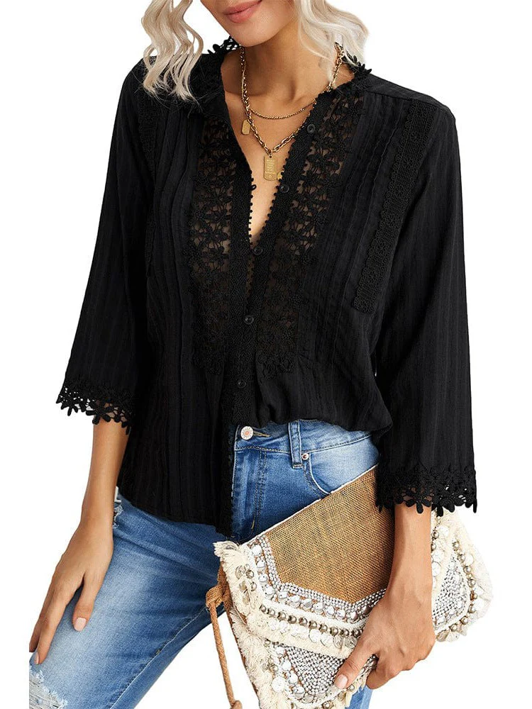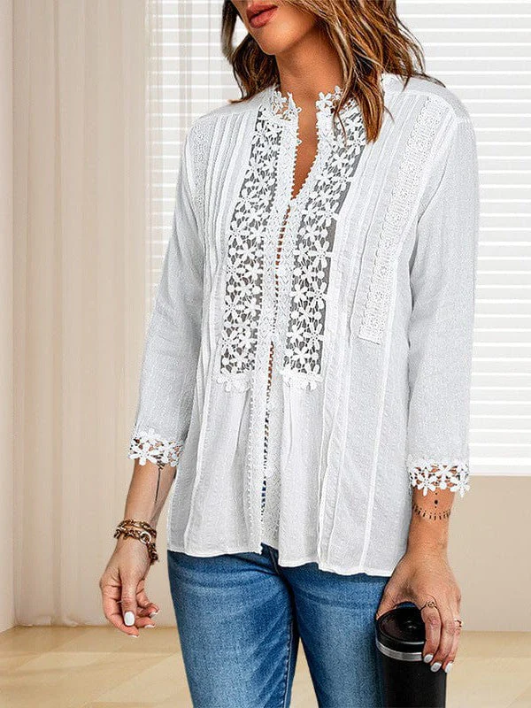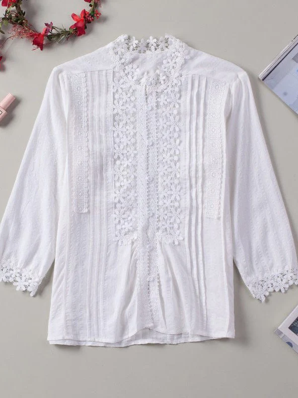 • Loose Stand-Up Collar Lace Cardigan - Women'S Cotton Three-Quarter Sleeve Blouse