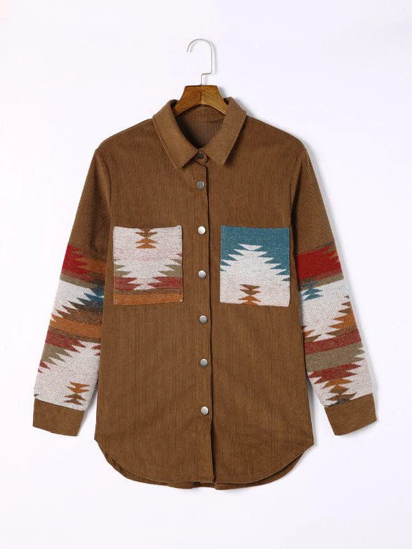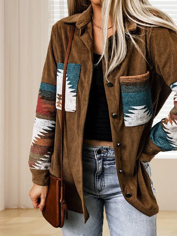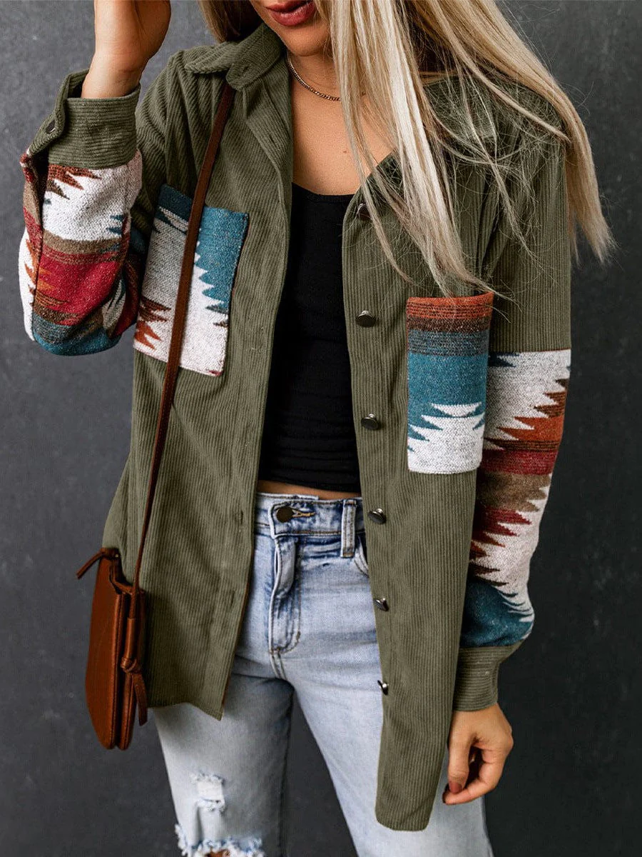 Corduroy Casual Cardigan With Western Print For Women