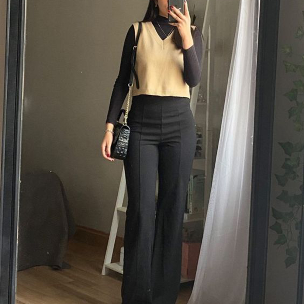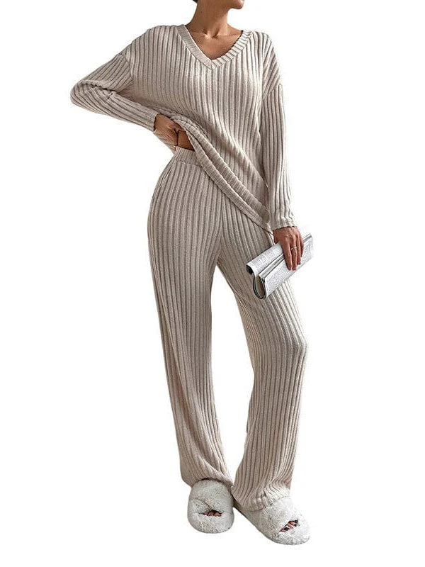 • Women'S Solid Color V-Neck Suit With Long Sleeves And Straight Trousers