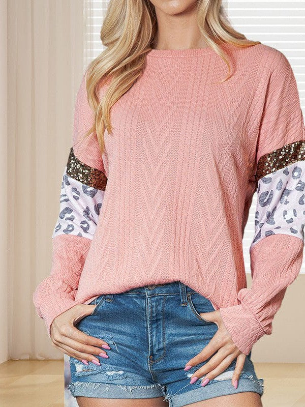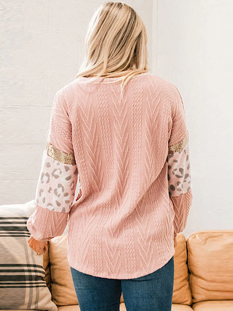 • Women'S Leopard Print Knitted Pullover Sweater With Round Neck