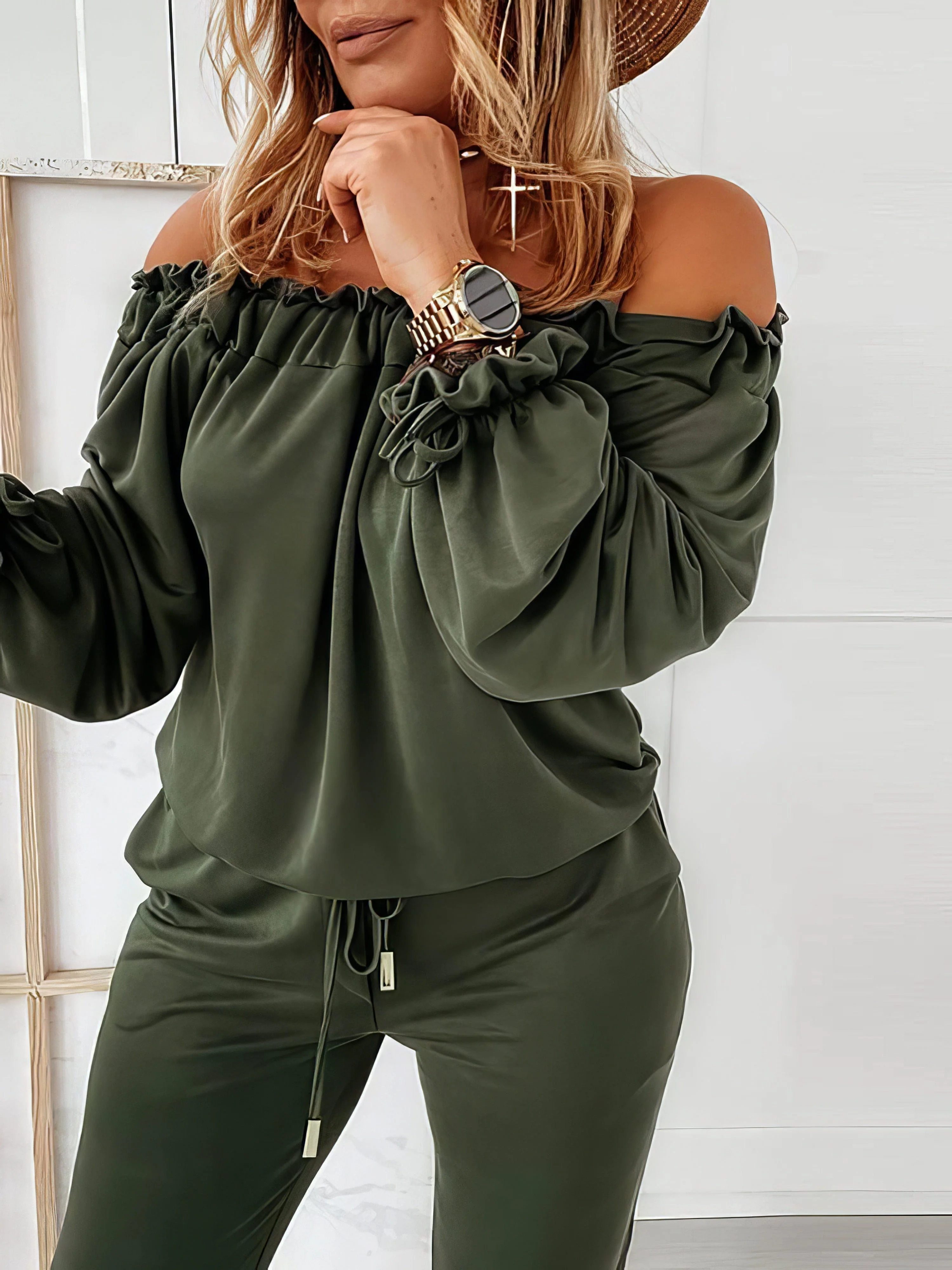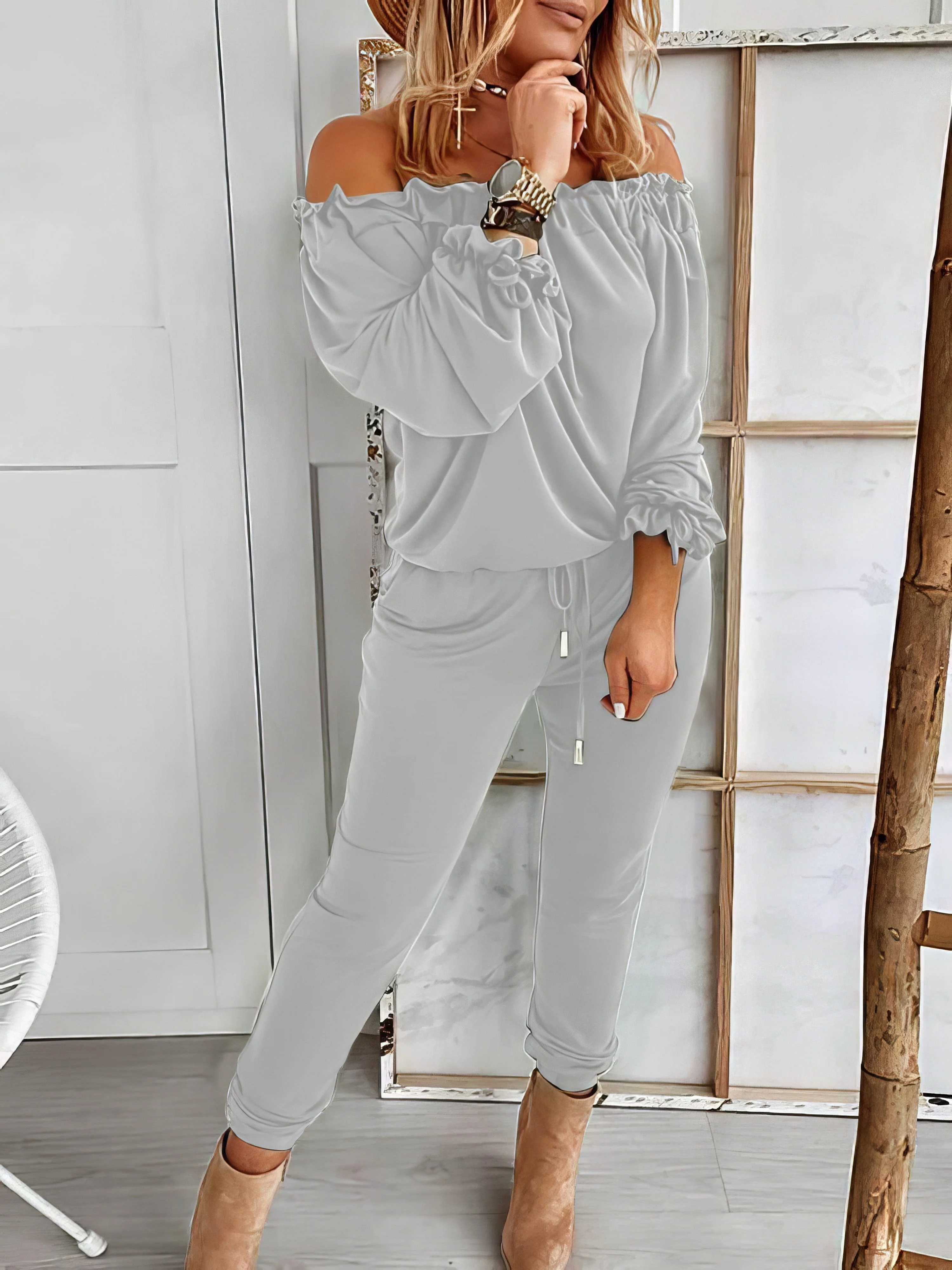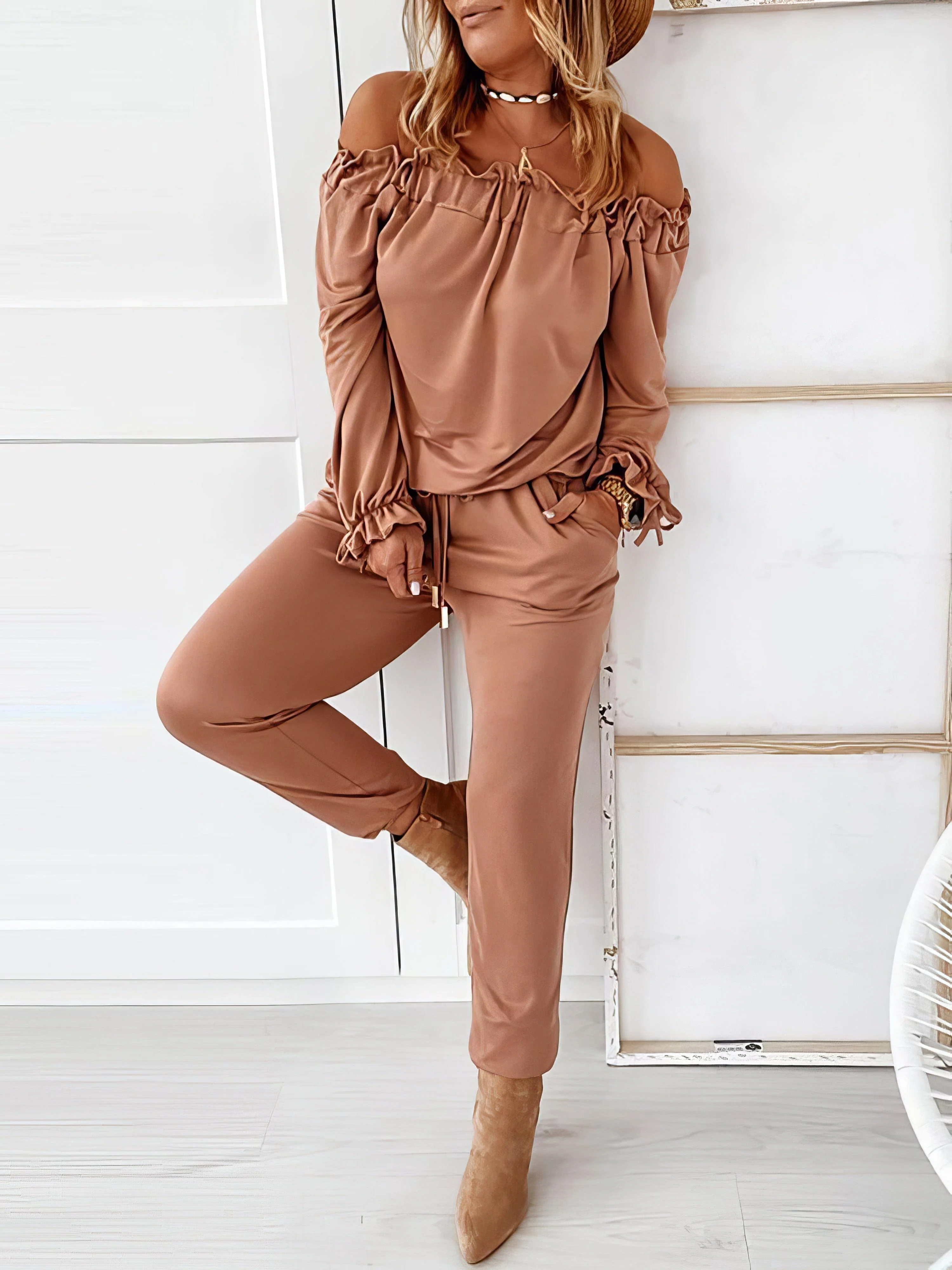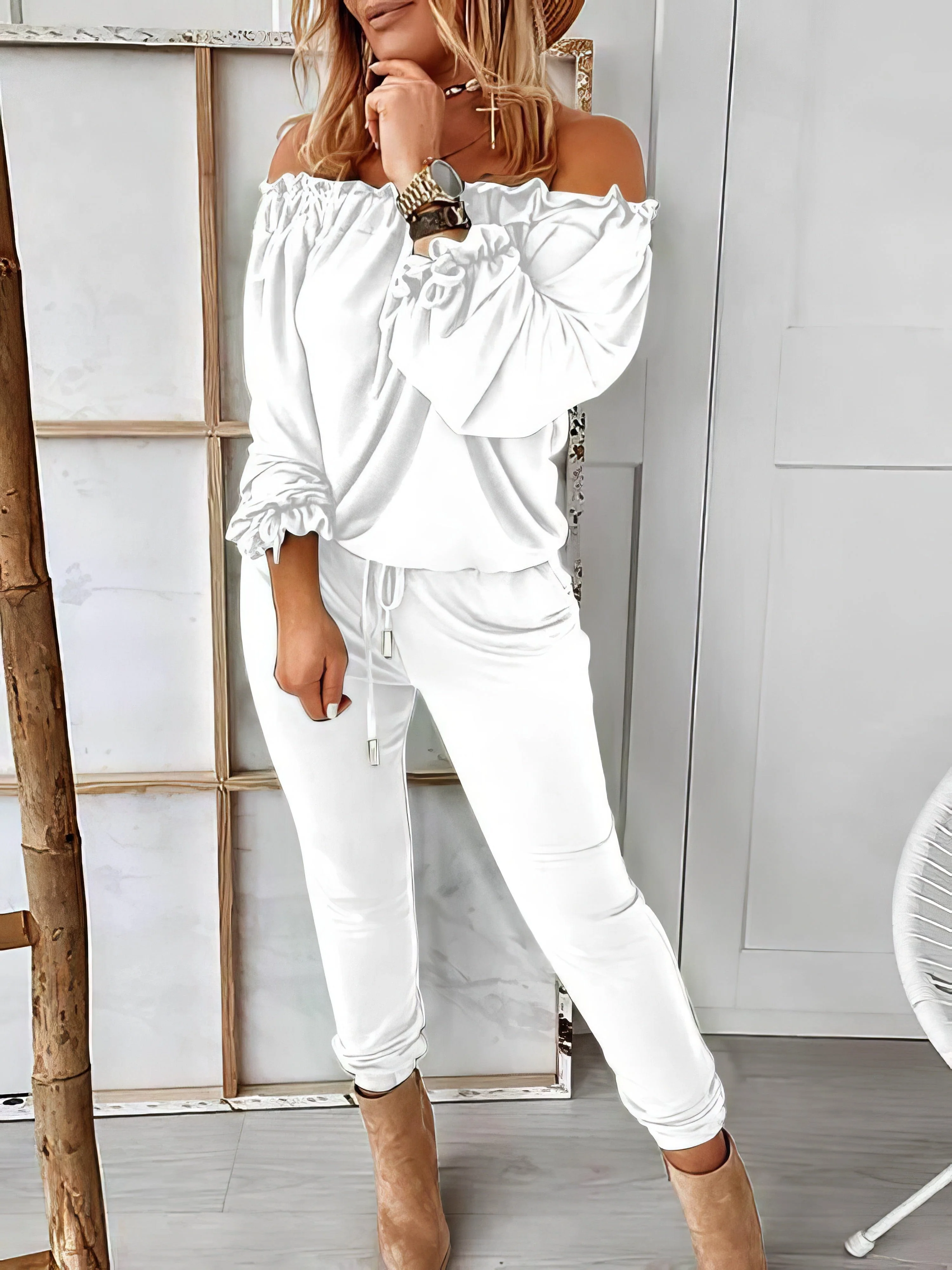 Color Block Crew Neck Long Sleeve Tops & Drawstring Long Pants Two-Piece Set