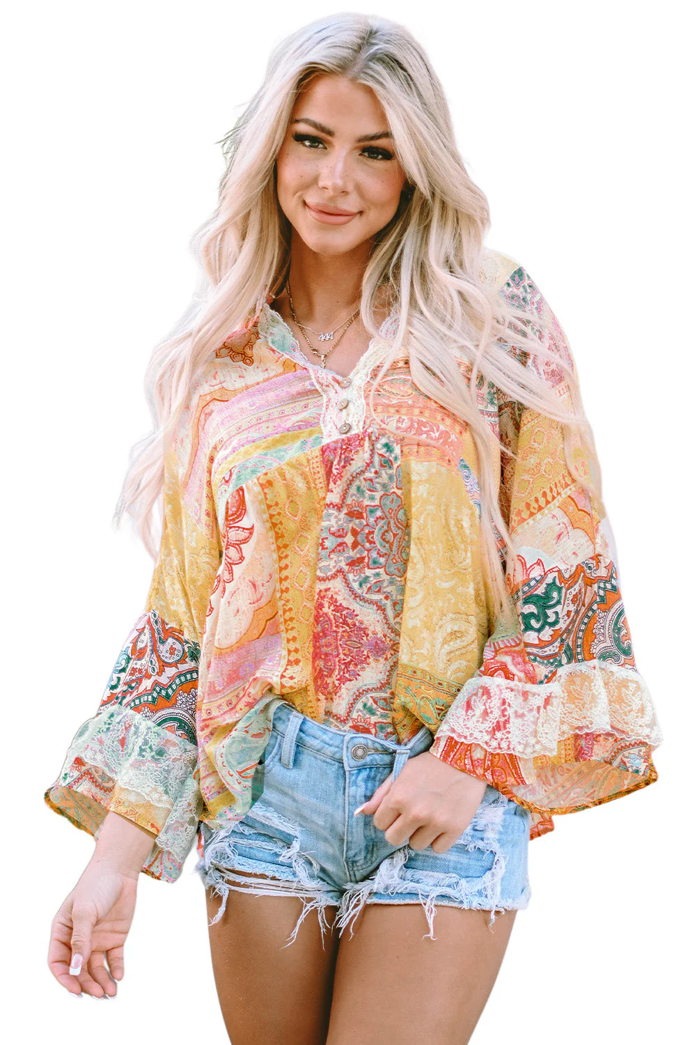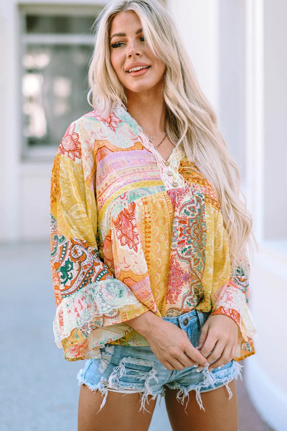 Vintage Map Print V-Neck Long Sleeve Blouse with Casual Flair