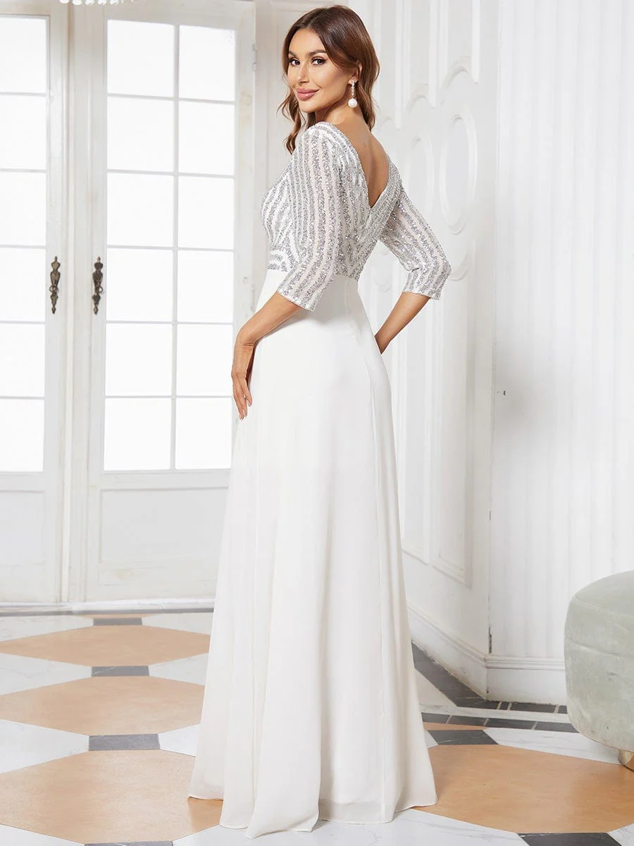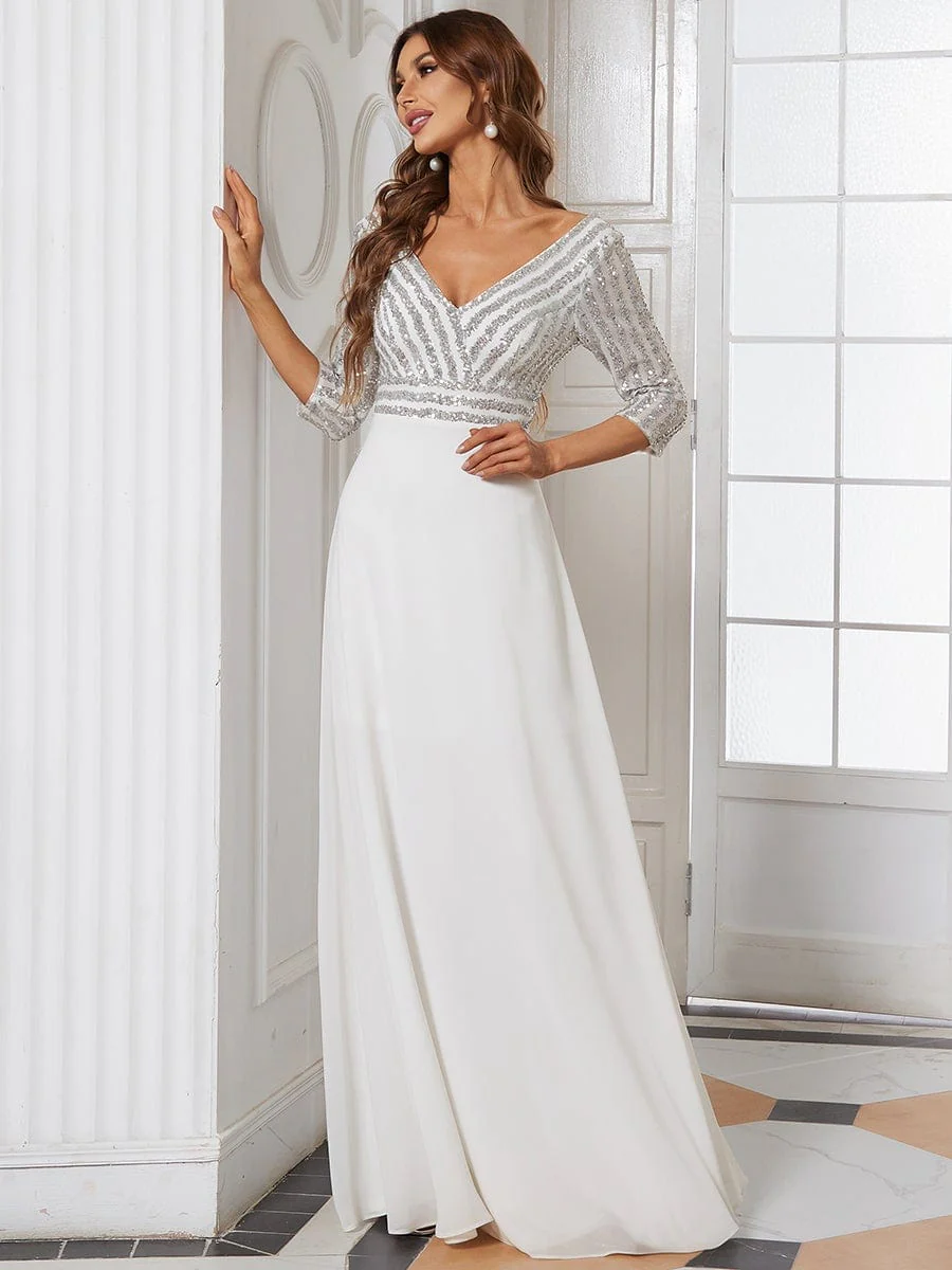 Sexy V Neck Sequin Evening Dresses with 3/4 Sleeve