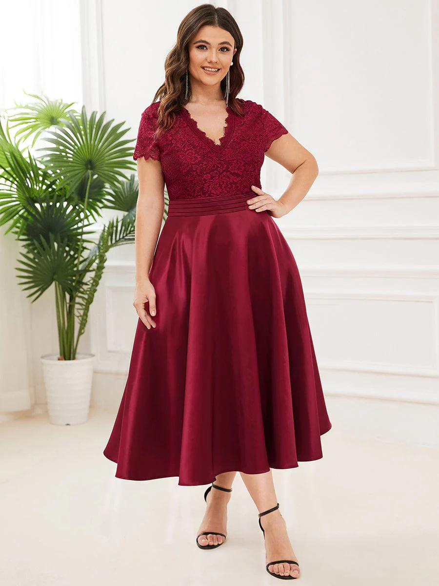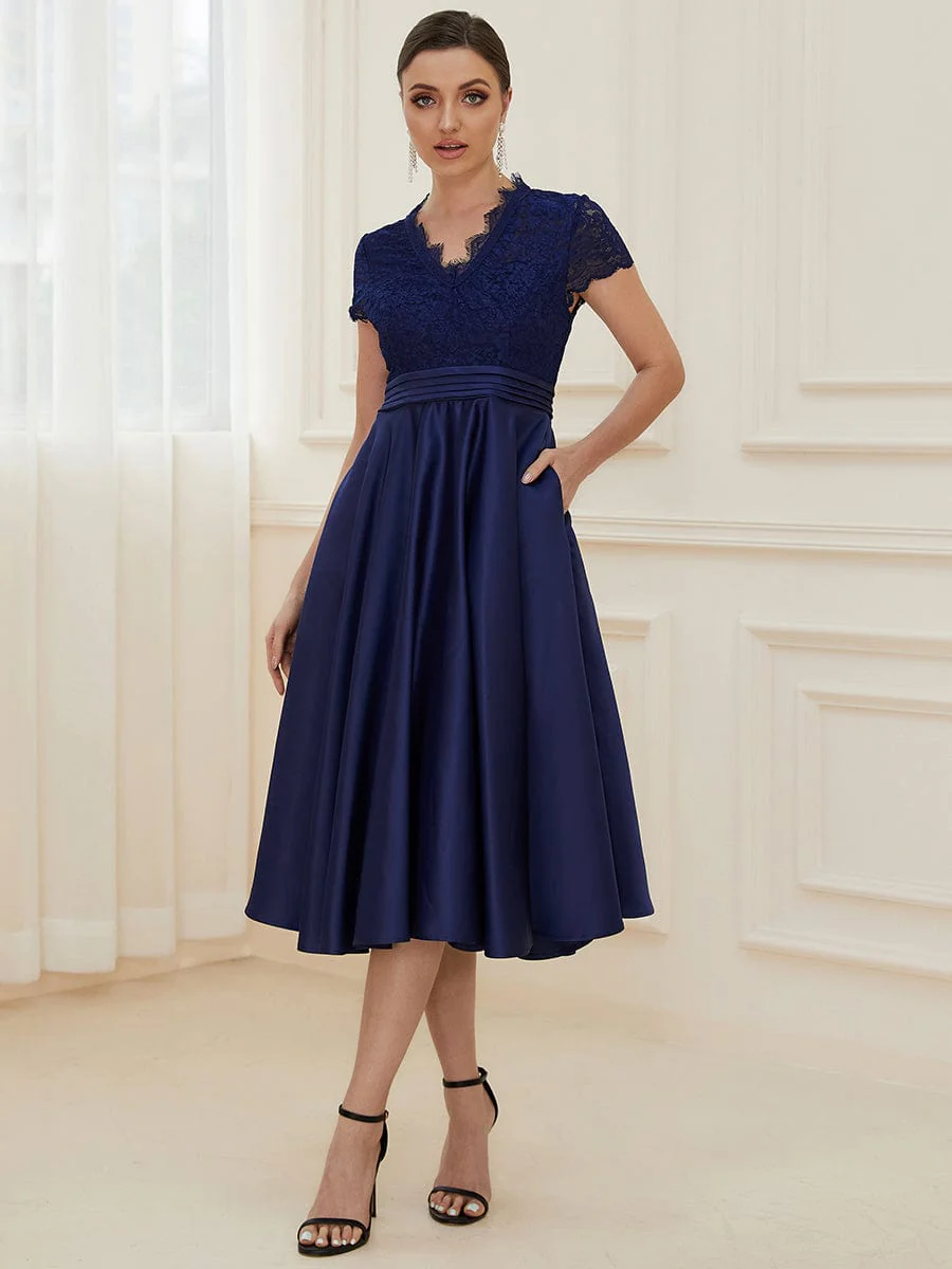 Romantic V-neck Lace Bodice Wedding Guest Dress with Pockets