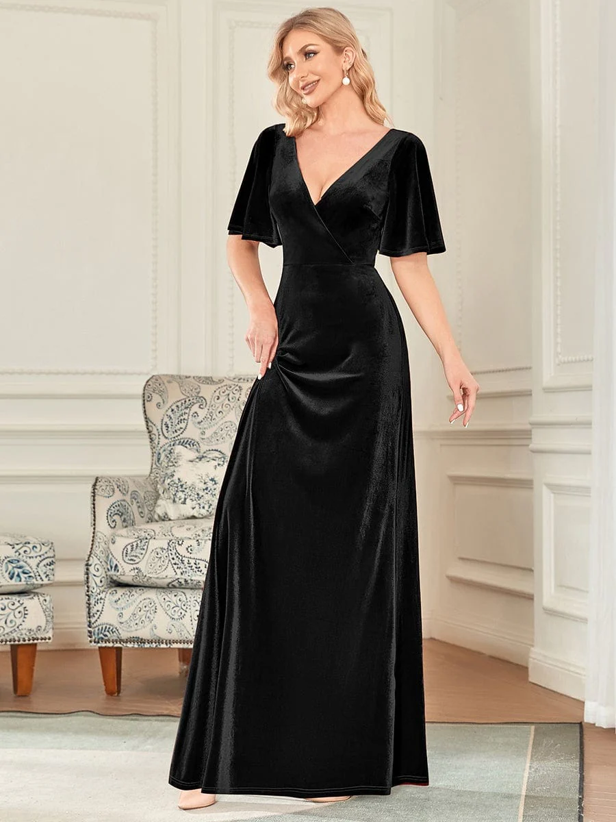 Chic Double V Neck Velvet Party Dress with Ruffled Sleeves