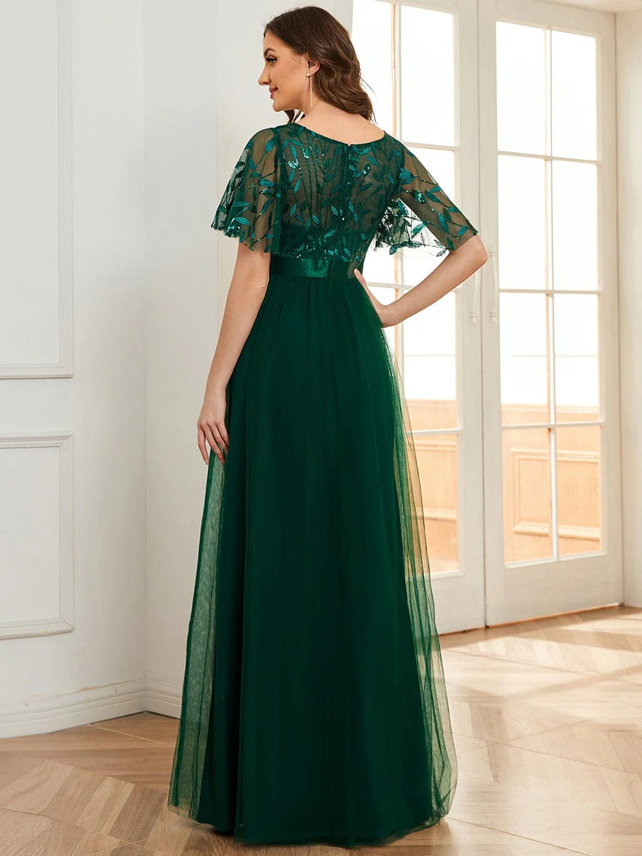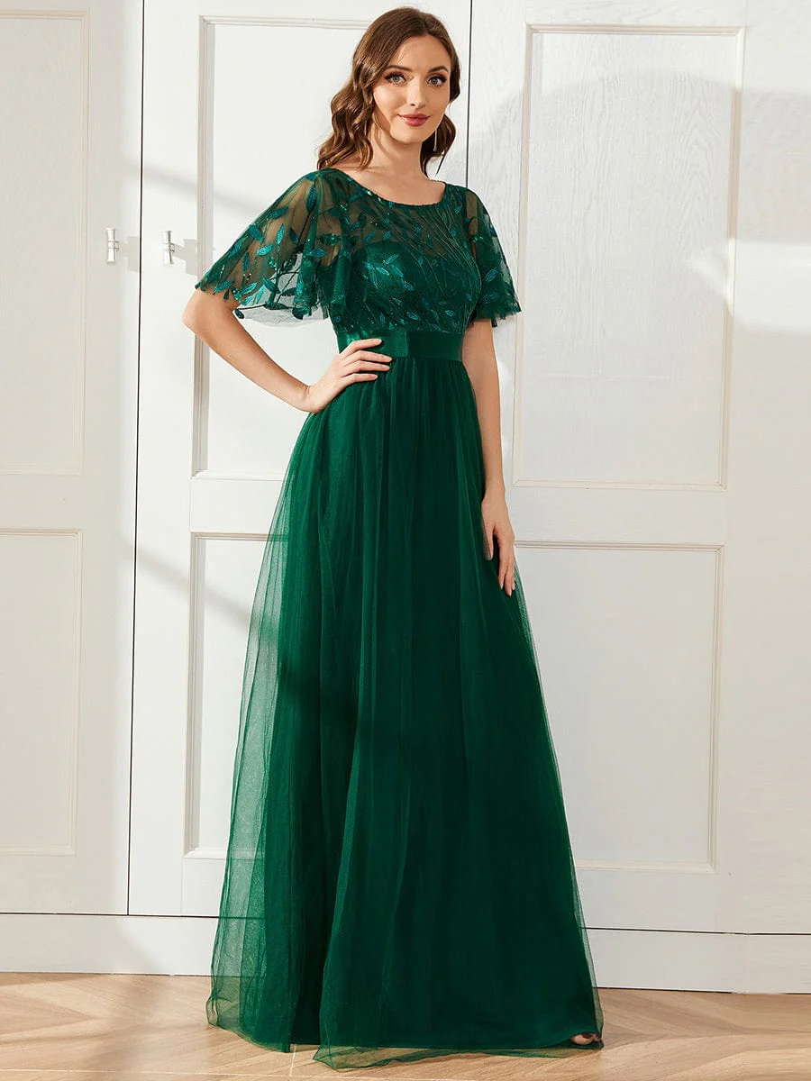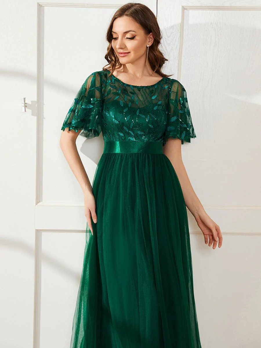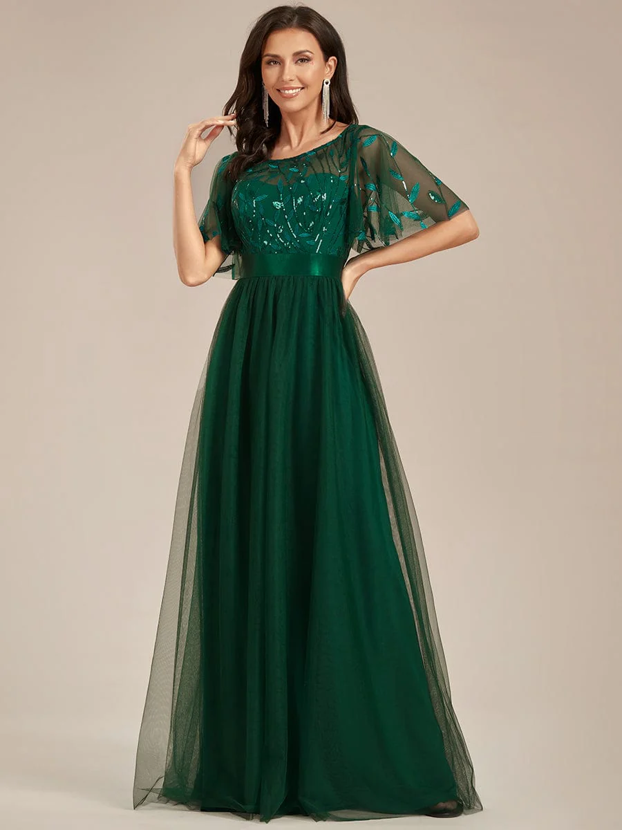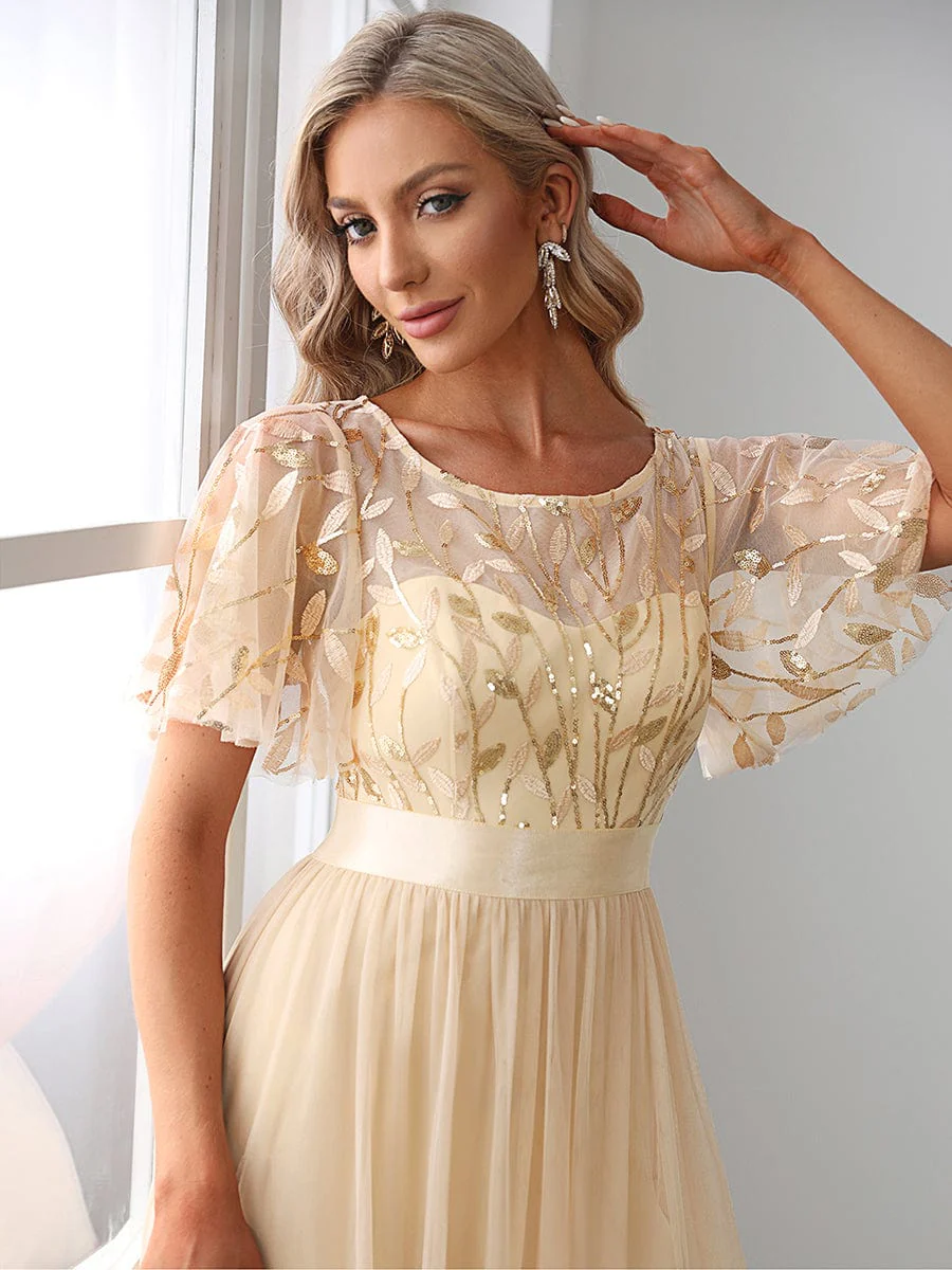 Women's A-Line Sequin Leaf Maxi Prom Dress with Sleeves