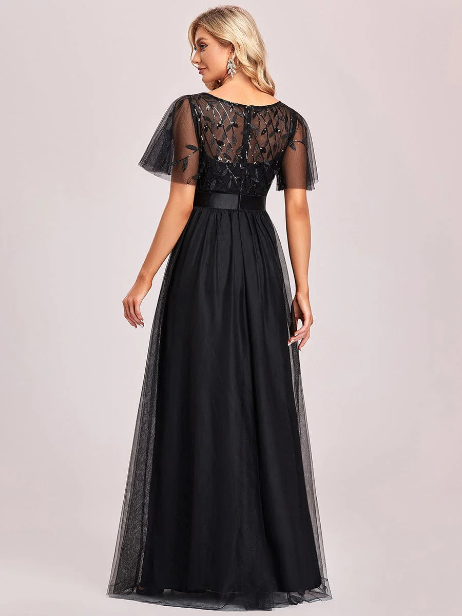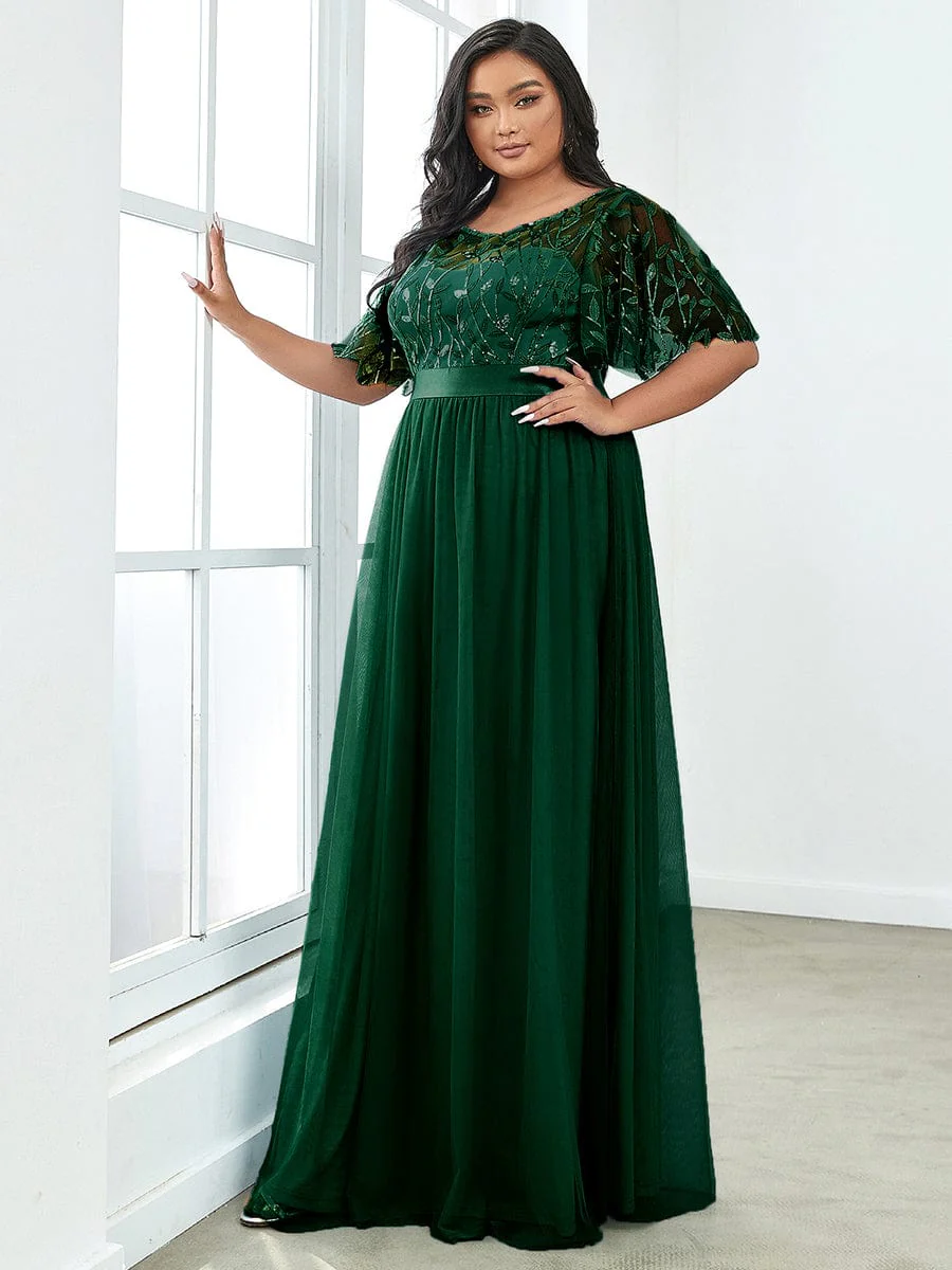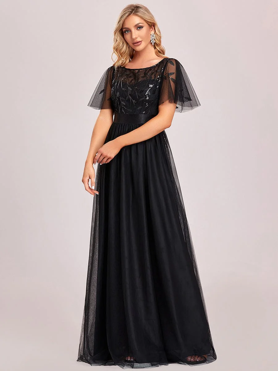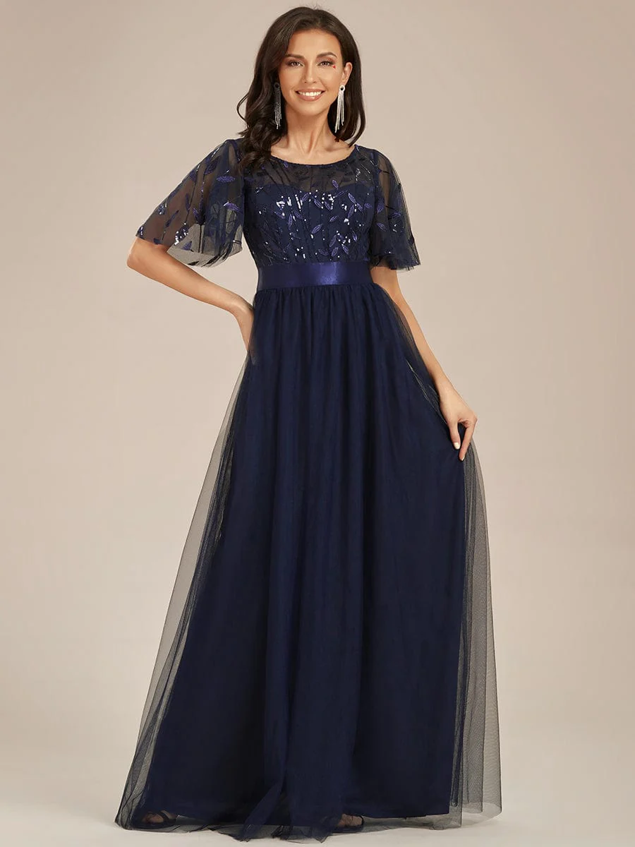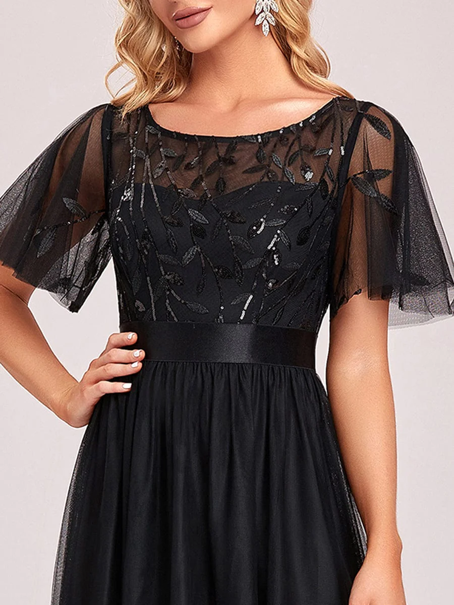 Women's A-Line Sequin Leaf Maxi Prom Dress with Sleeves