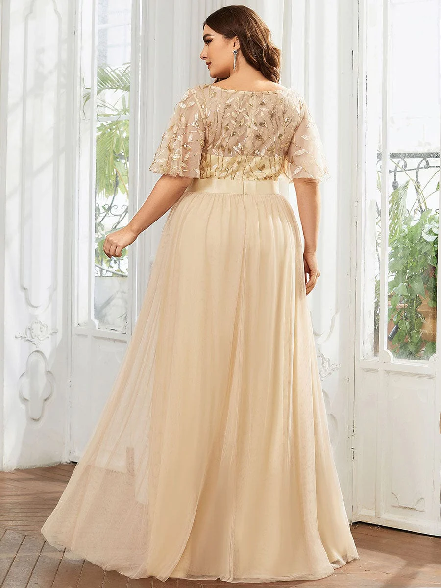 Elegant Plus Size Sequin V-Neck Long Sleeve Evening Gown with High Slit