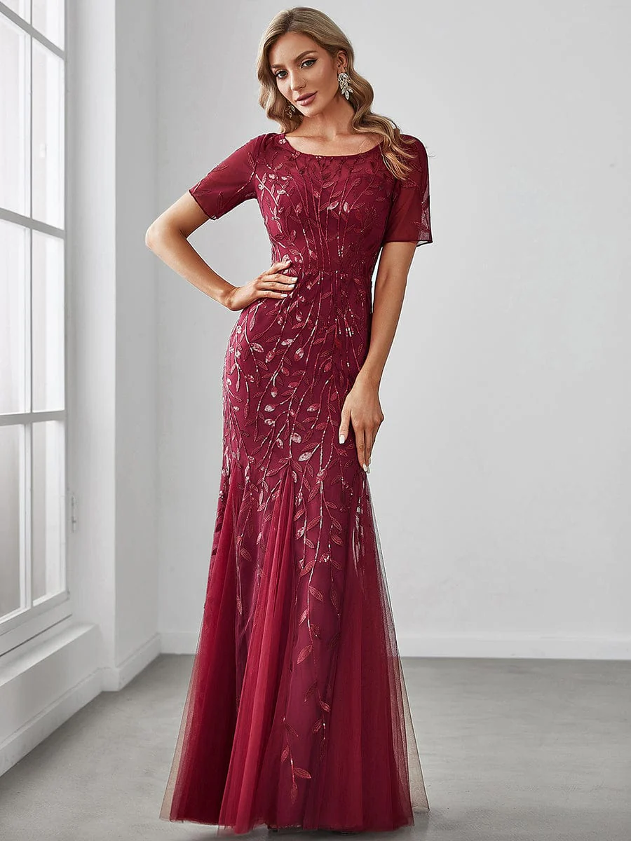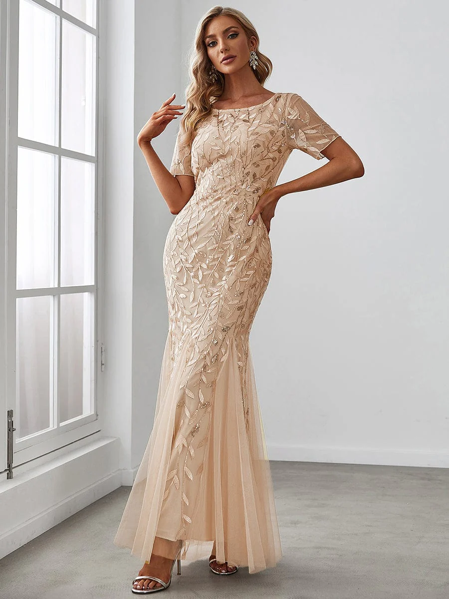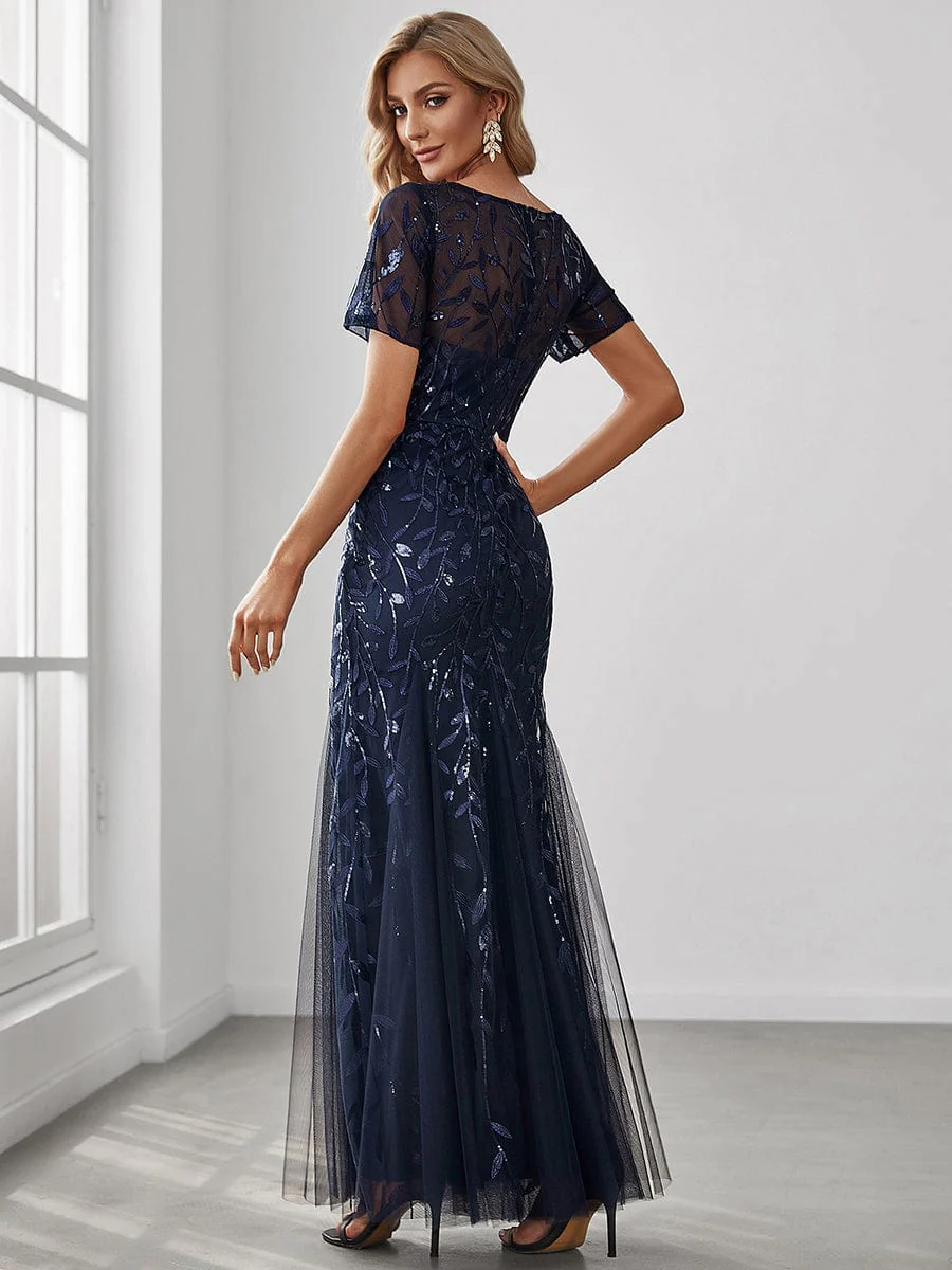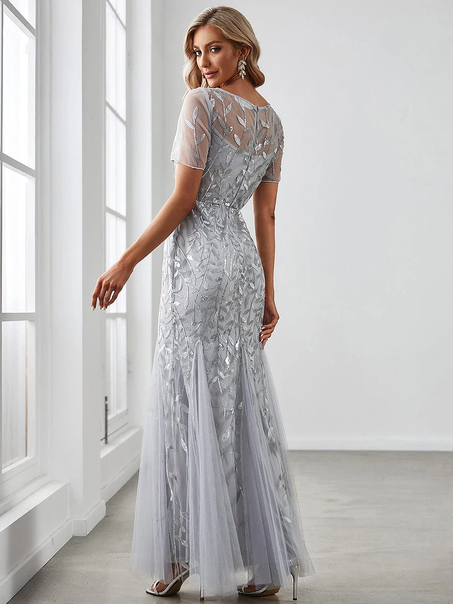 Floral Sequin Maxi Fishtail Tulle Prom Dress with Short Sleeve