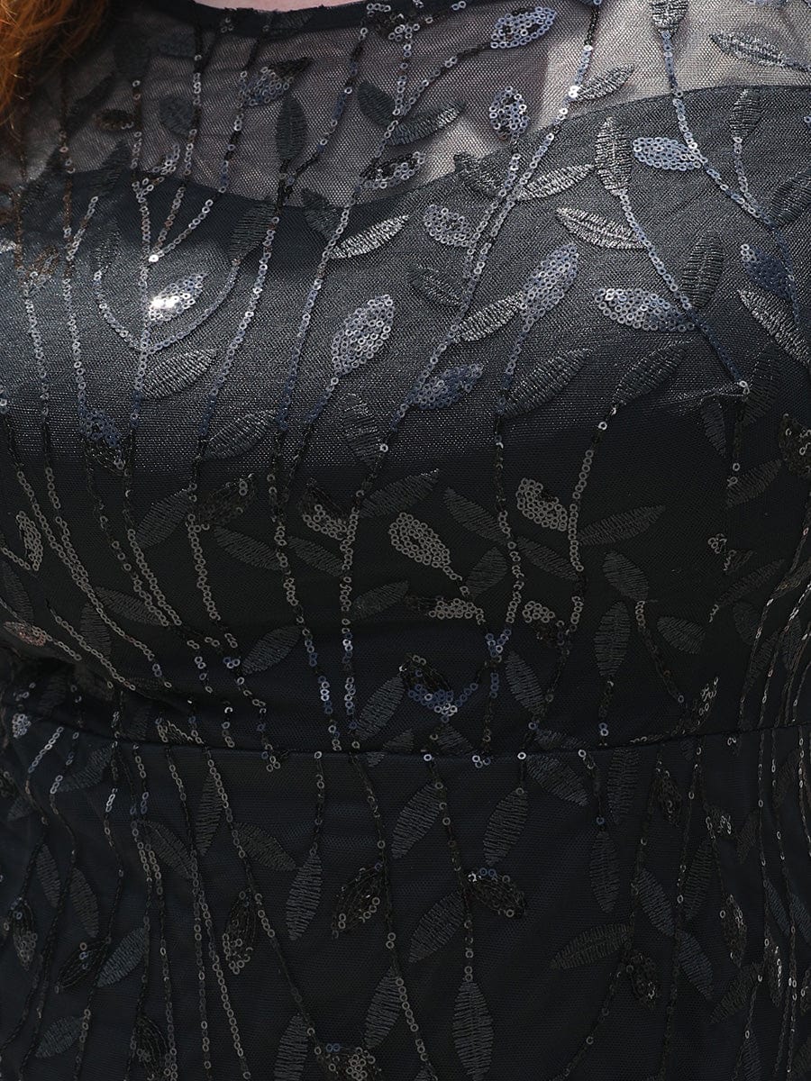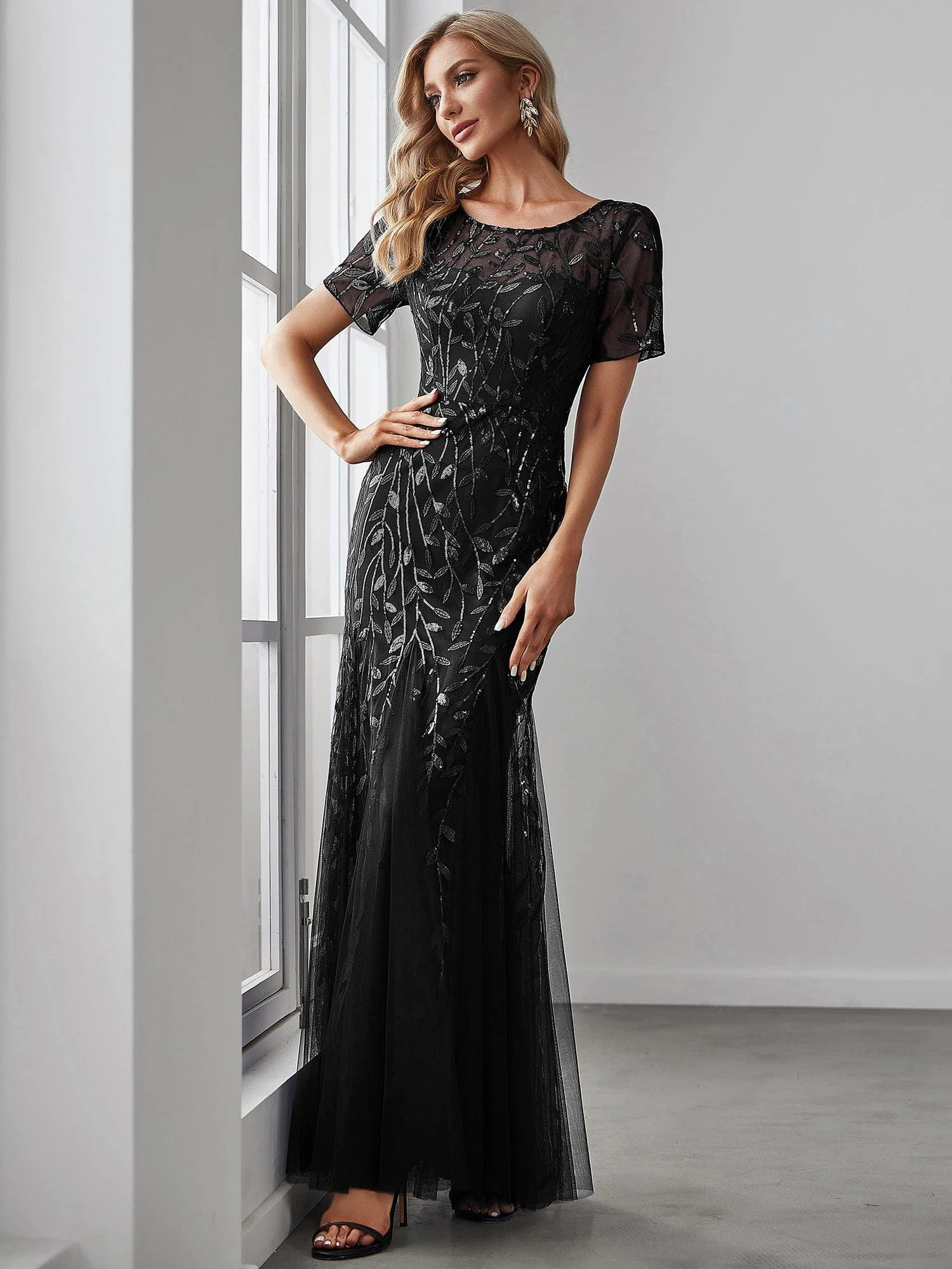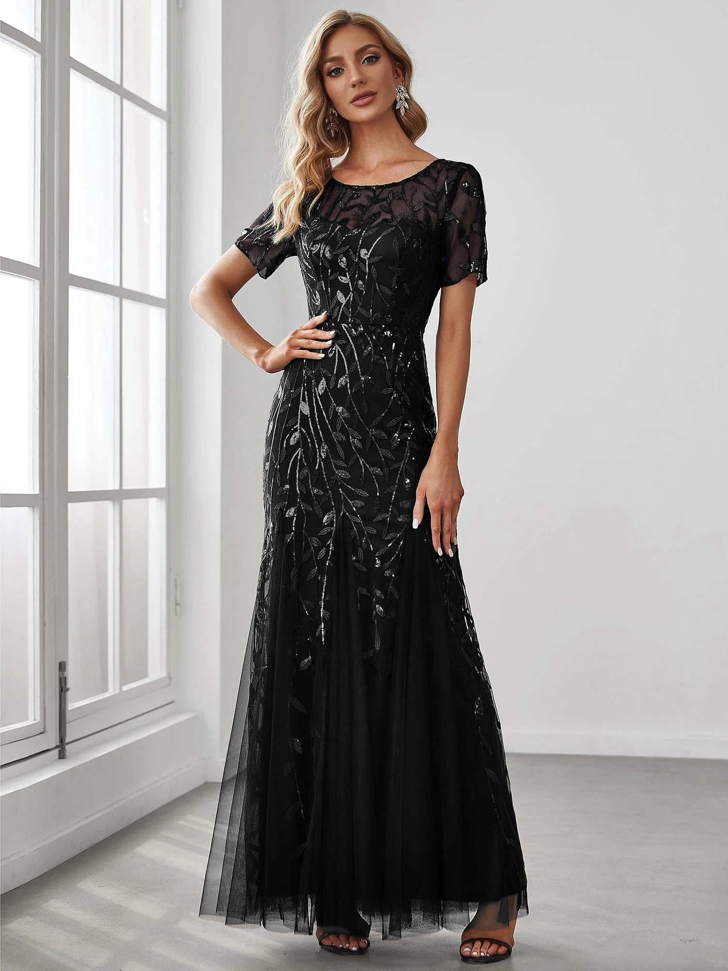 Floral Sequin Maxi Fishtail Tulle Prom Dress with Short Sleeve