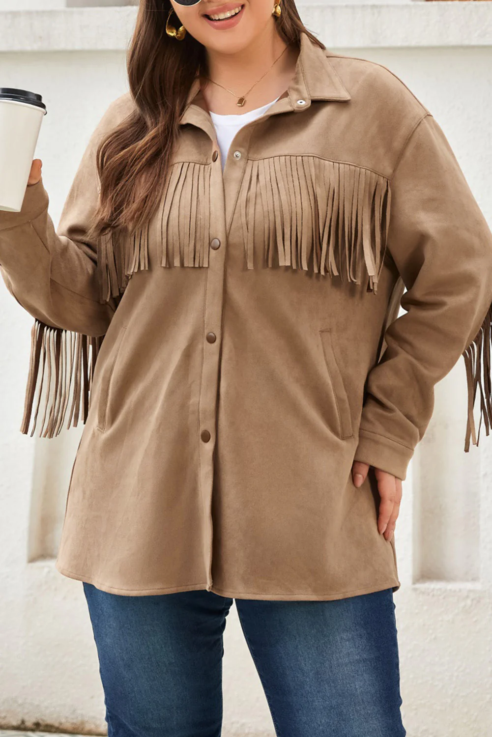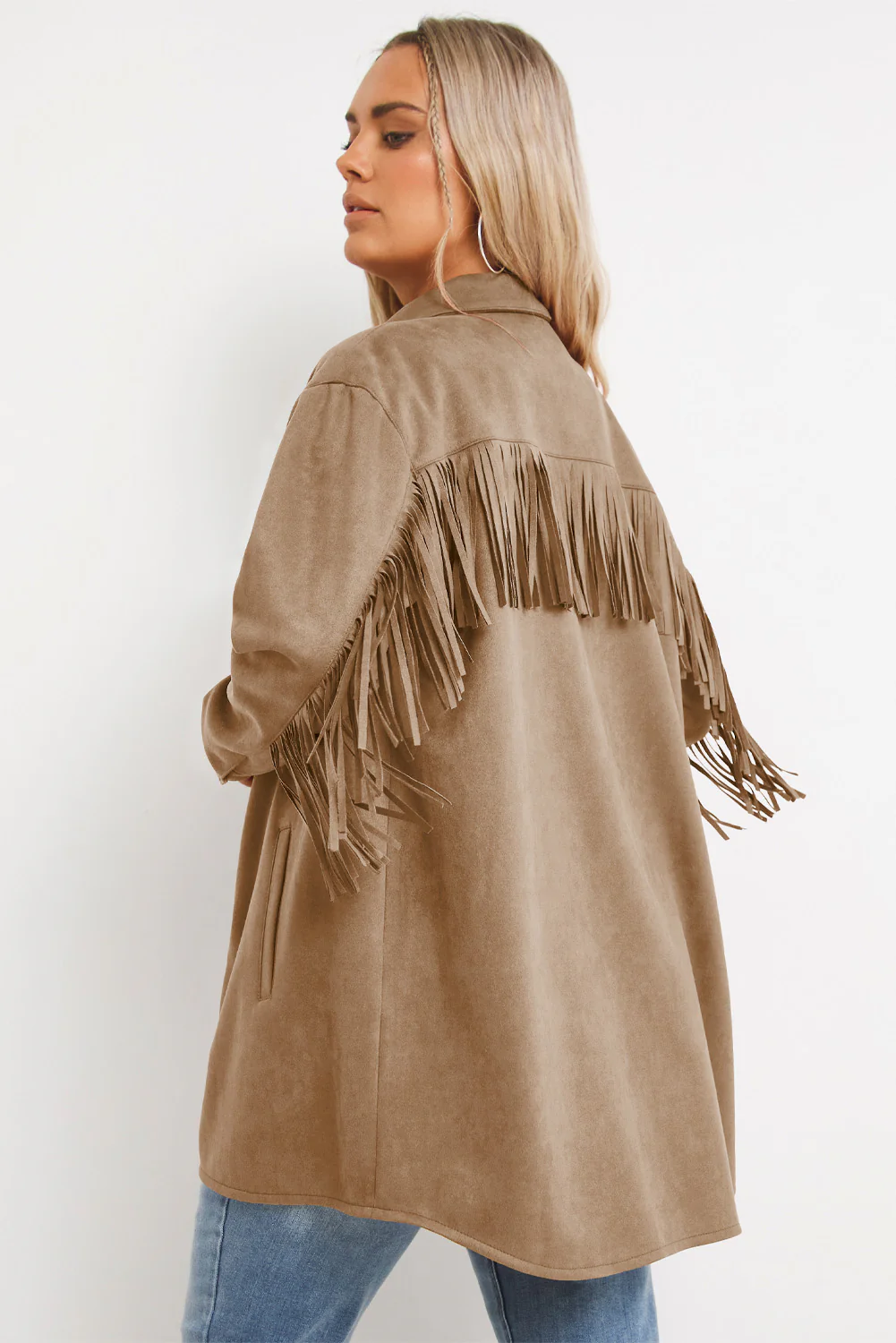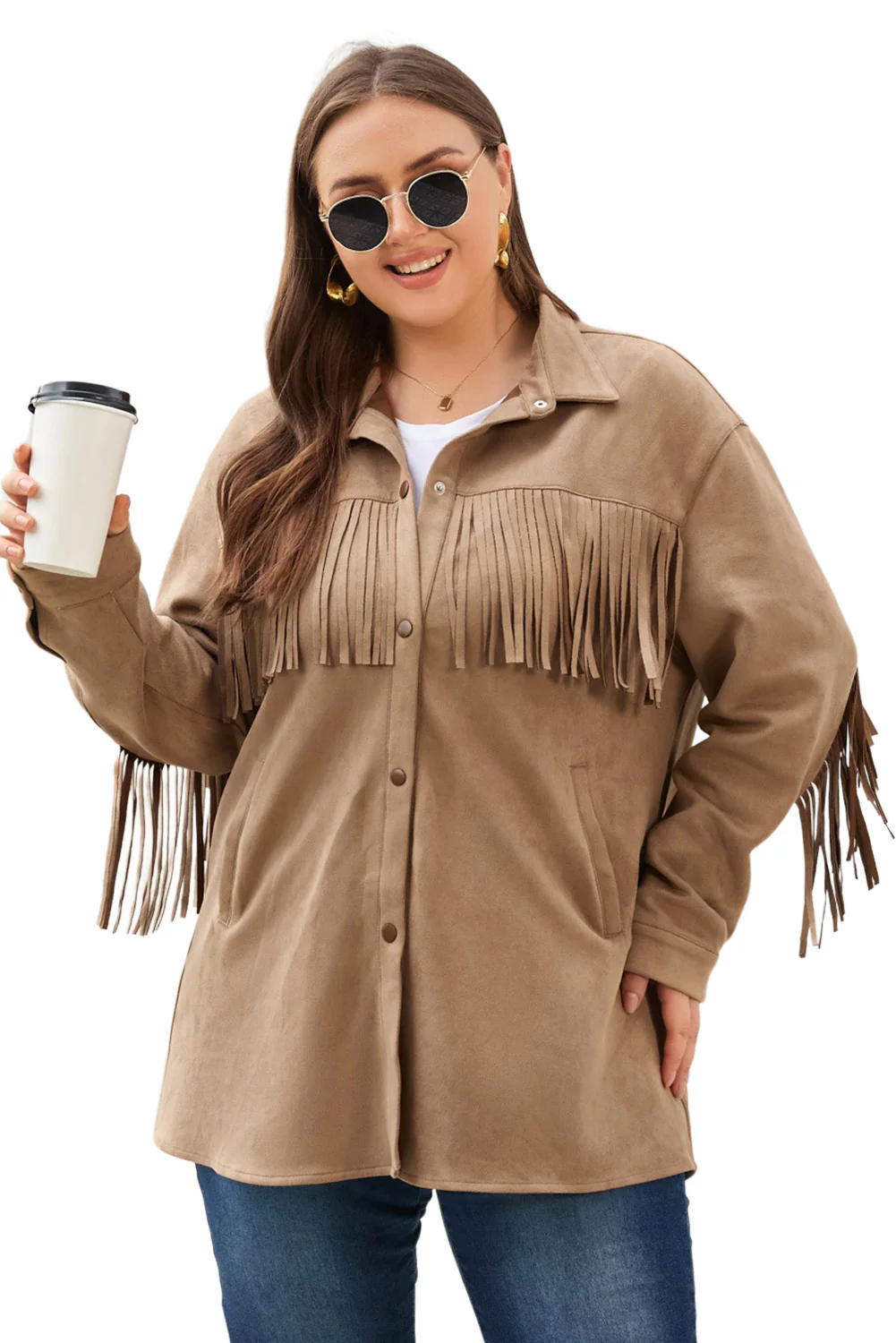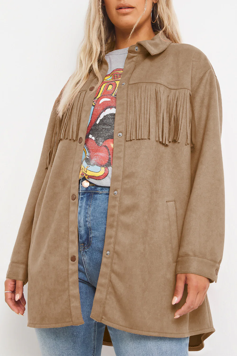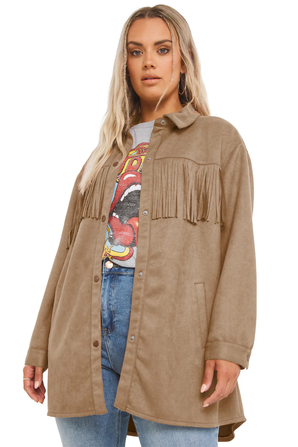 Khaki Suede Shacket with Fringe Detail for Plus Size Women