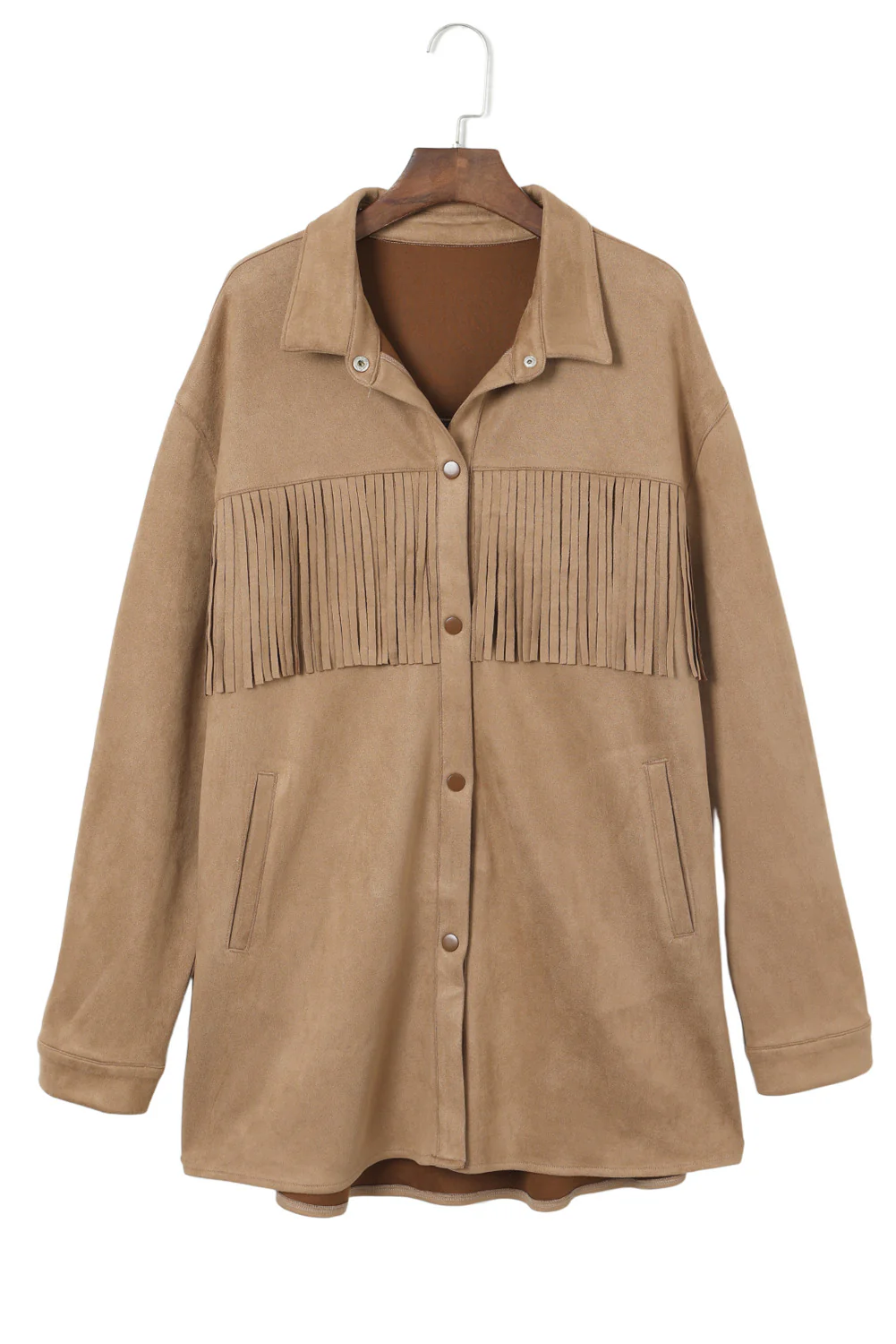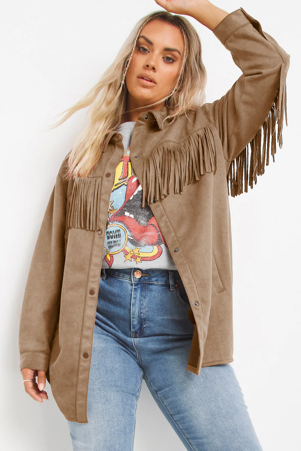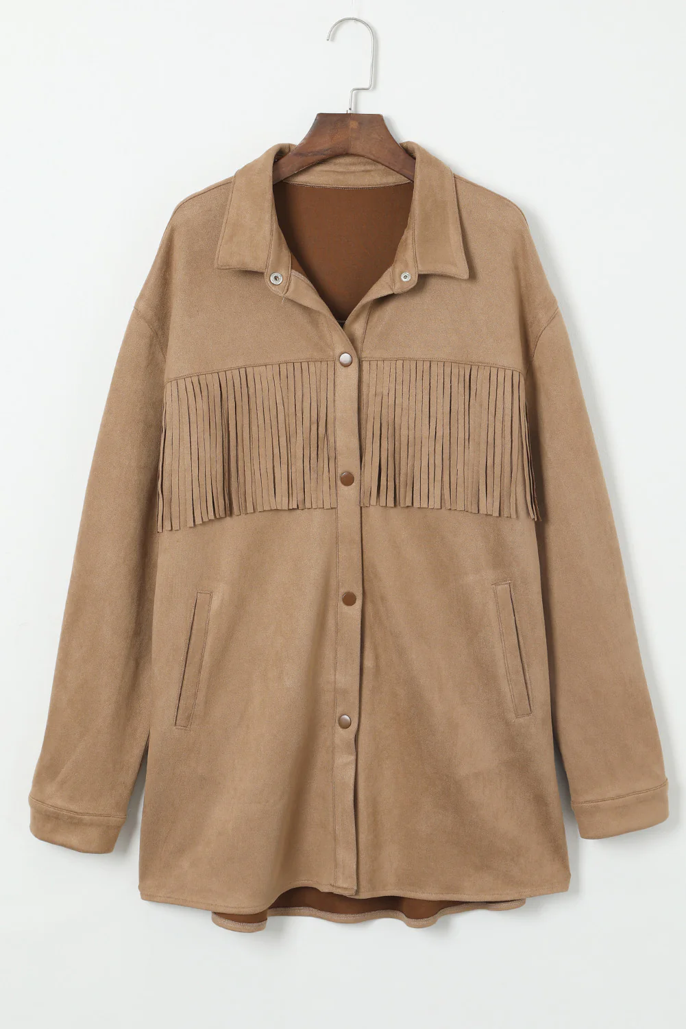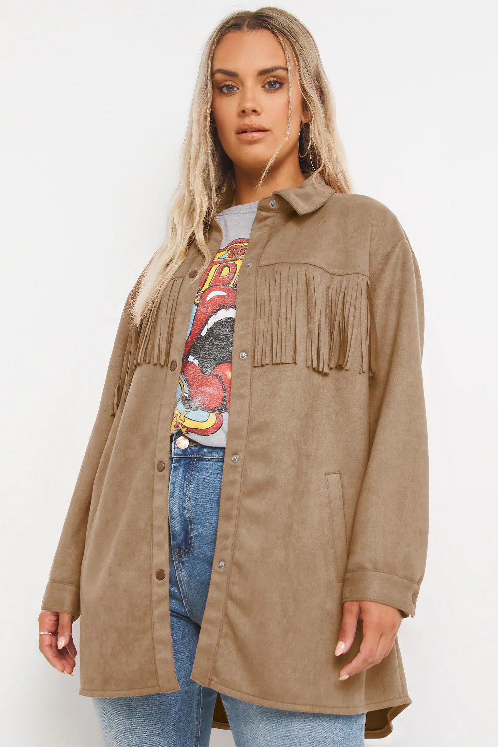 Khaki Suede Shacket with Fringe Detail for Plus Size Women
