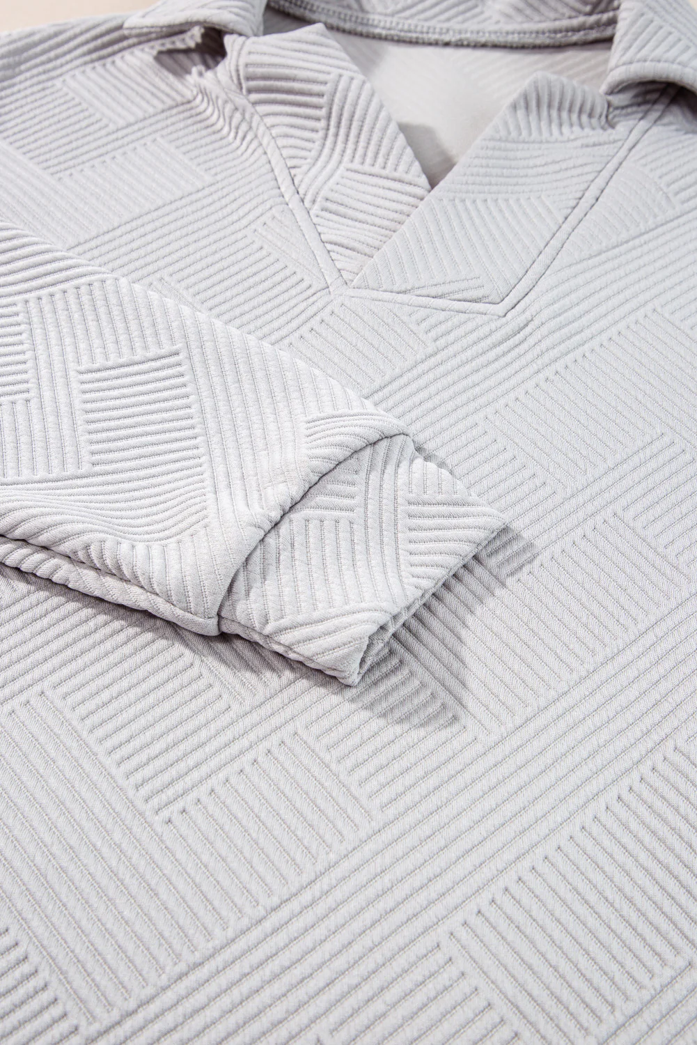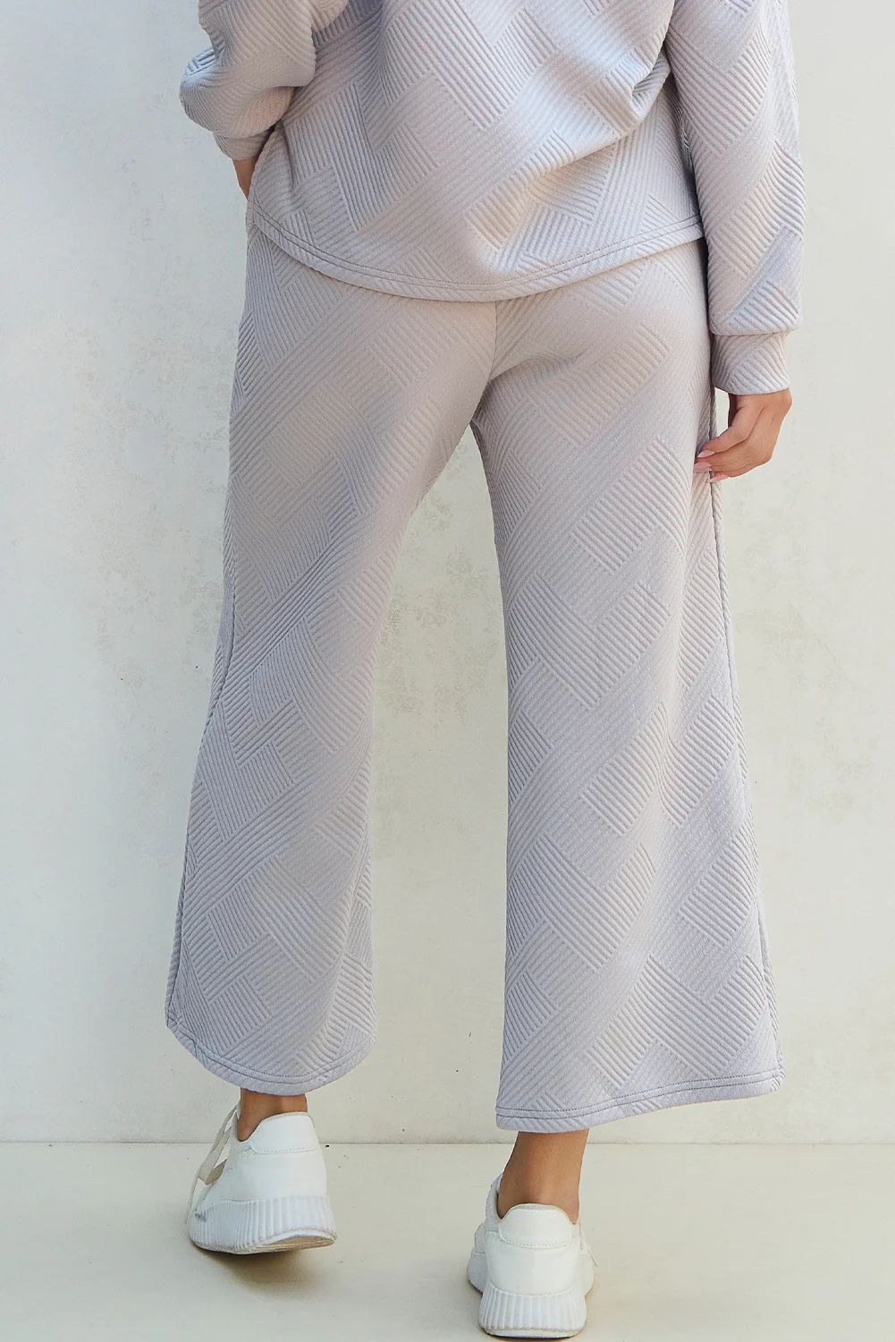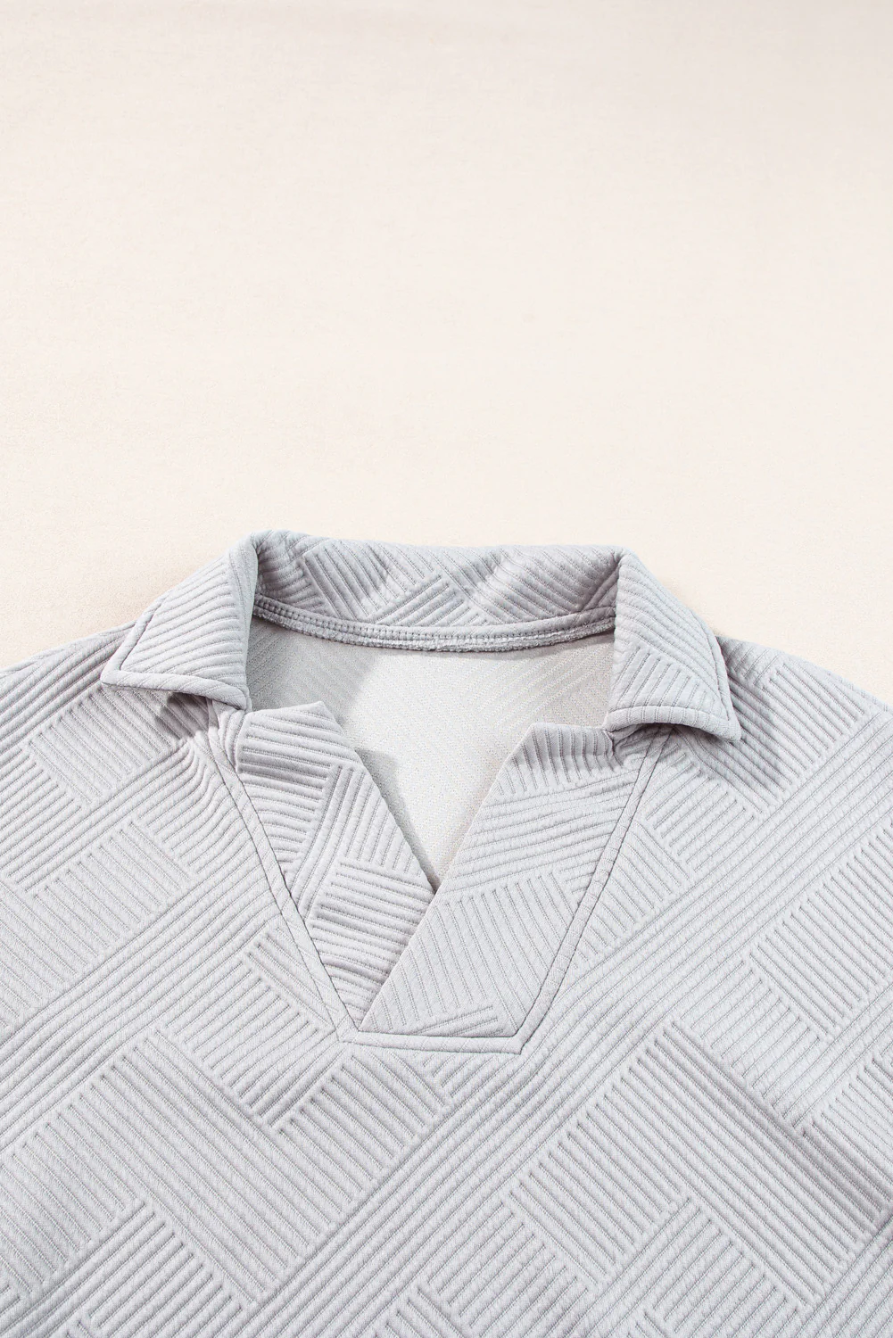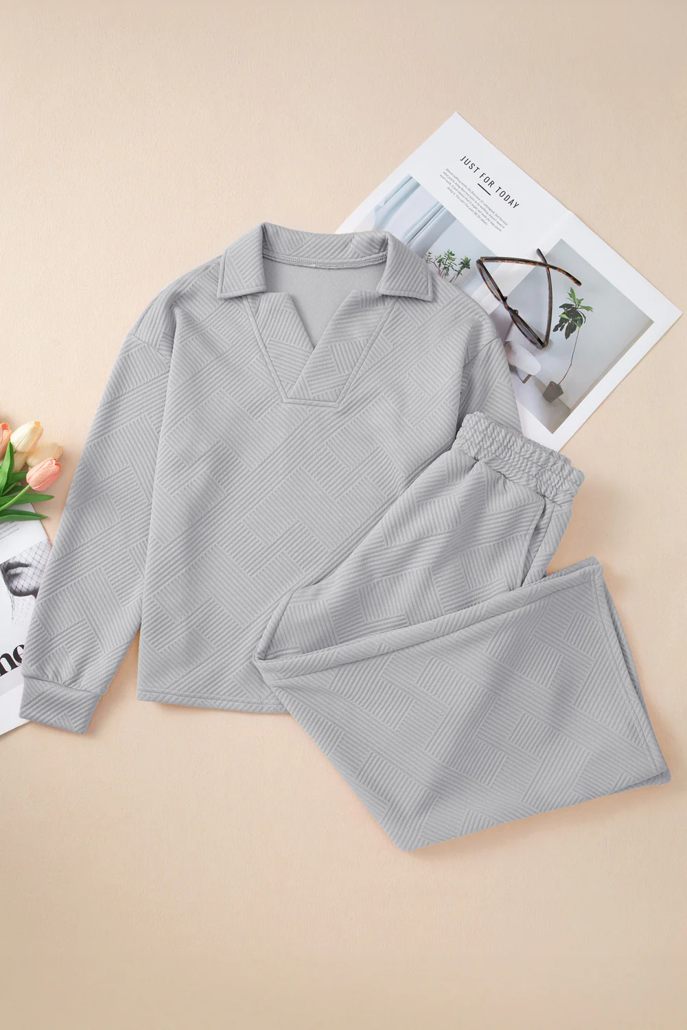 Light Grey Solid Textured Collared V Neck Top and Wide Leg Pants Set