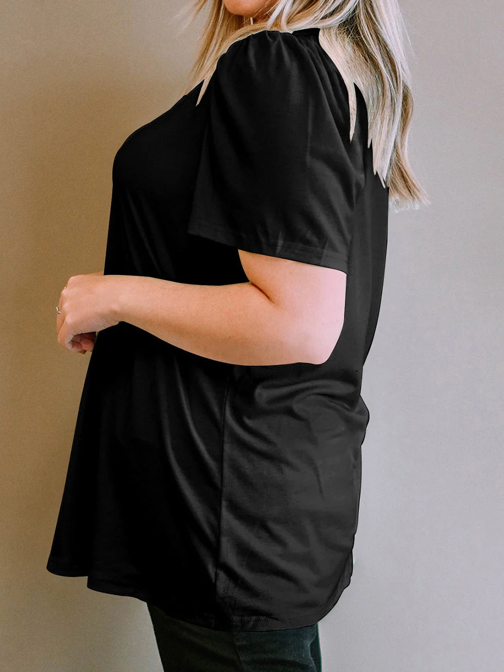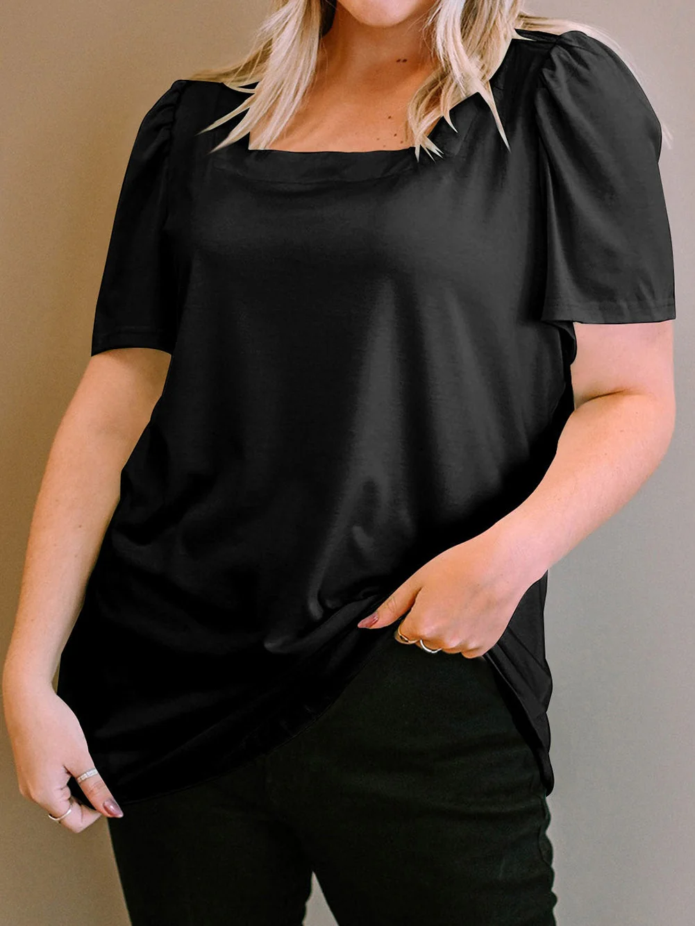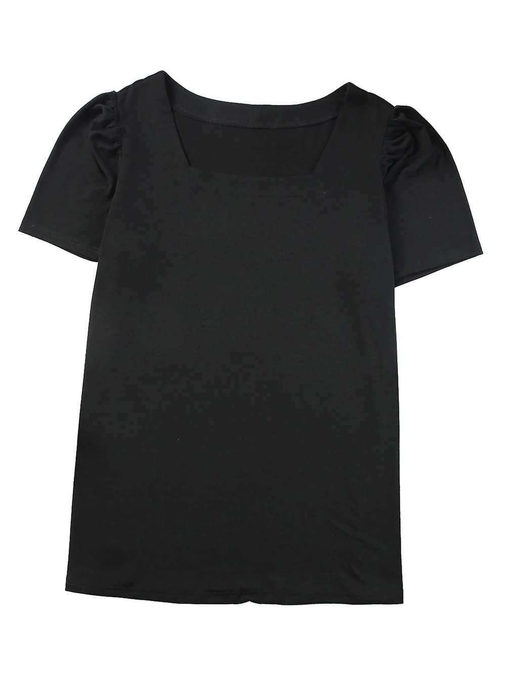 Black Plus Size Square Neck Ruched Shoulder Short Sleeve Top
