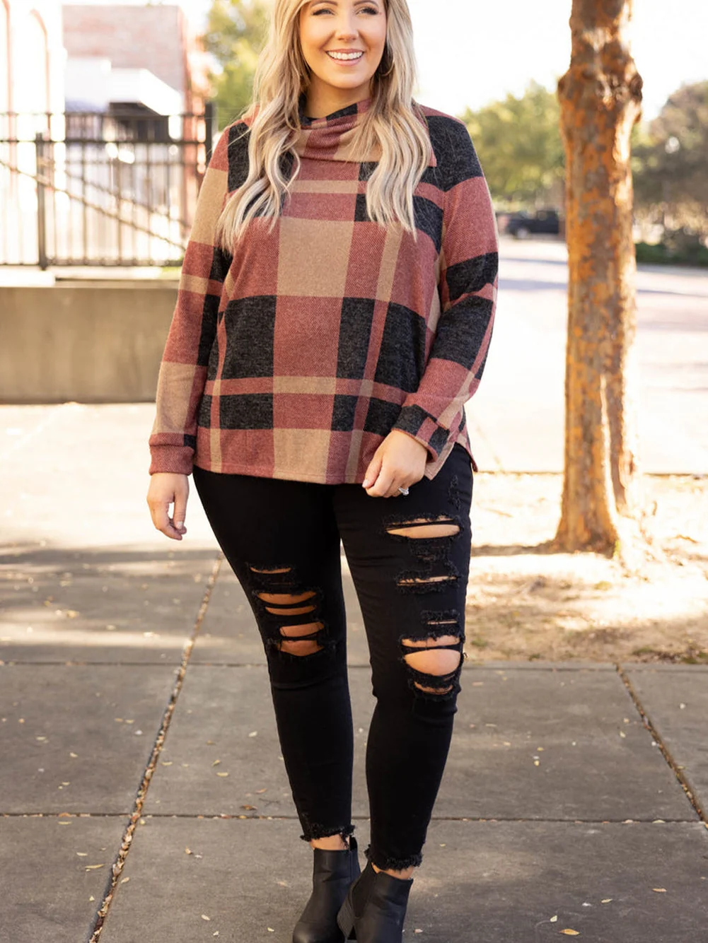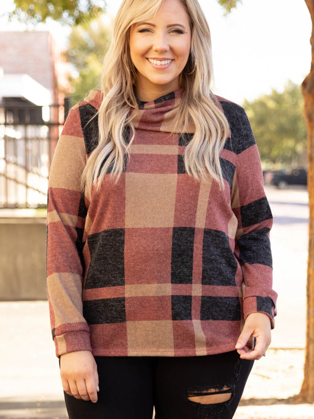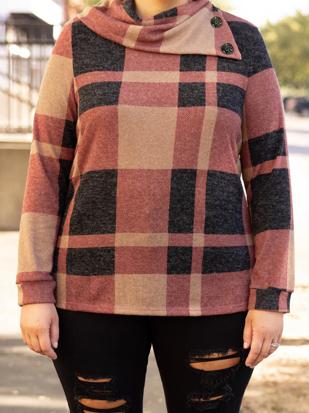 Mineral Red Geometric Print Plus Size Long Sleeve Collared Top