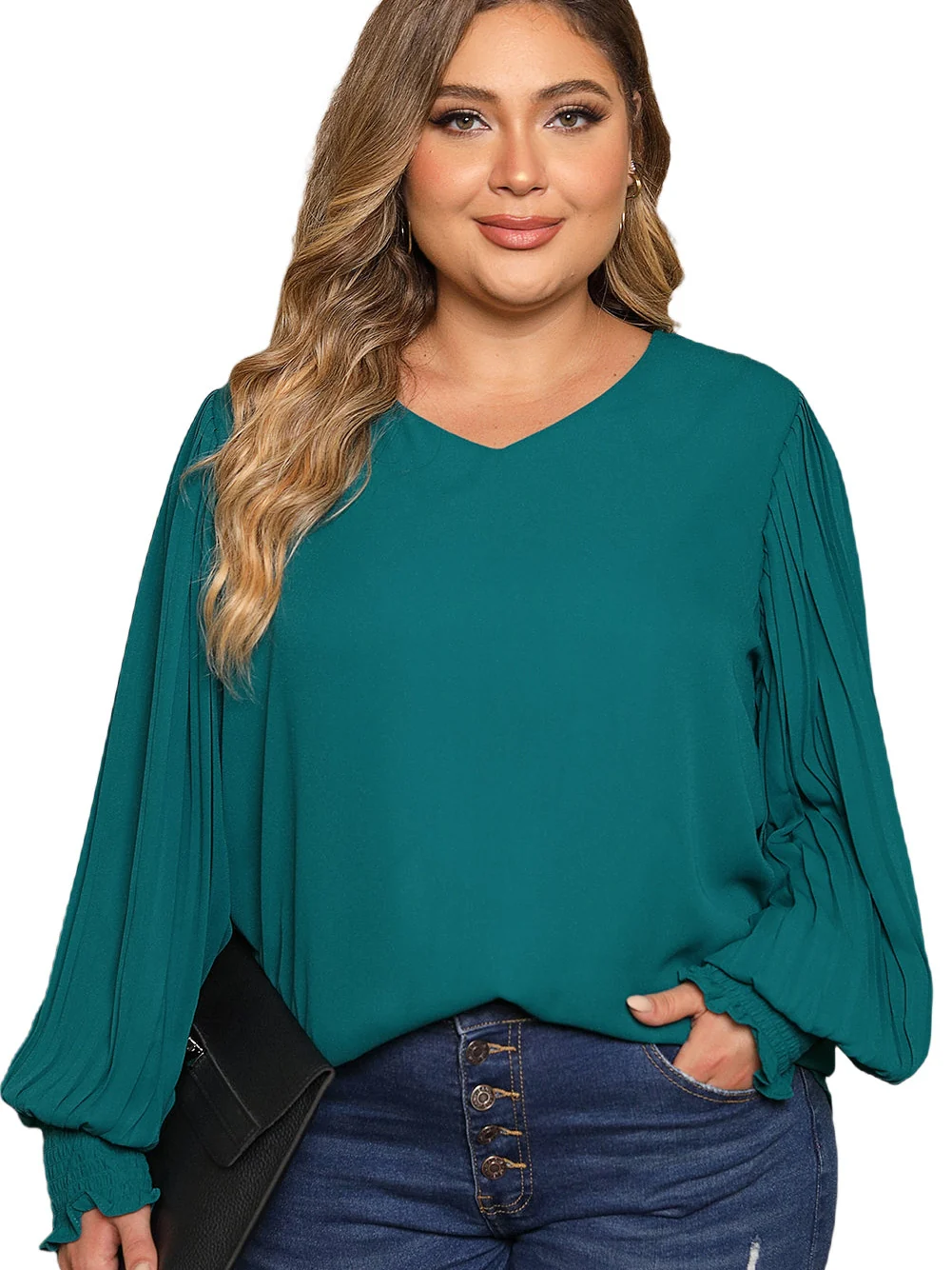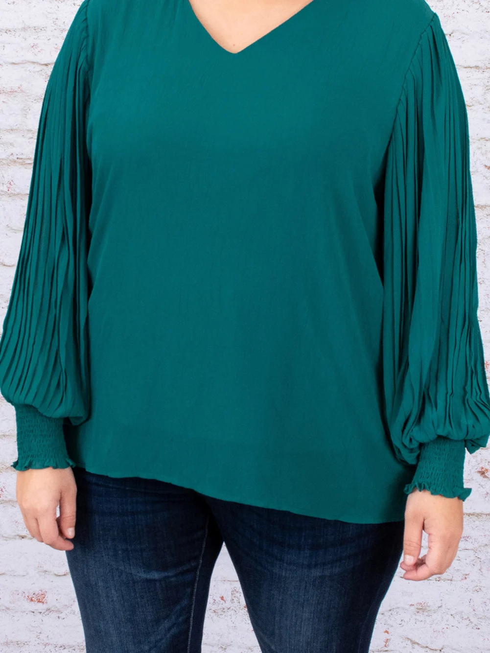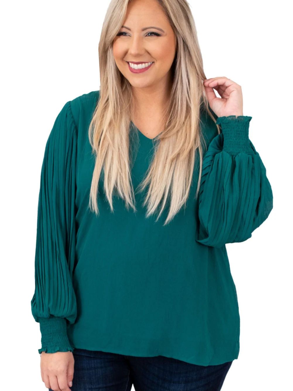 Green Pleated Bubble Sleeve Plus Size Blouse