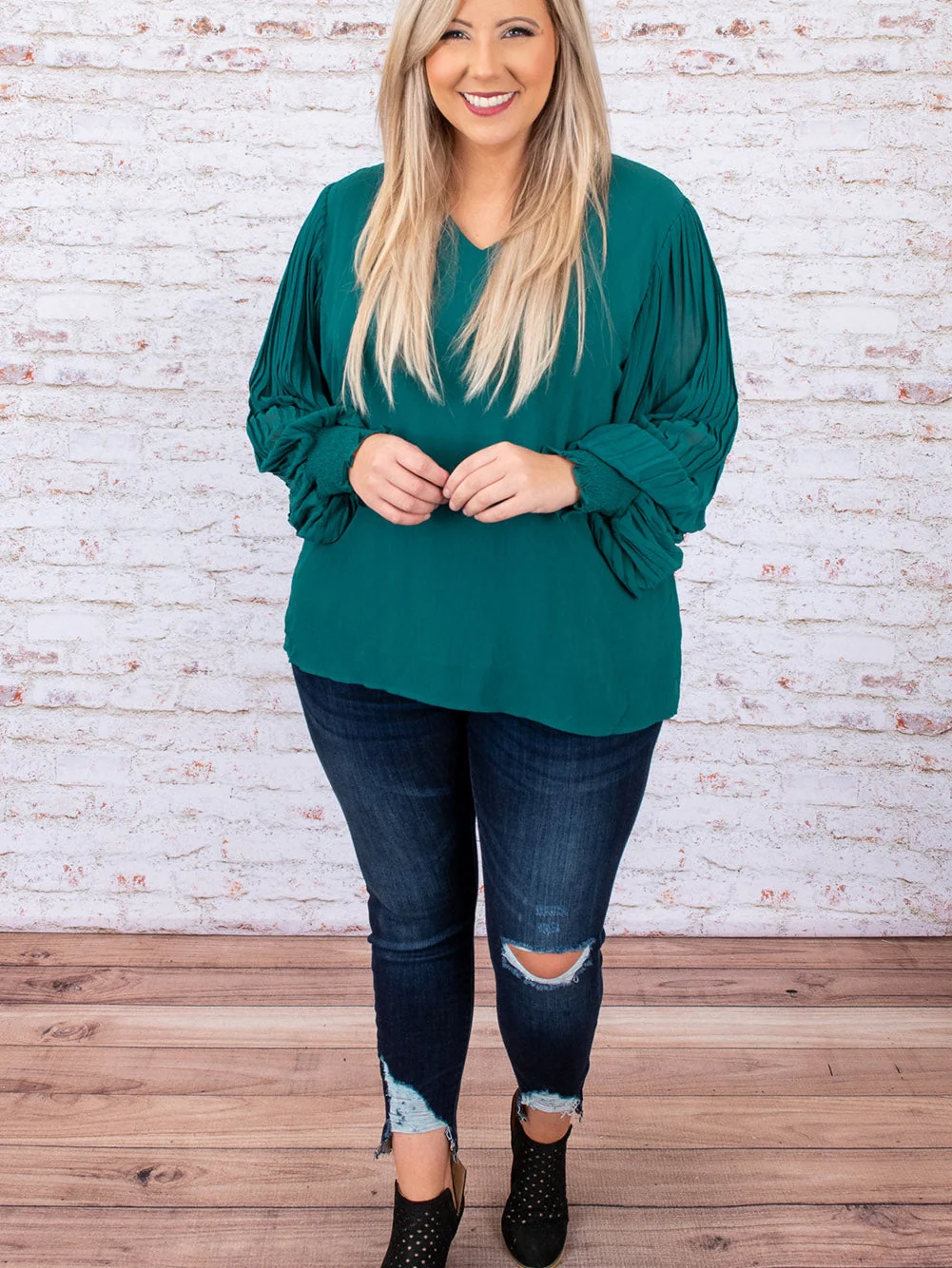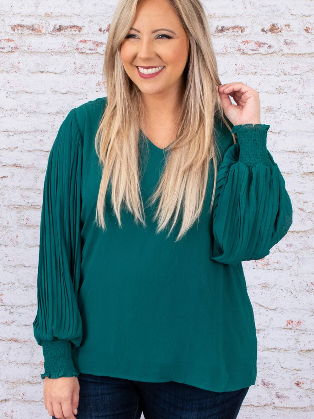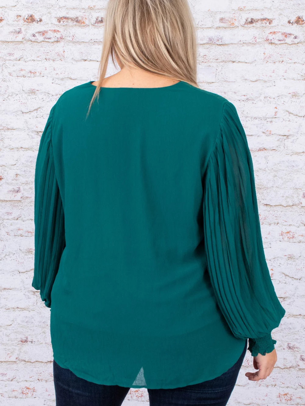 Green Pleated Bubble Sleeve Plus Size Blouse