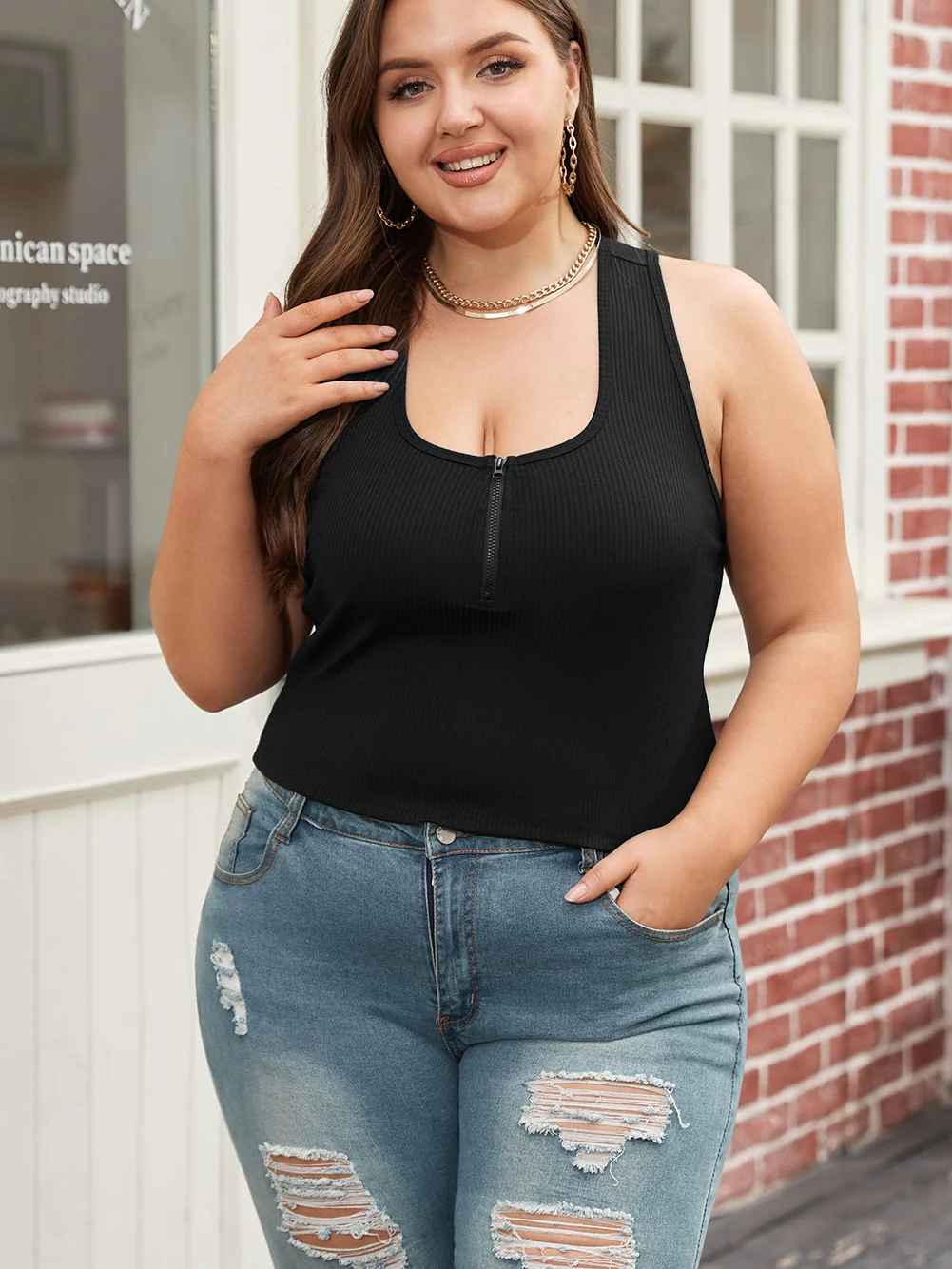 Black Zipper Front Racerback Tank Top for Plus Size Women