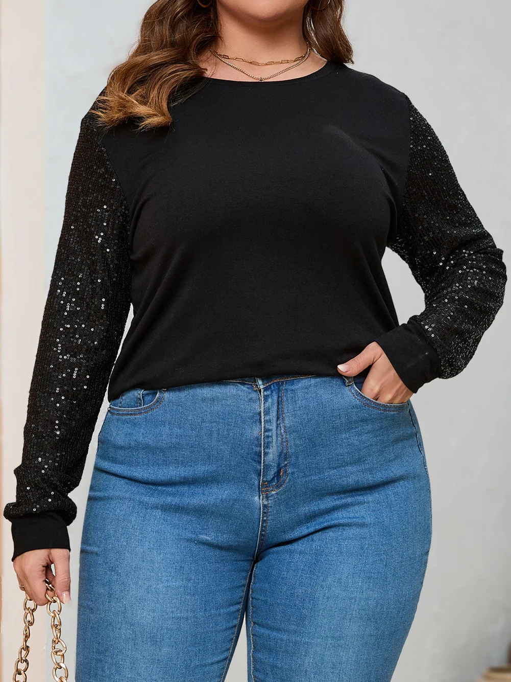 Black Sequin Contrast Long Sleeve Plus Size Top