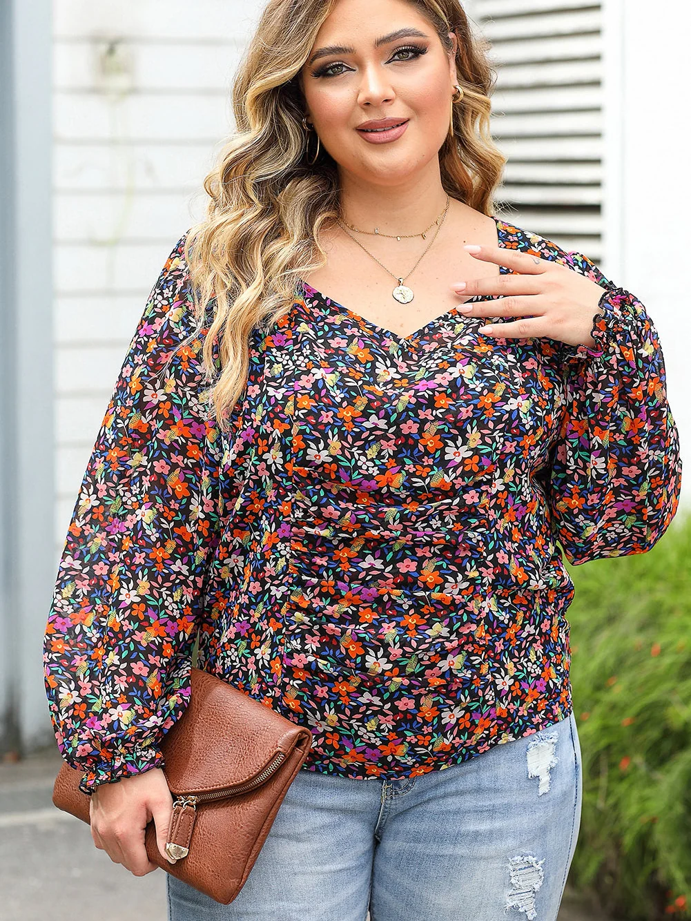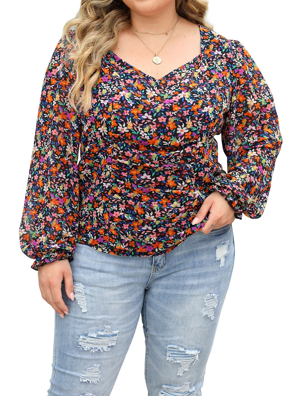 Black Plus Size V Neck Bubble Sleeve Floral Blouse