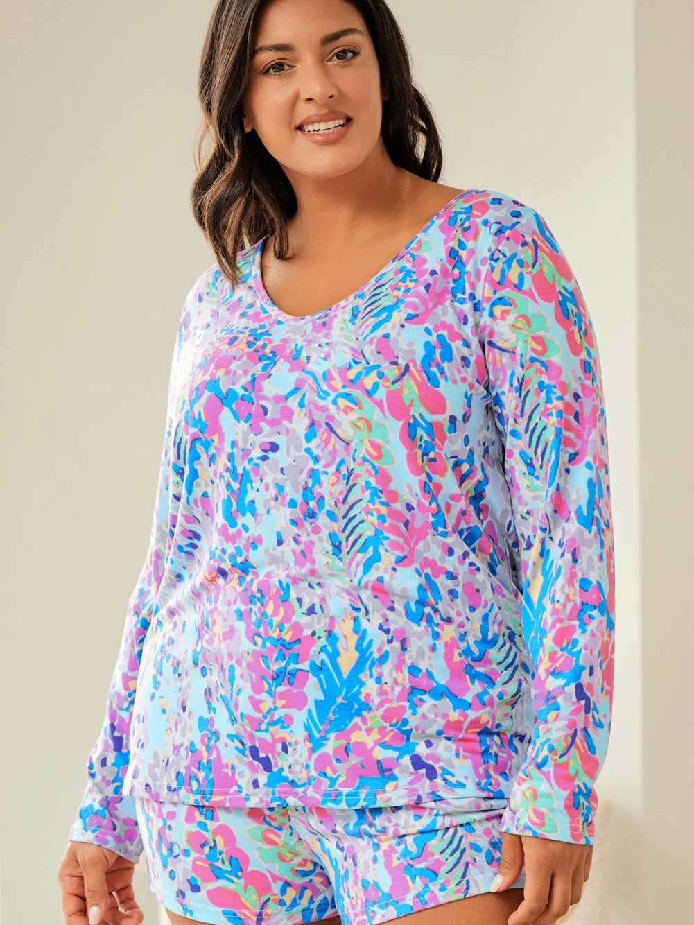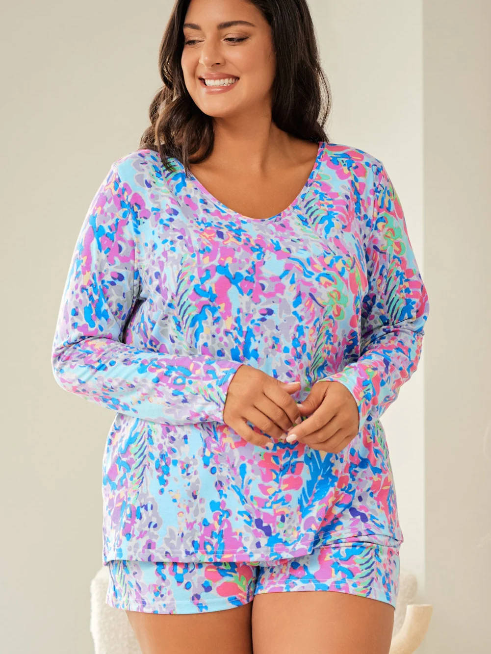 Sky Blue Plus Size Floral Print Long Sleeve and Shorts Lounge Outfit