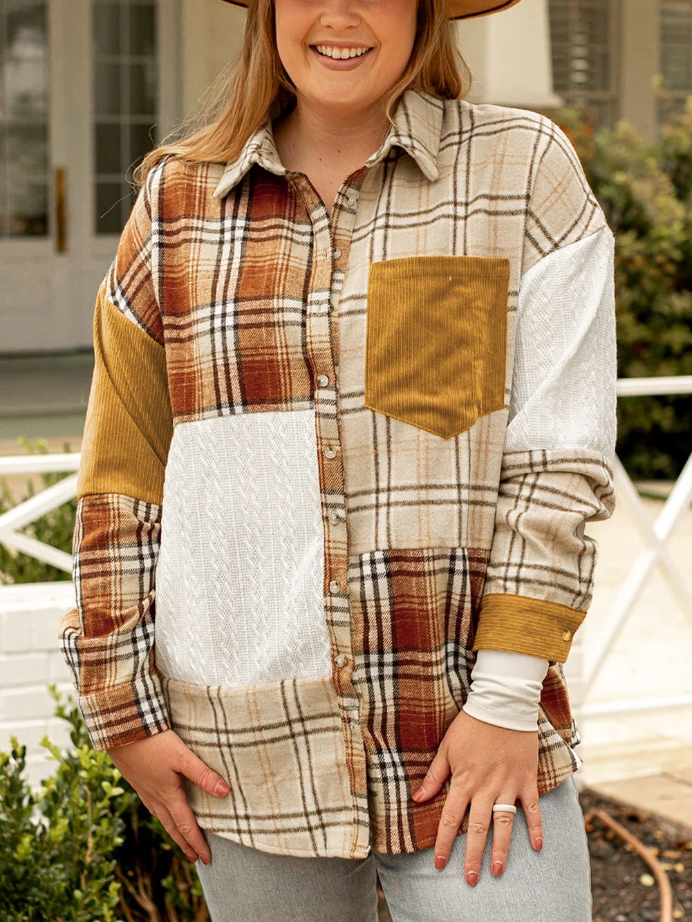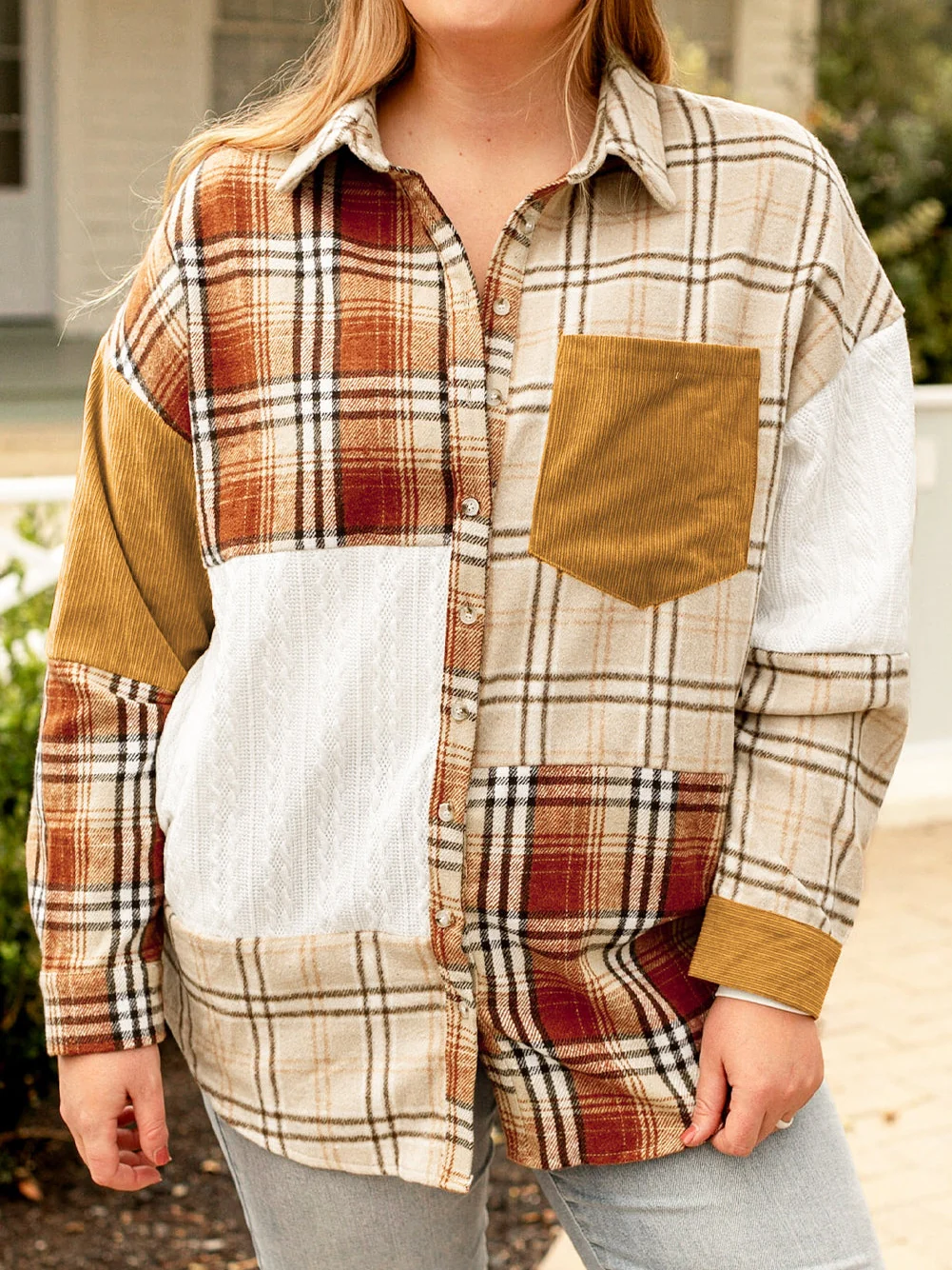 Golden Apricot Plus Size Plaid Patchwork Button up Shacket