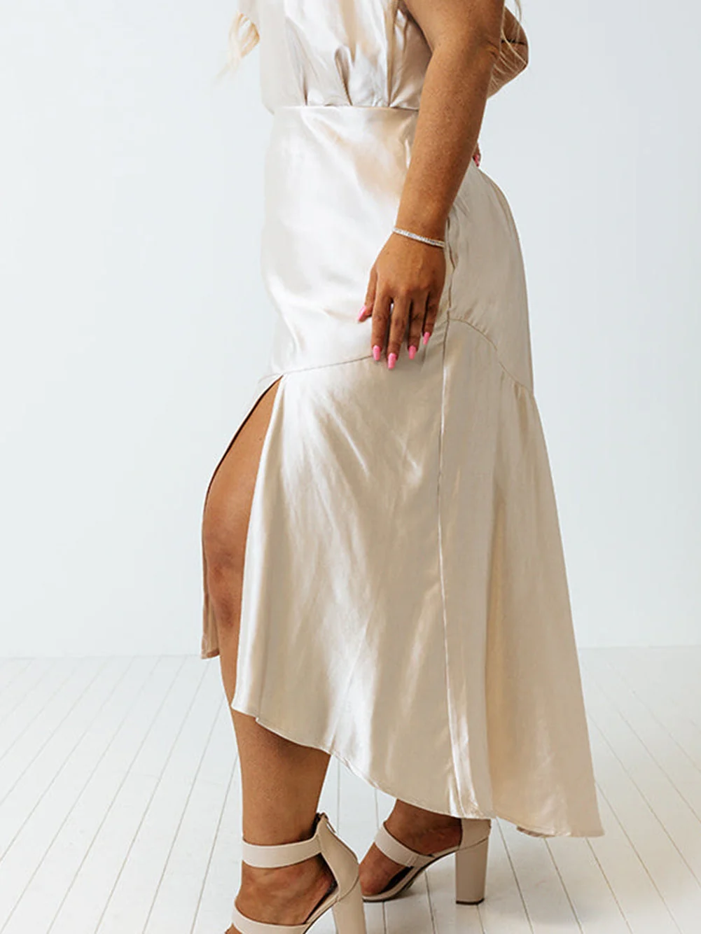 Beige Satin Split Ruffled High Waist Plus Size Skirt