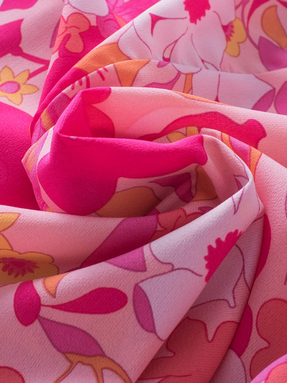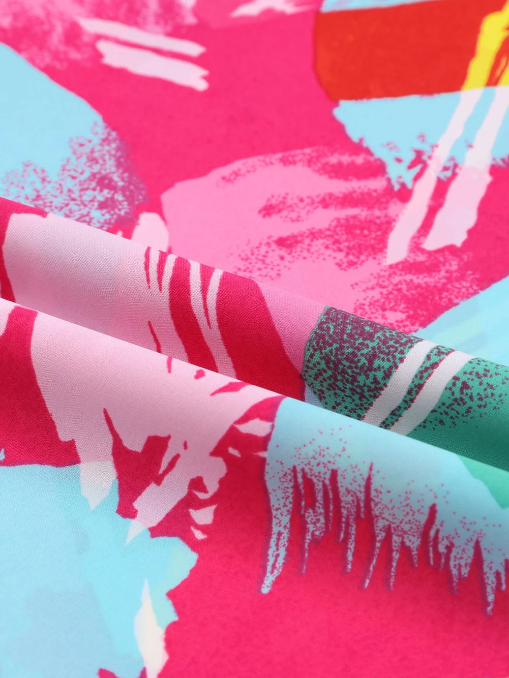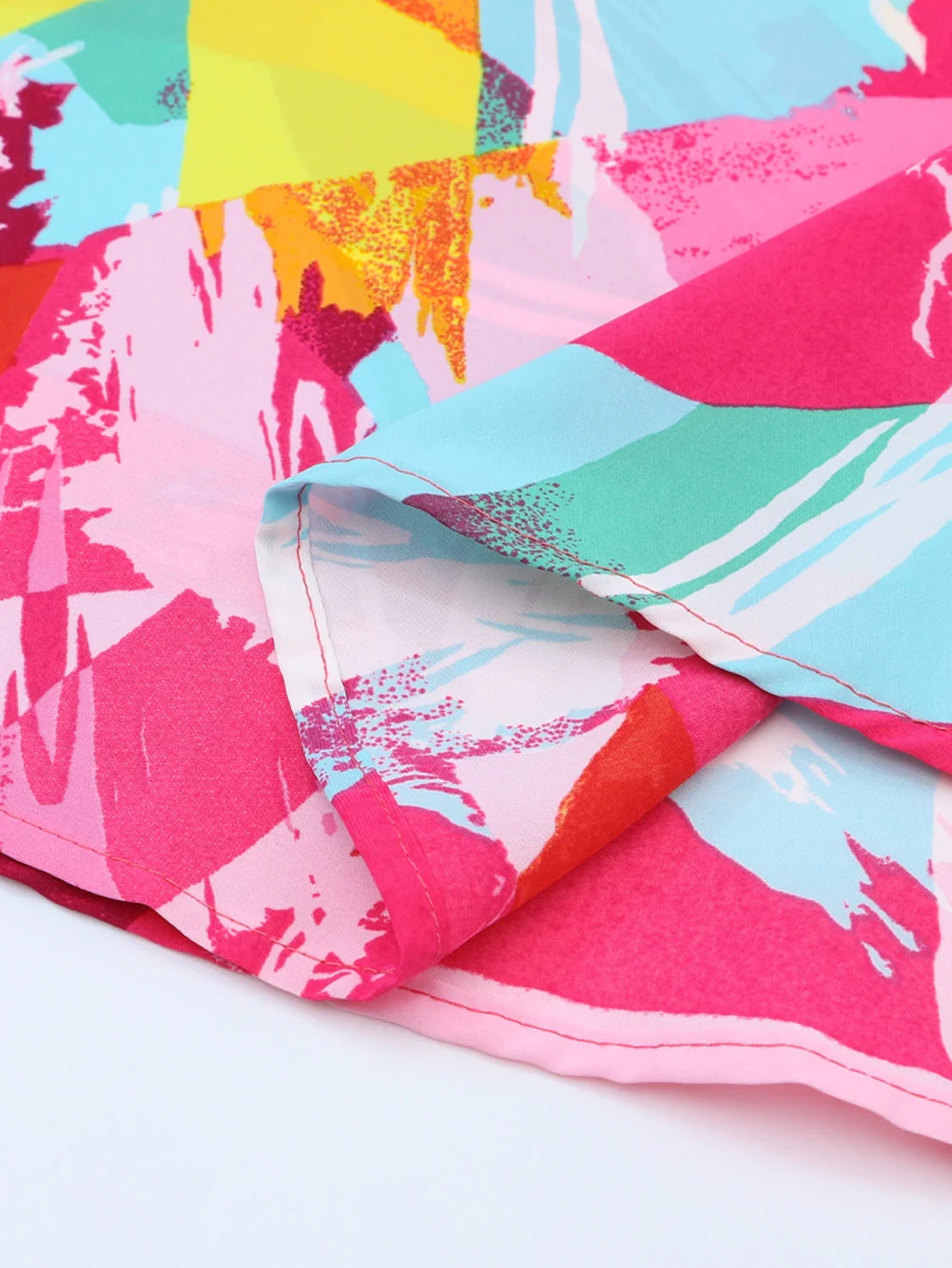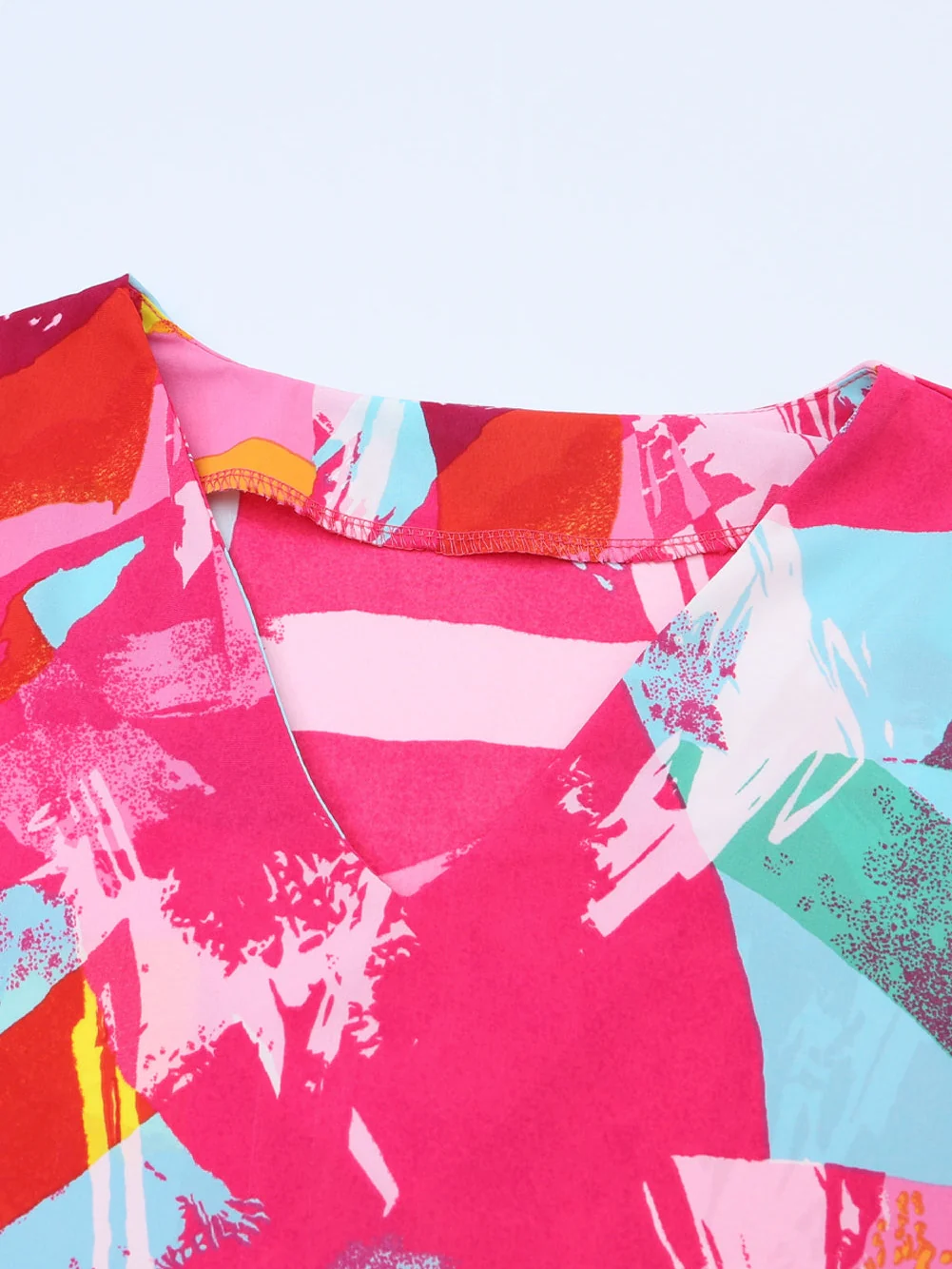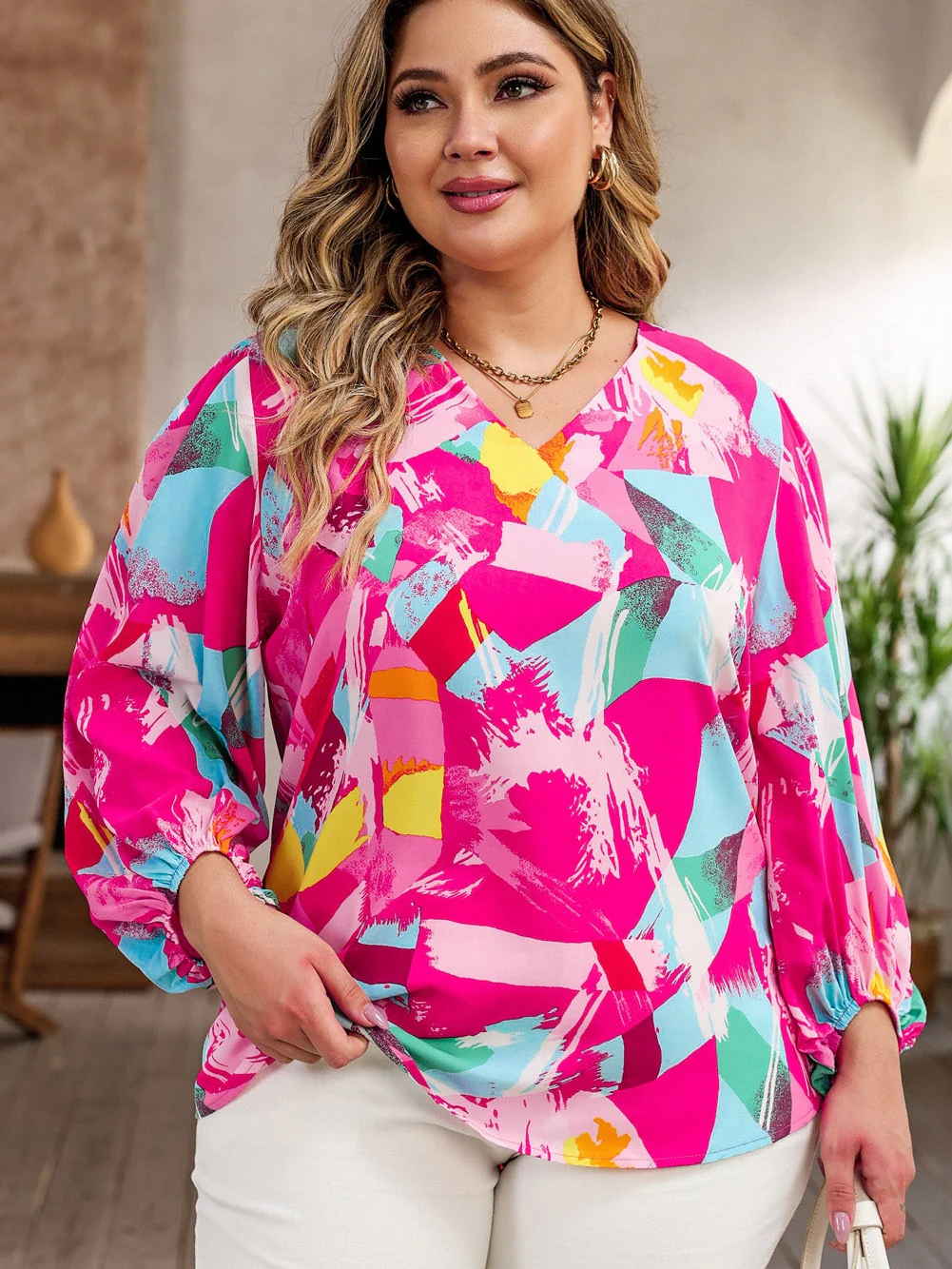 Vibrant Pink Graffiti Print Plus Size Blouse with Puff Sleeves