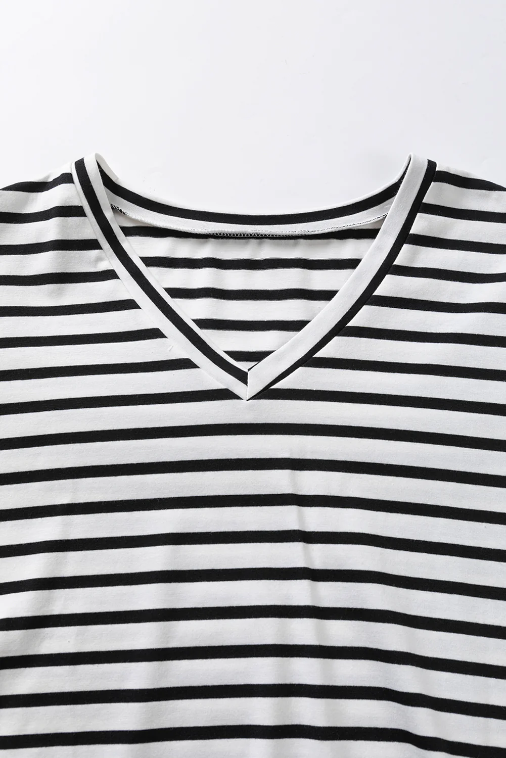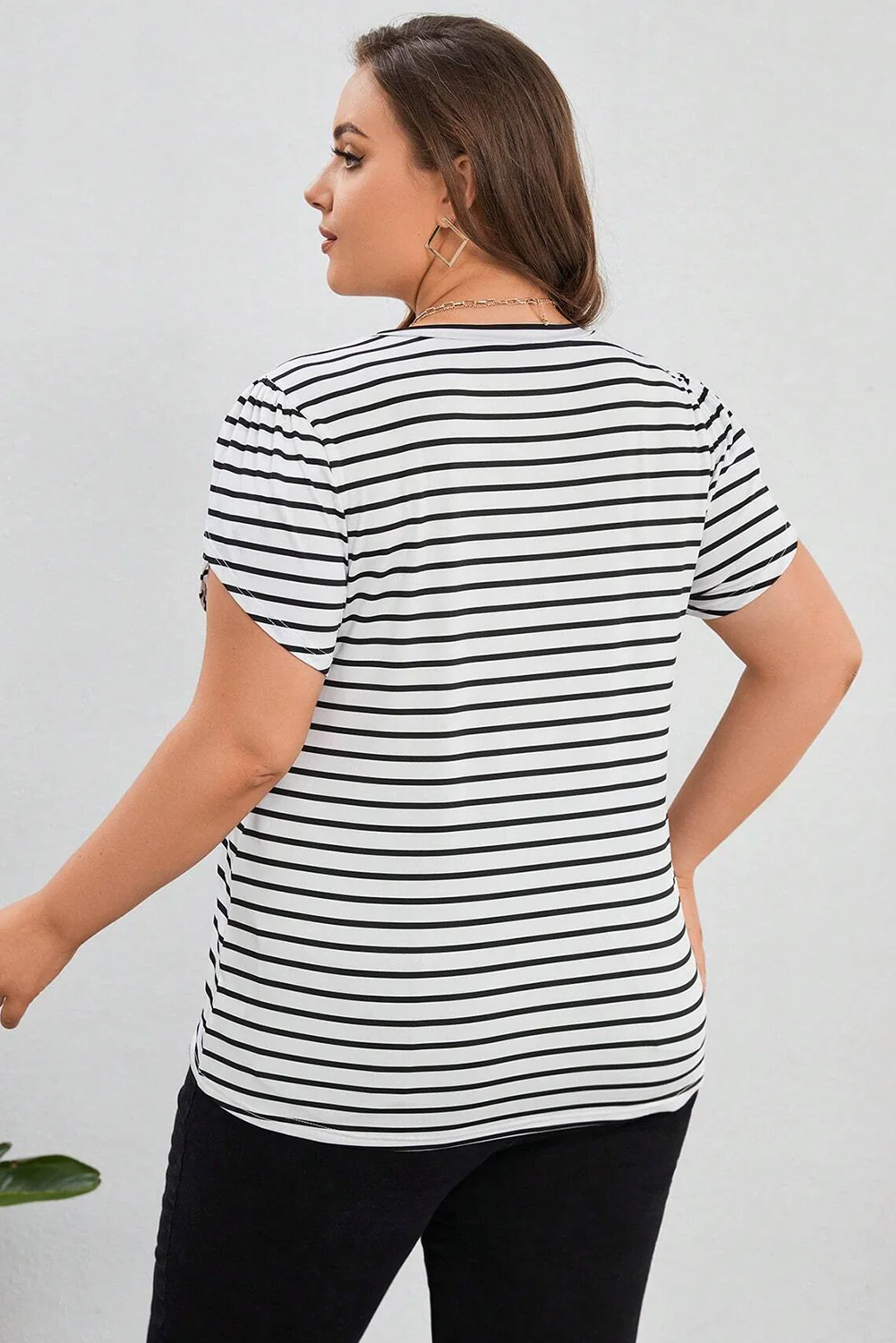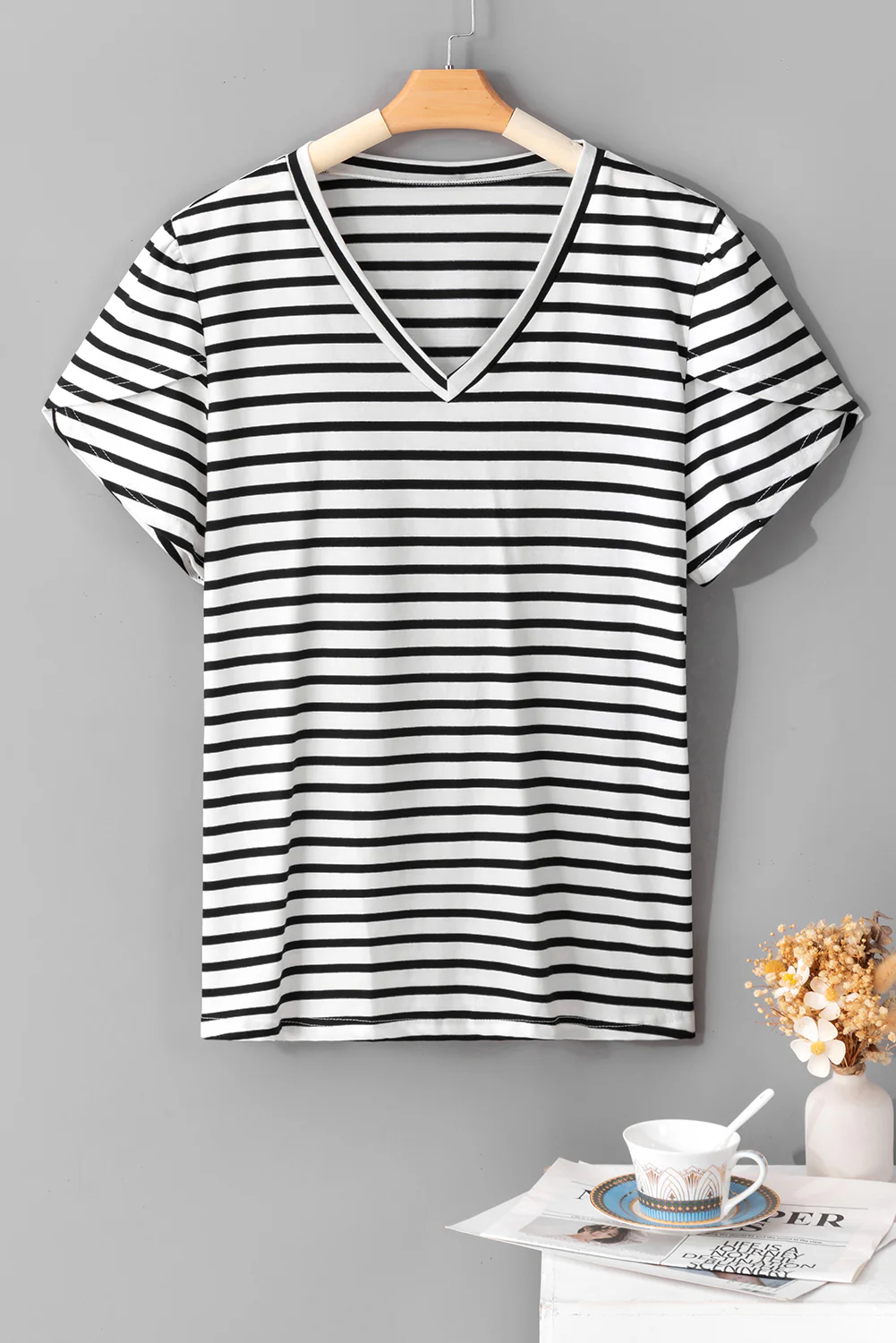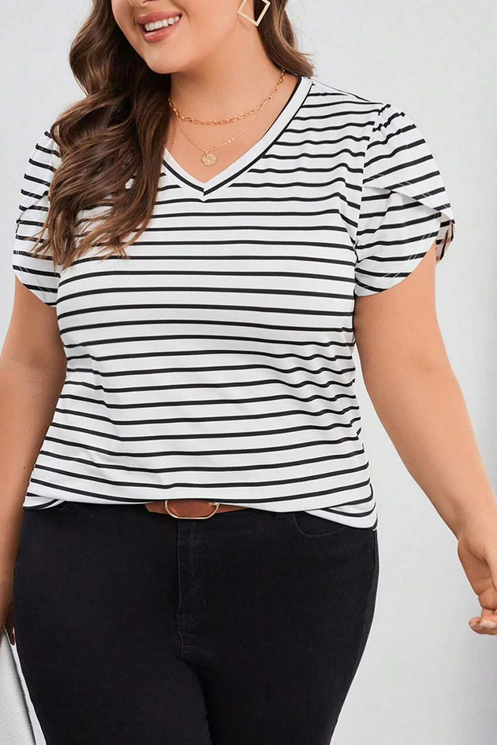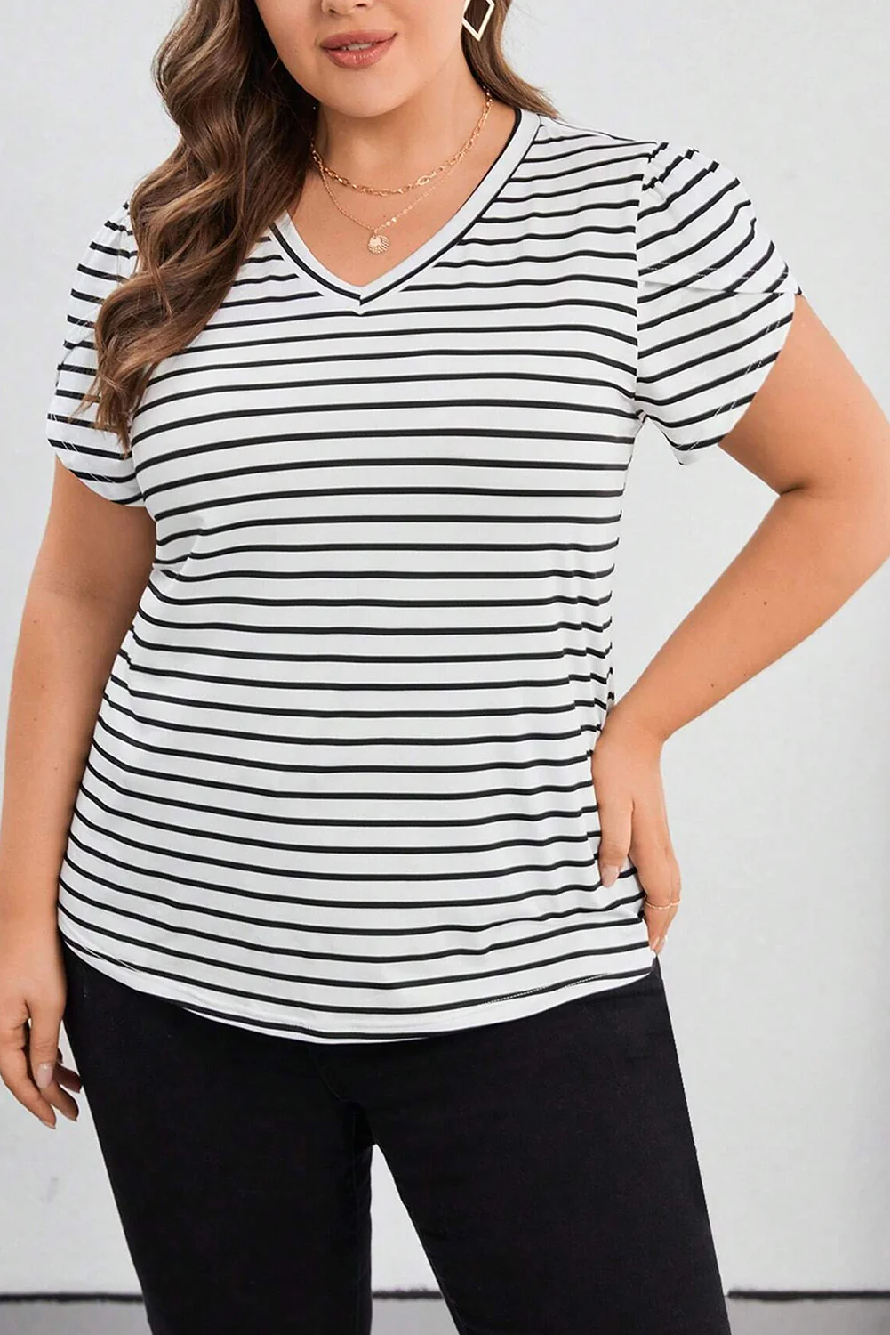 Elegant White Striped V Neck Petal Sleeve Plus Size Tee