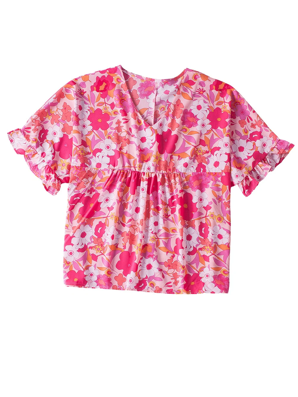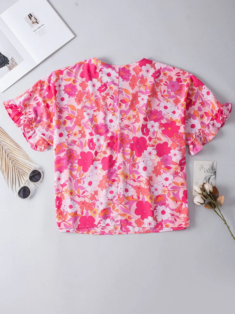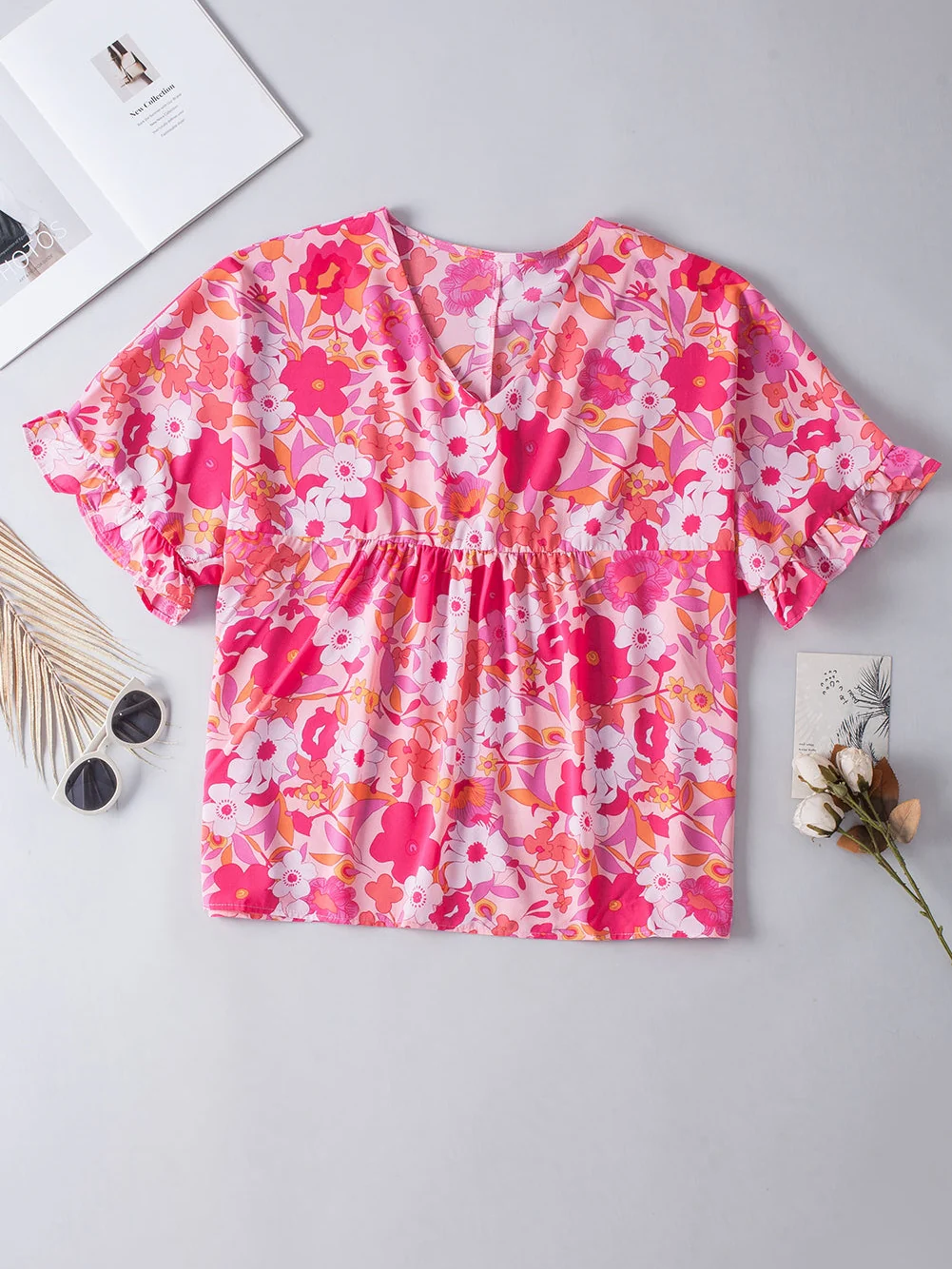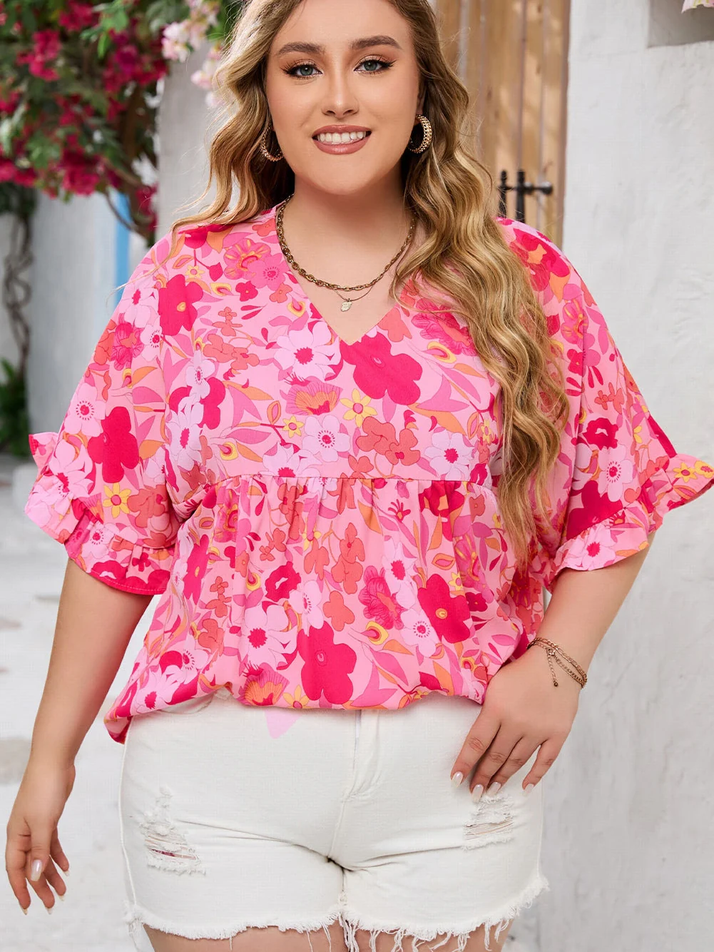 Rose Floral Print Ruffled Half Sleeve Plus Size Babydoll Blouse