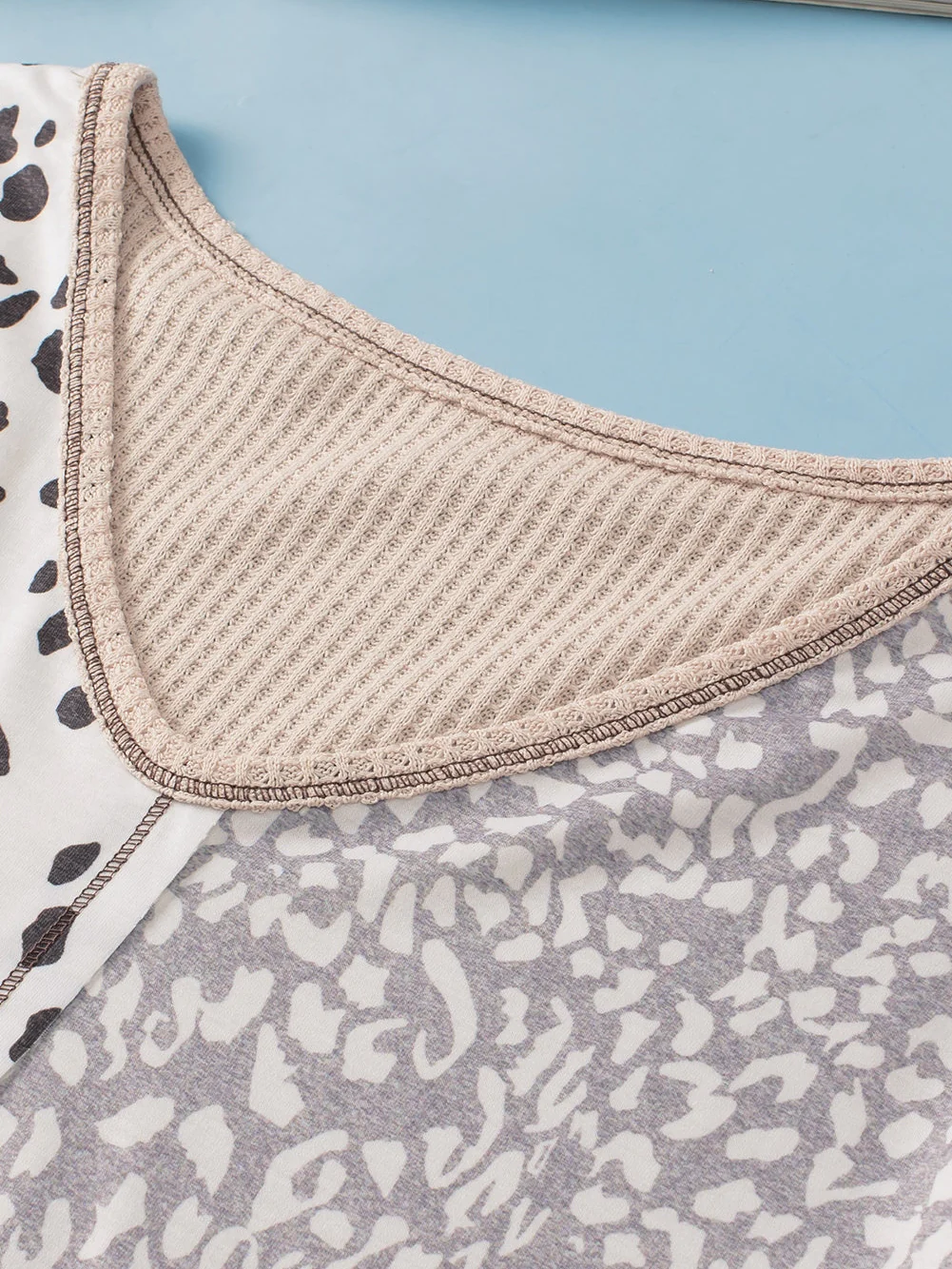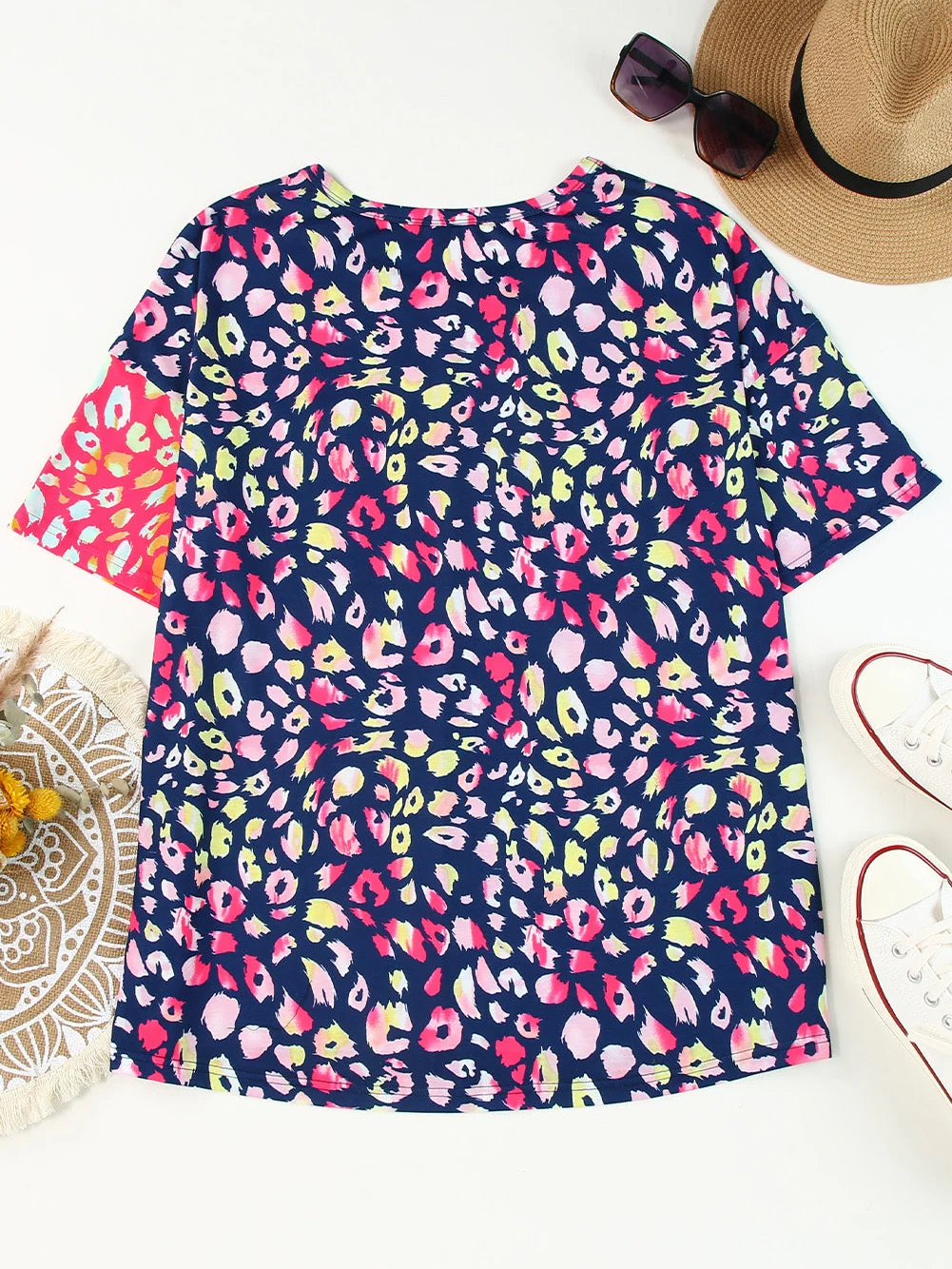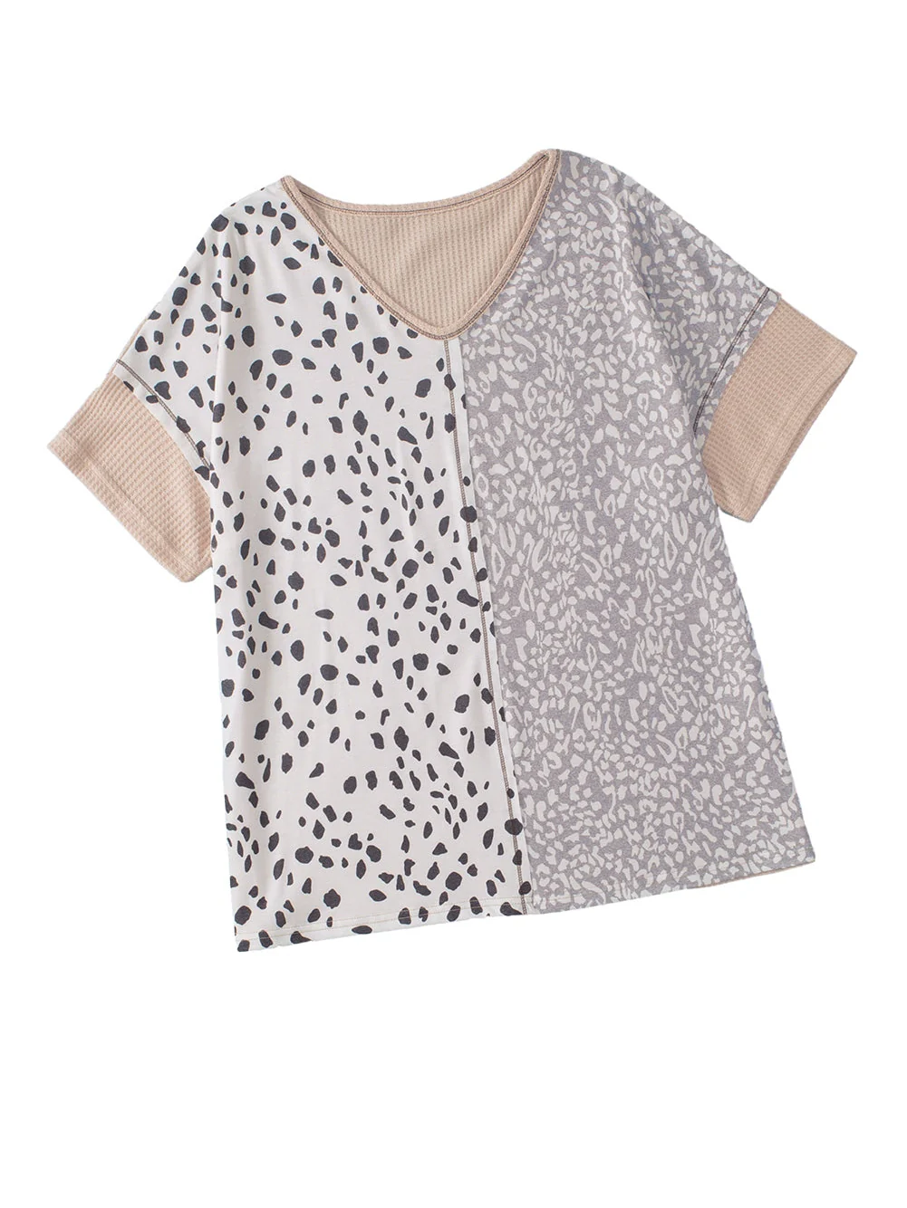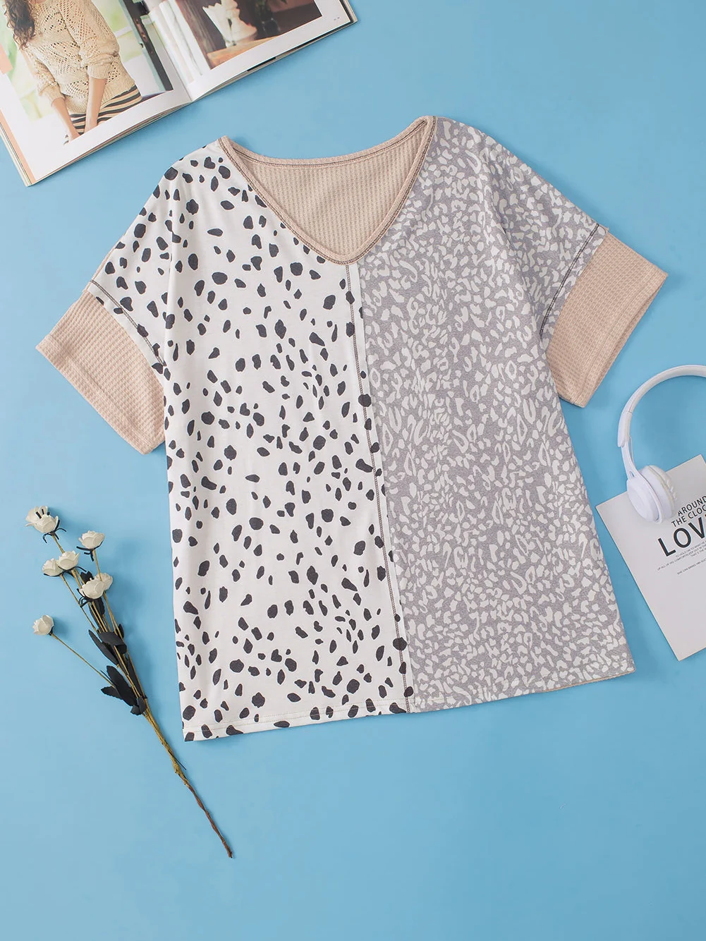 Leopard Print Colorblock V Neck Khaki Plus Size Tunic
