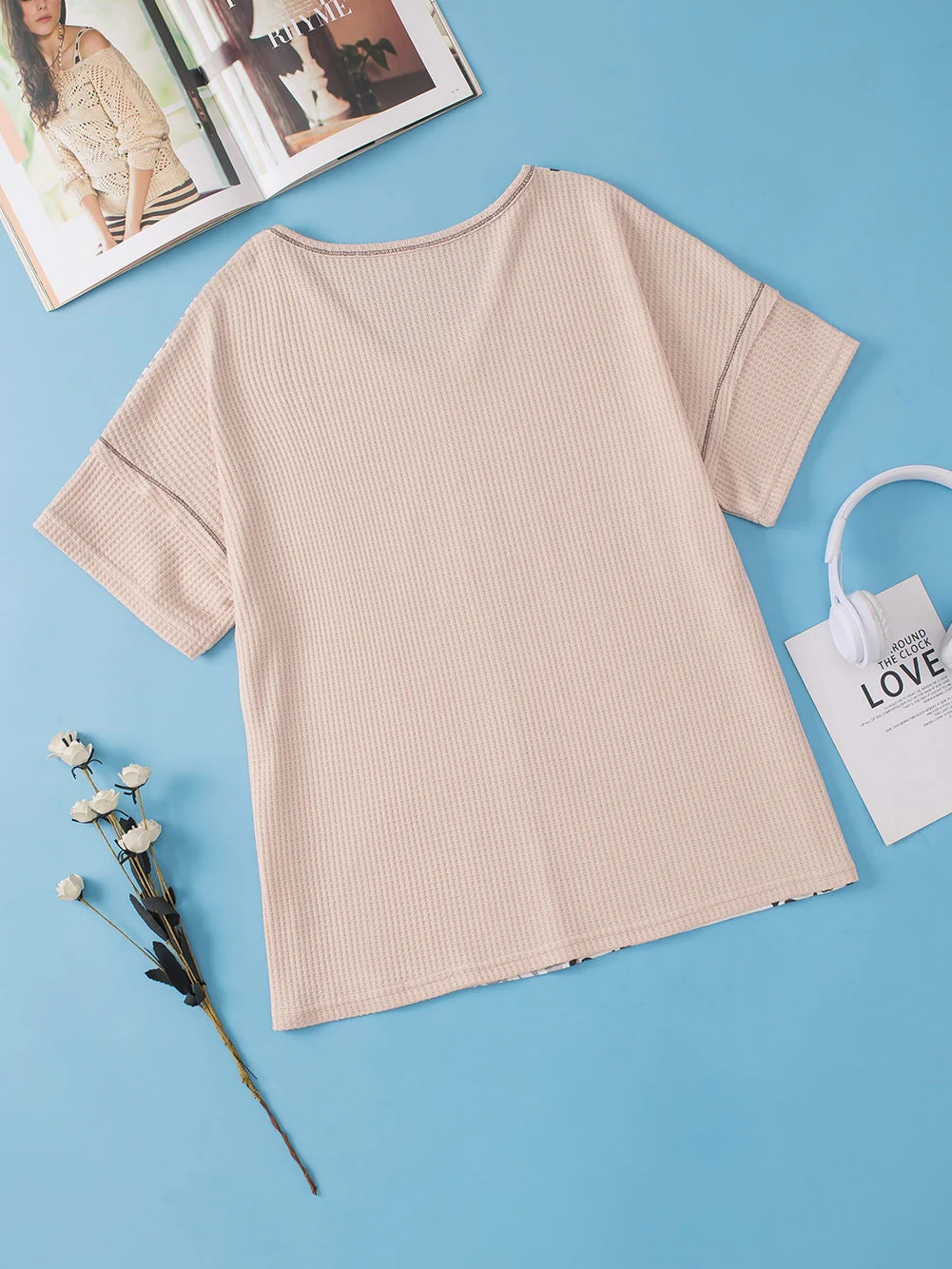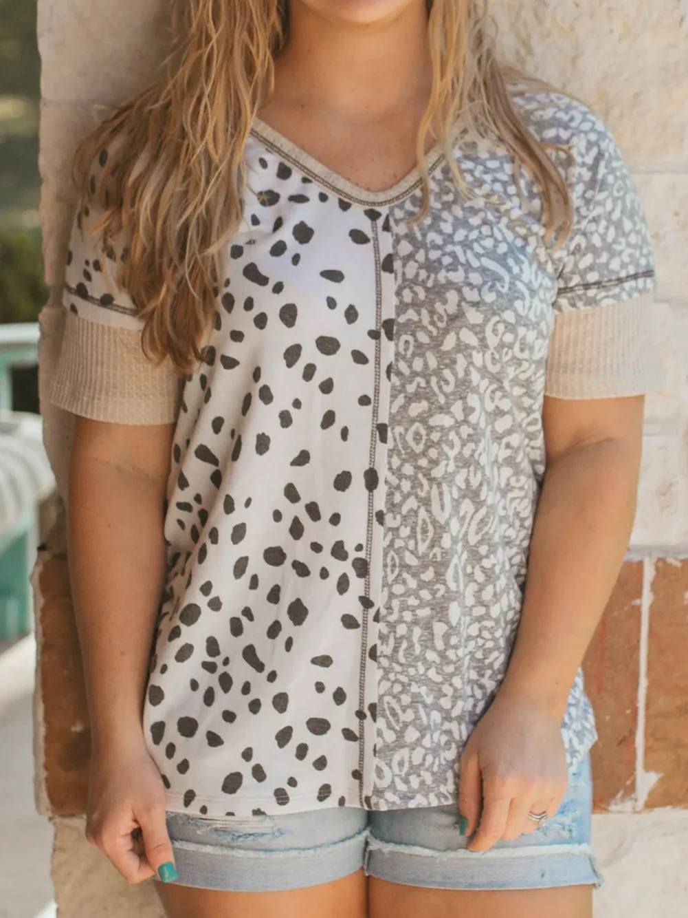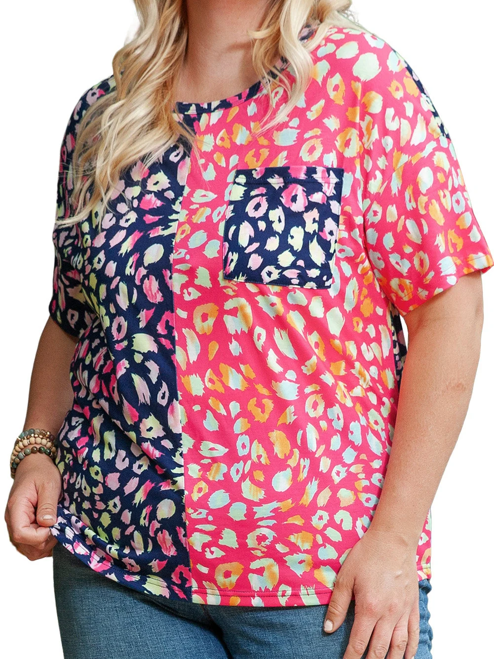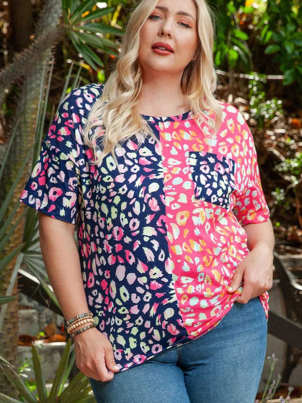 Leopard Print Colorblock V Neck Khaki Plus Size Tunic