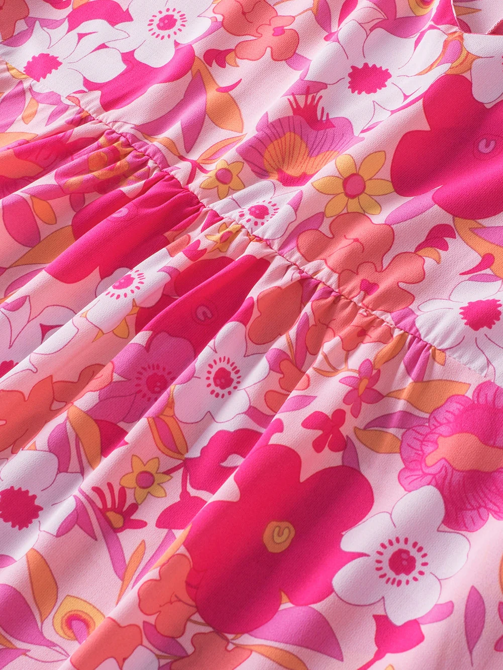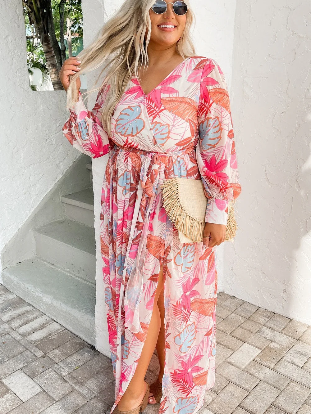 Tropical Print V-Neck Maxi Dress with High Waist Tie - Plus Size