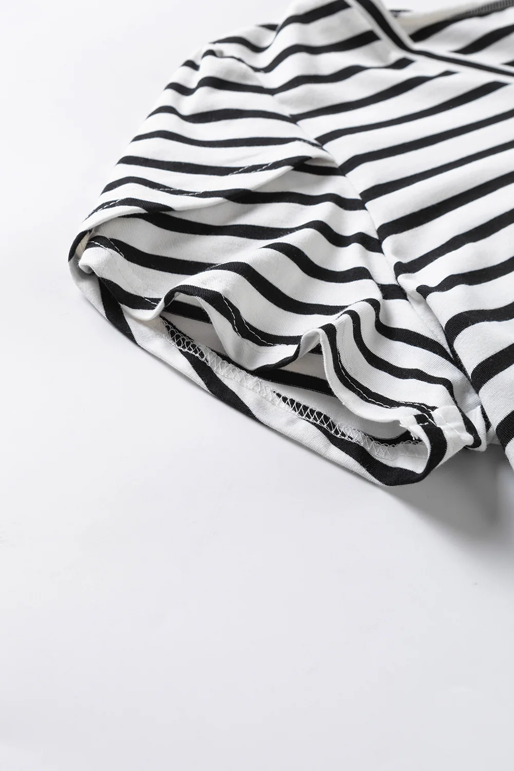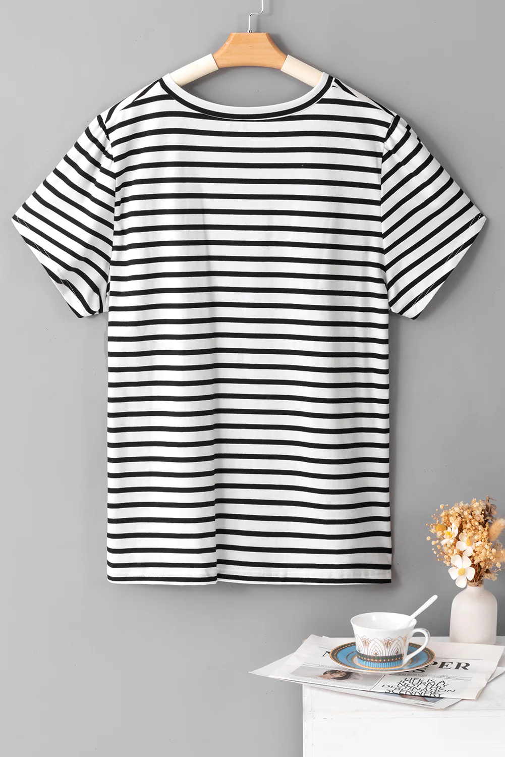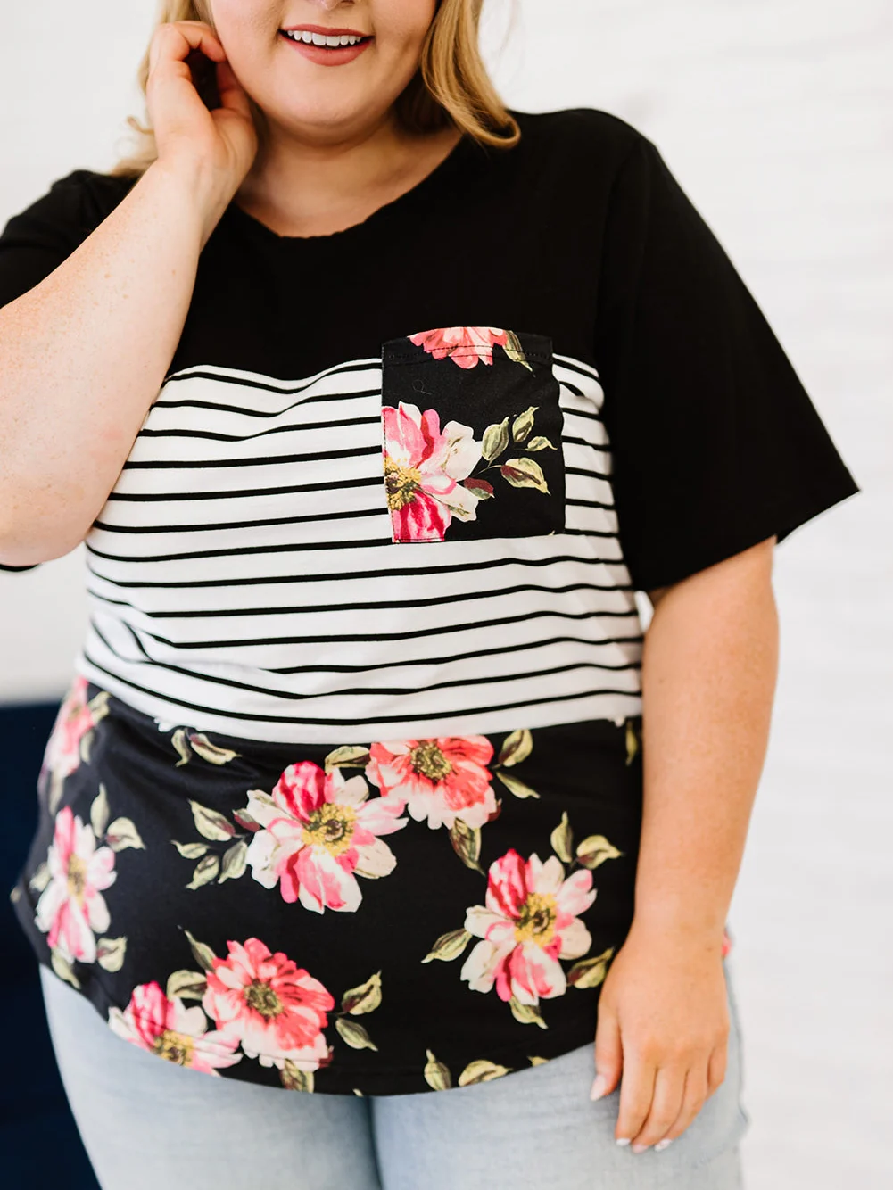 Chic Black Floral Striped Plus Size Short Sleeve Top