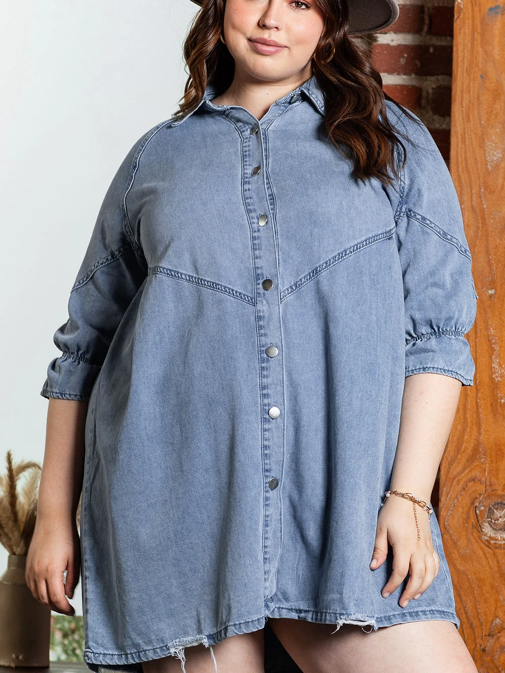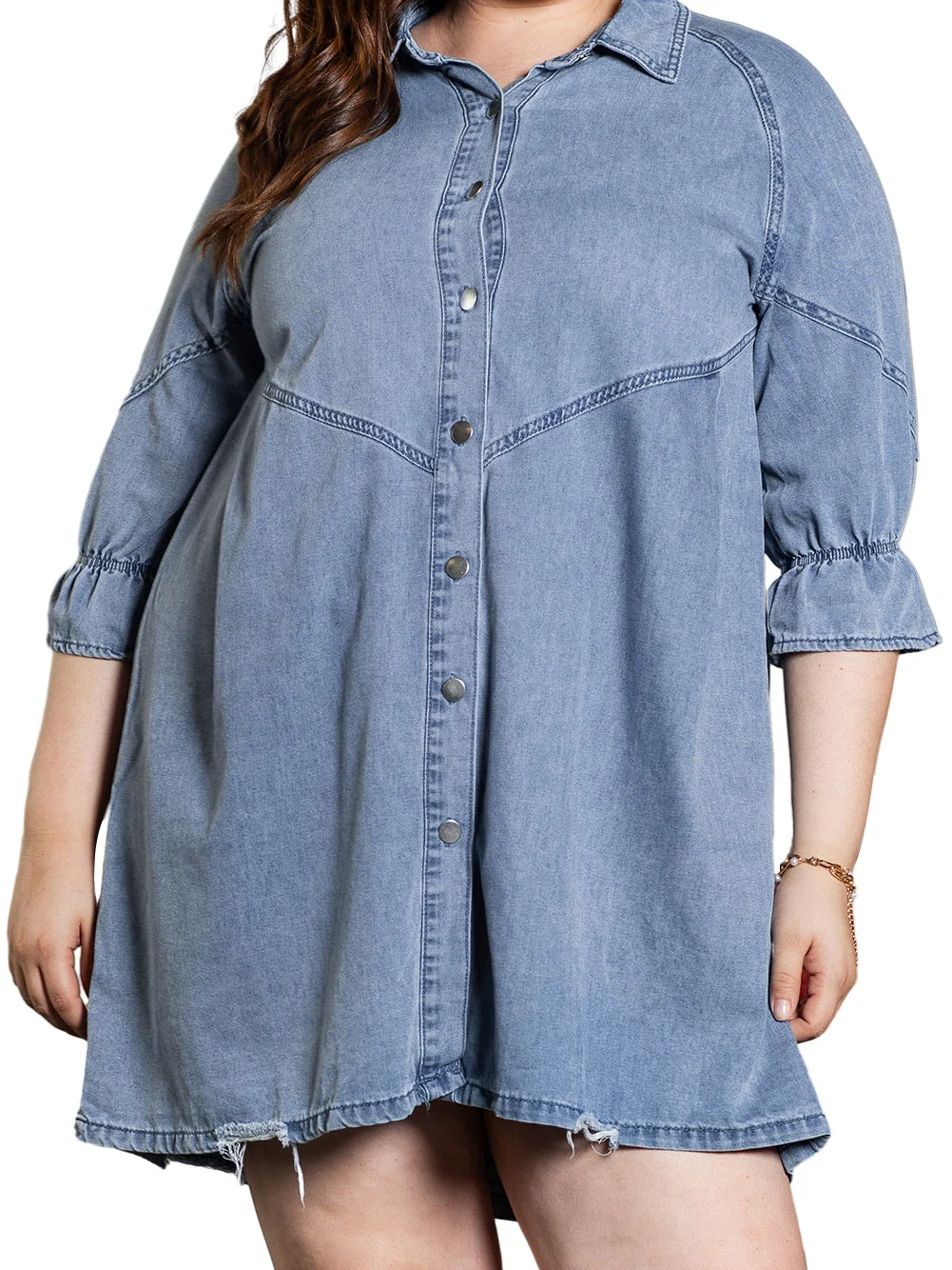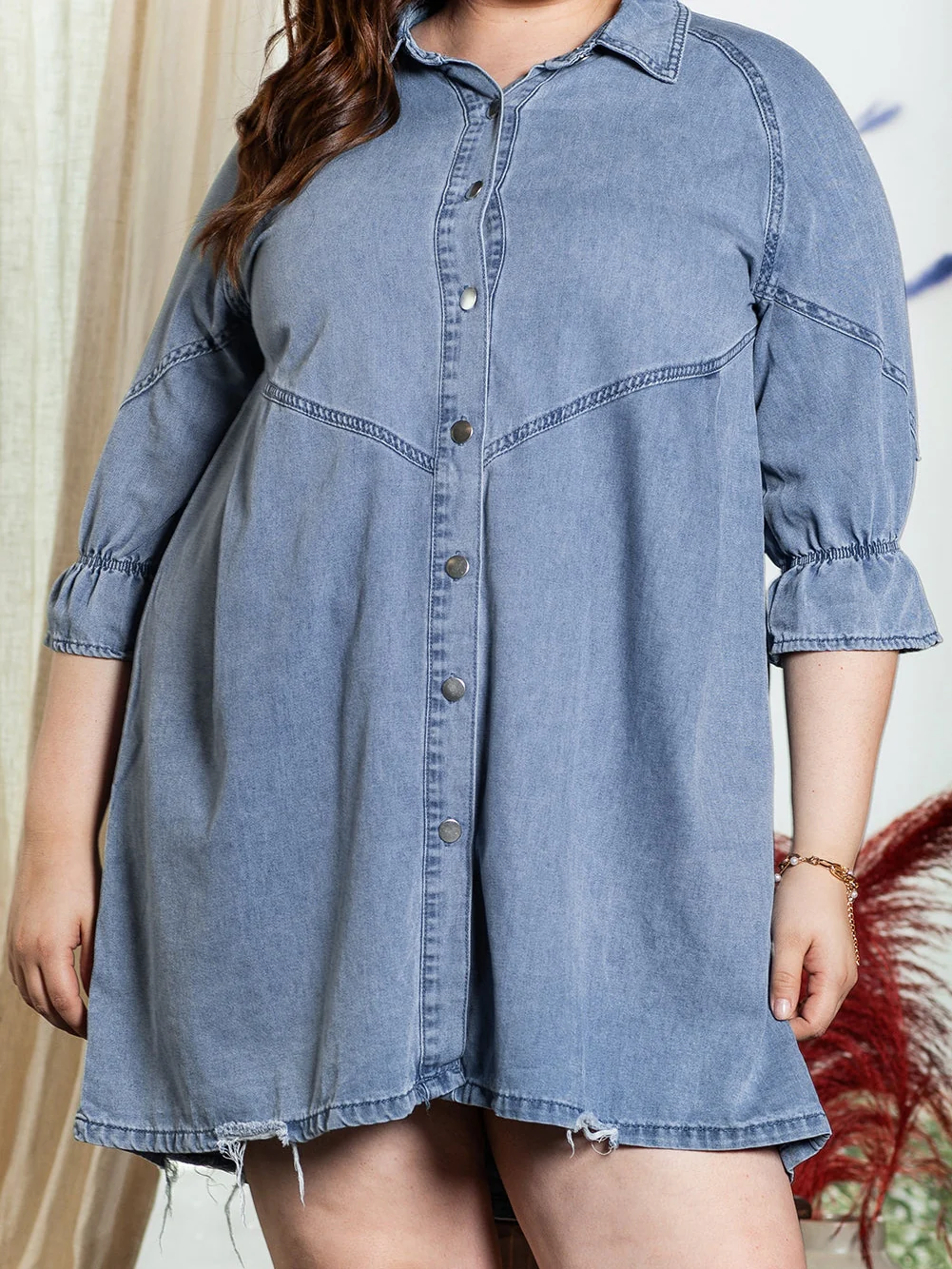 Light Blue Ruffled 3/4 Sleeve Buttoned Front Plus Size Denim Dress