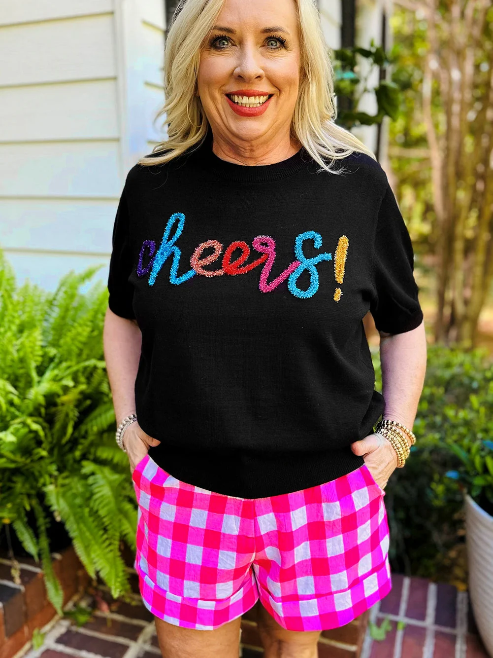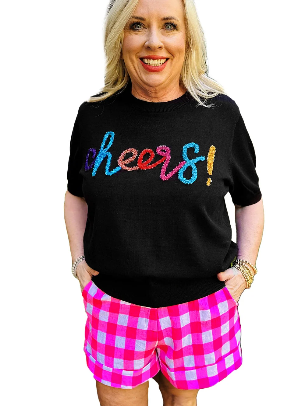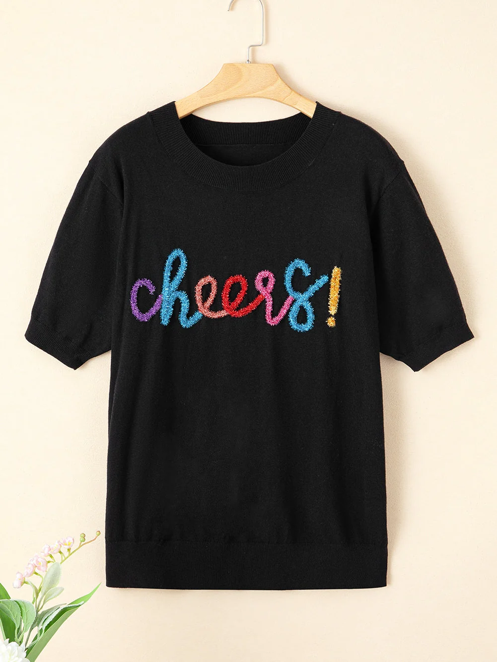 Sparkling Black Glitter Tinsel Cheers Plus Size Short Sleeve Sweater