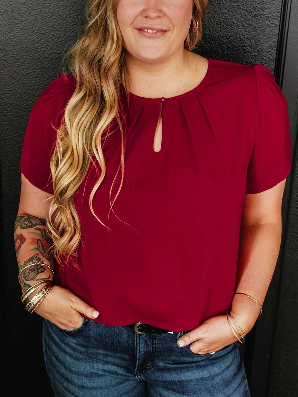 Red Dahlia Keyhole Pleated Crew Neck Plus Size T Shirt