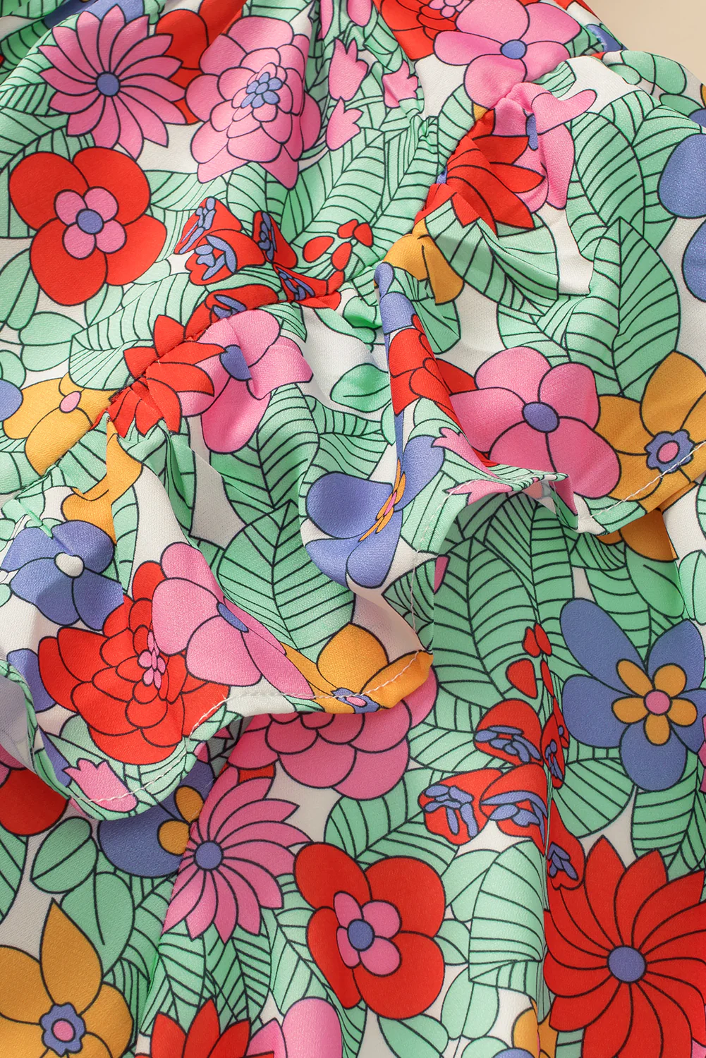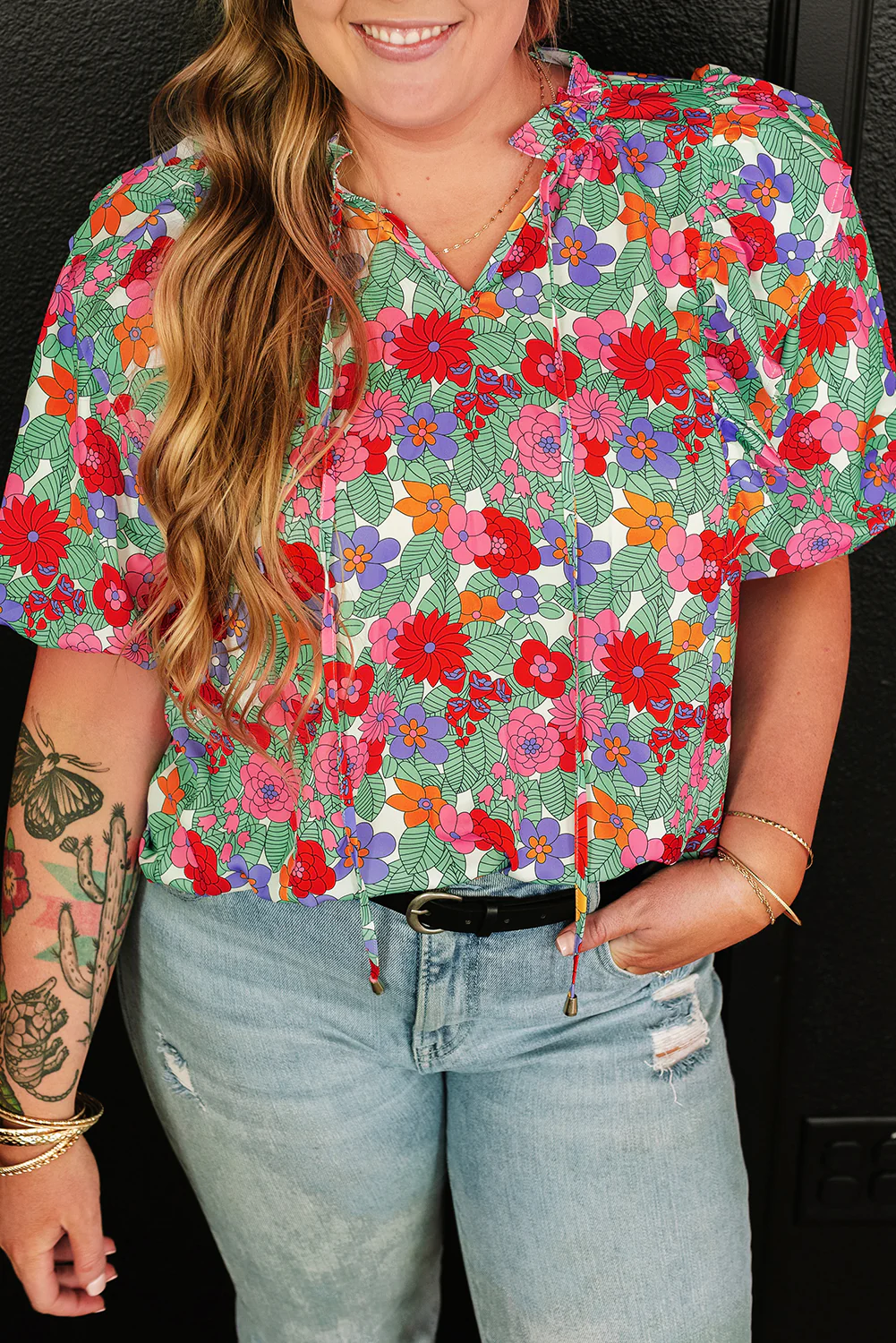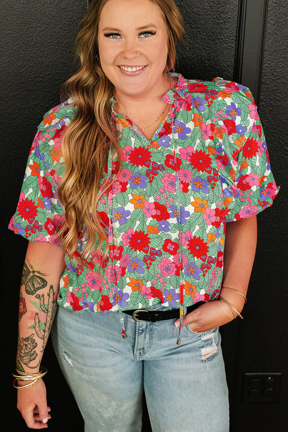 Multicolour Plus Size Floral Print Ruffle V Neck Bubble Sleeve Blouse