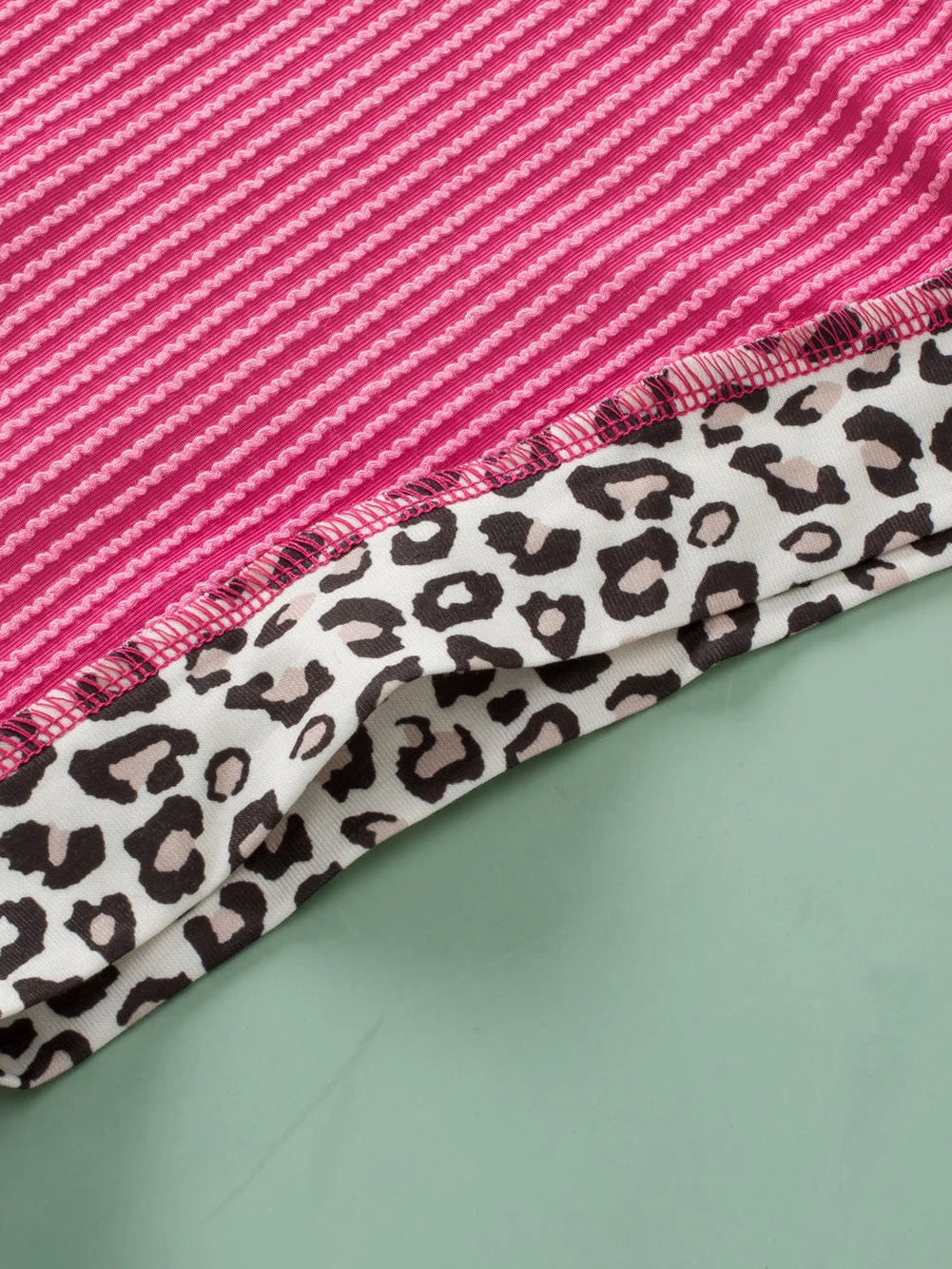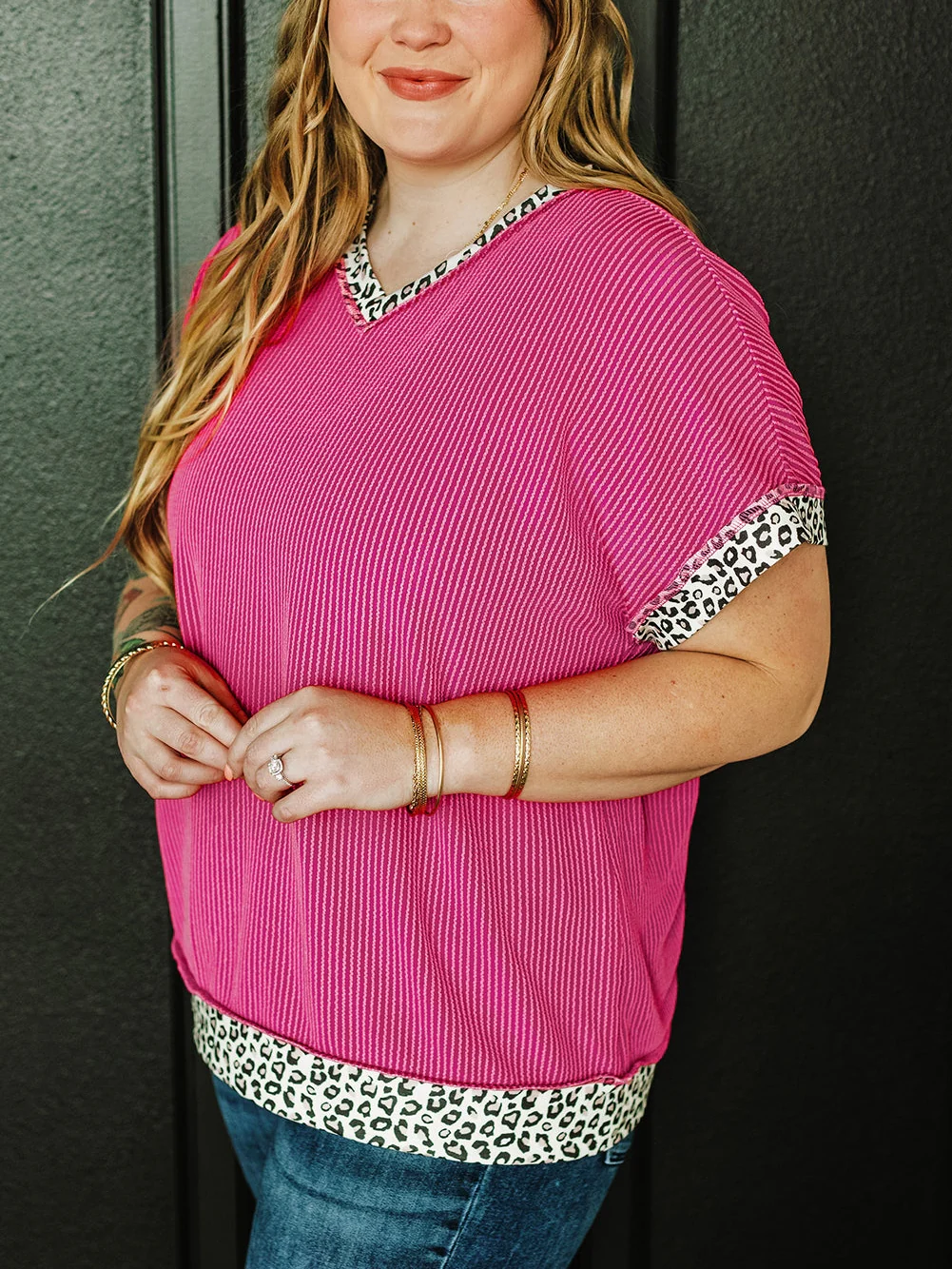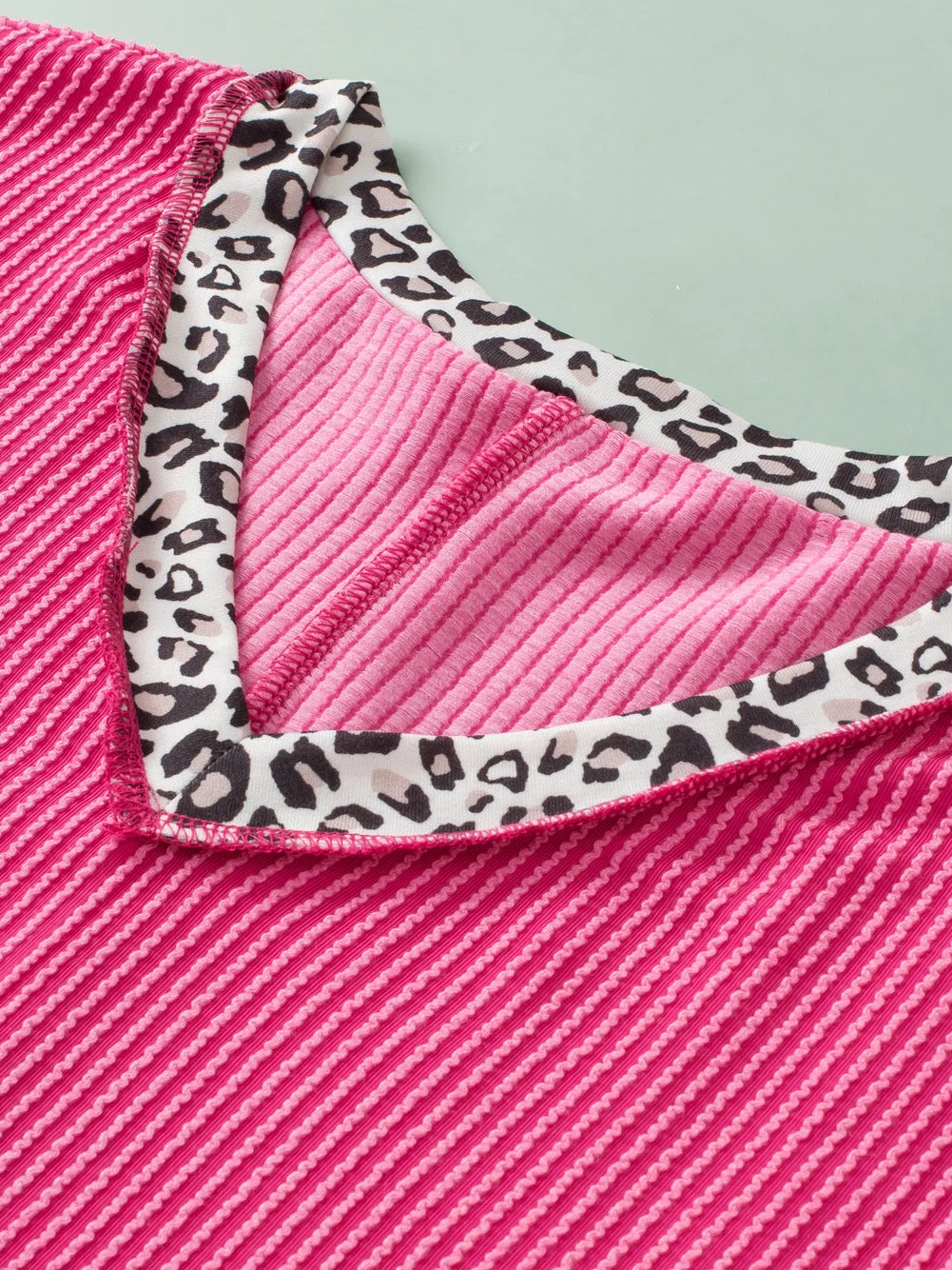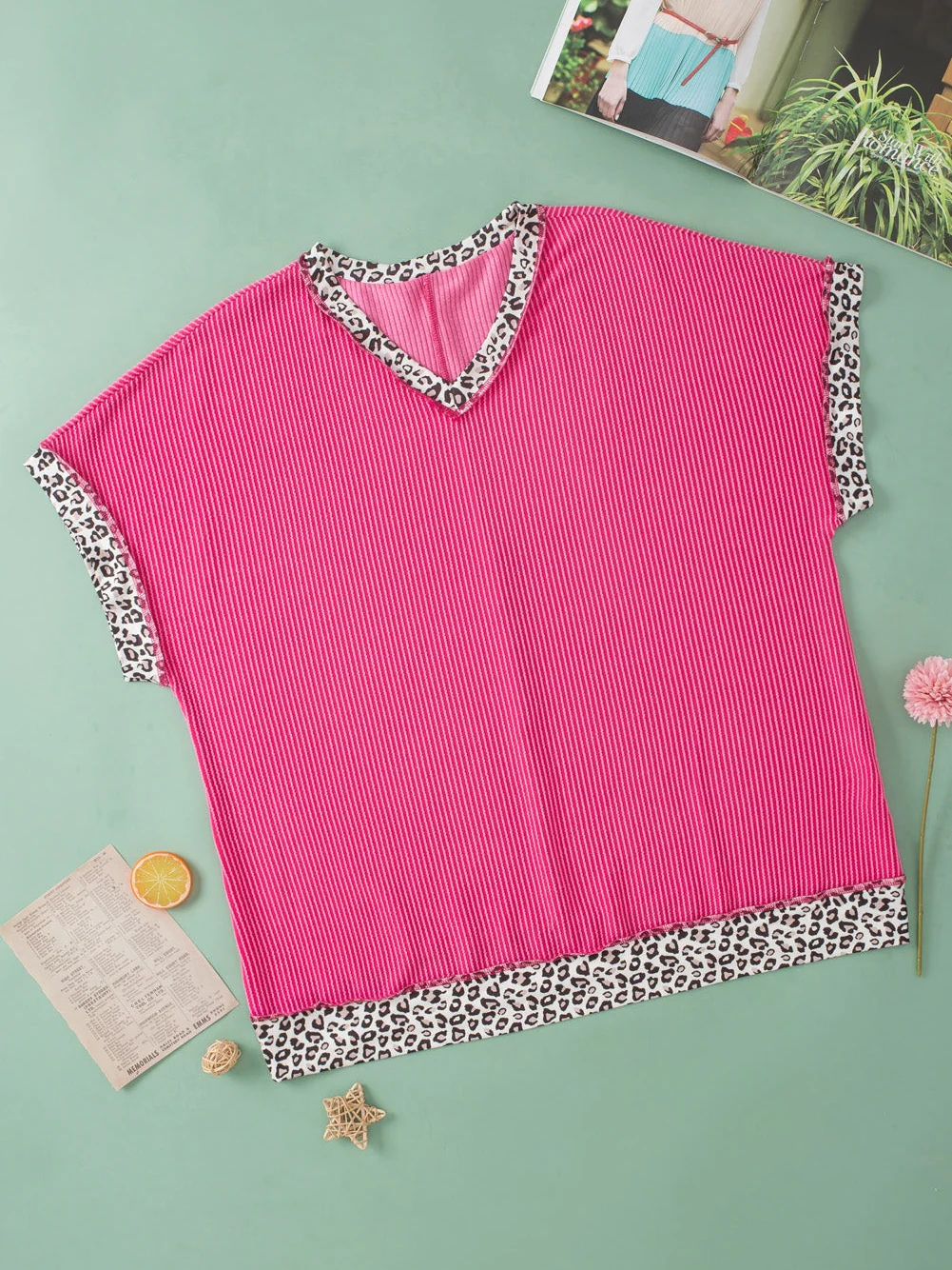 Rose Red Leopard Trim V Neck Short Sleeve Plus Size Corded Top
