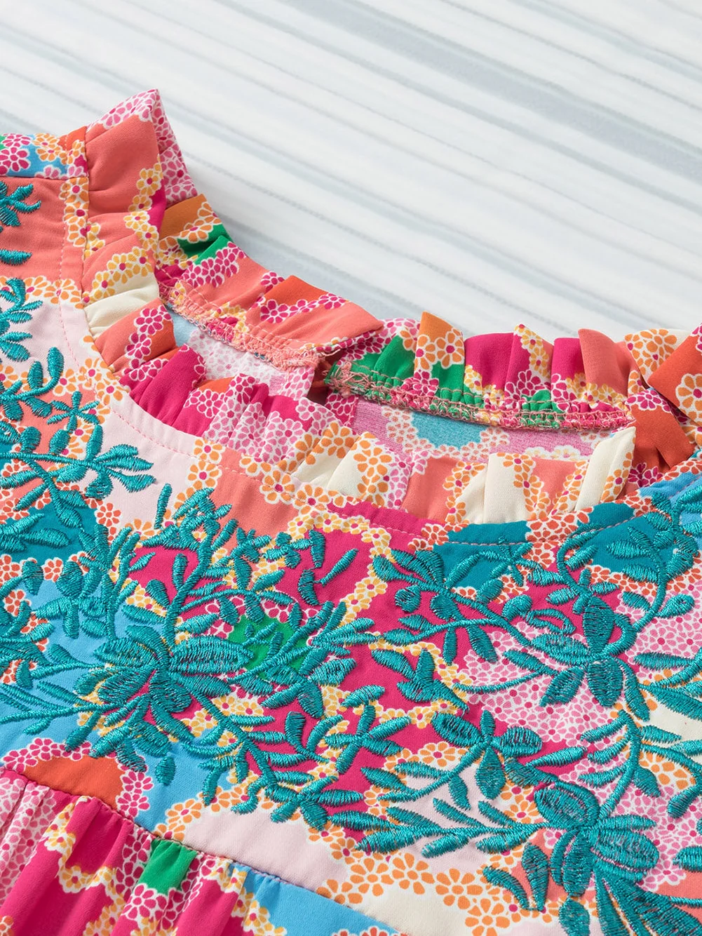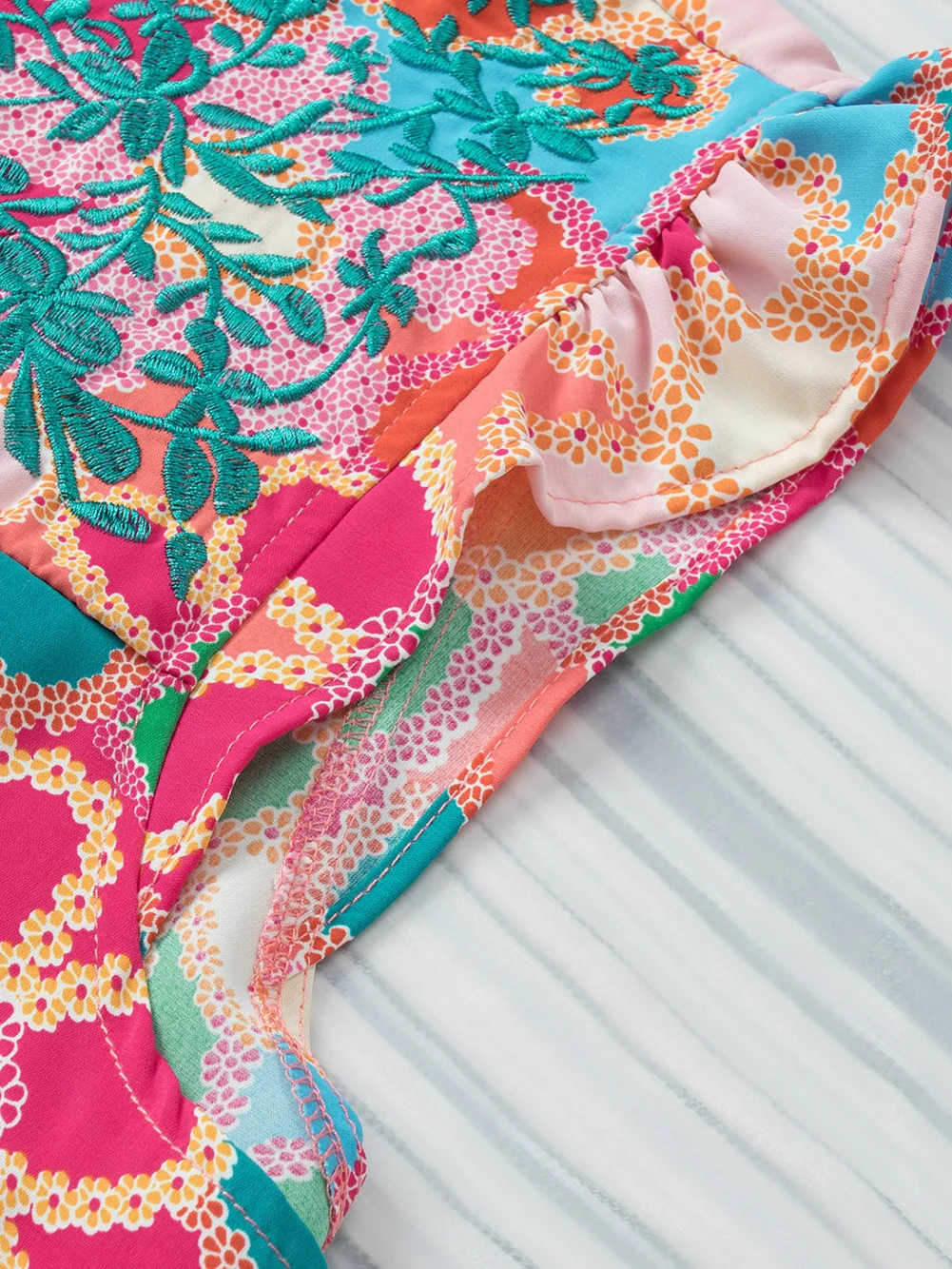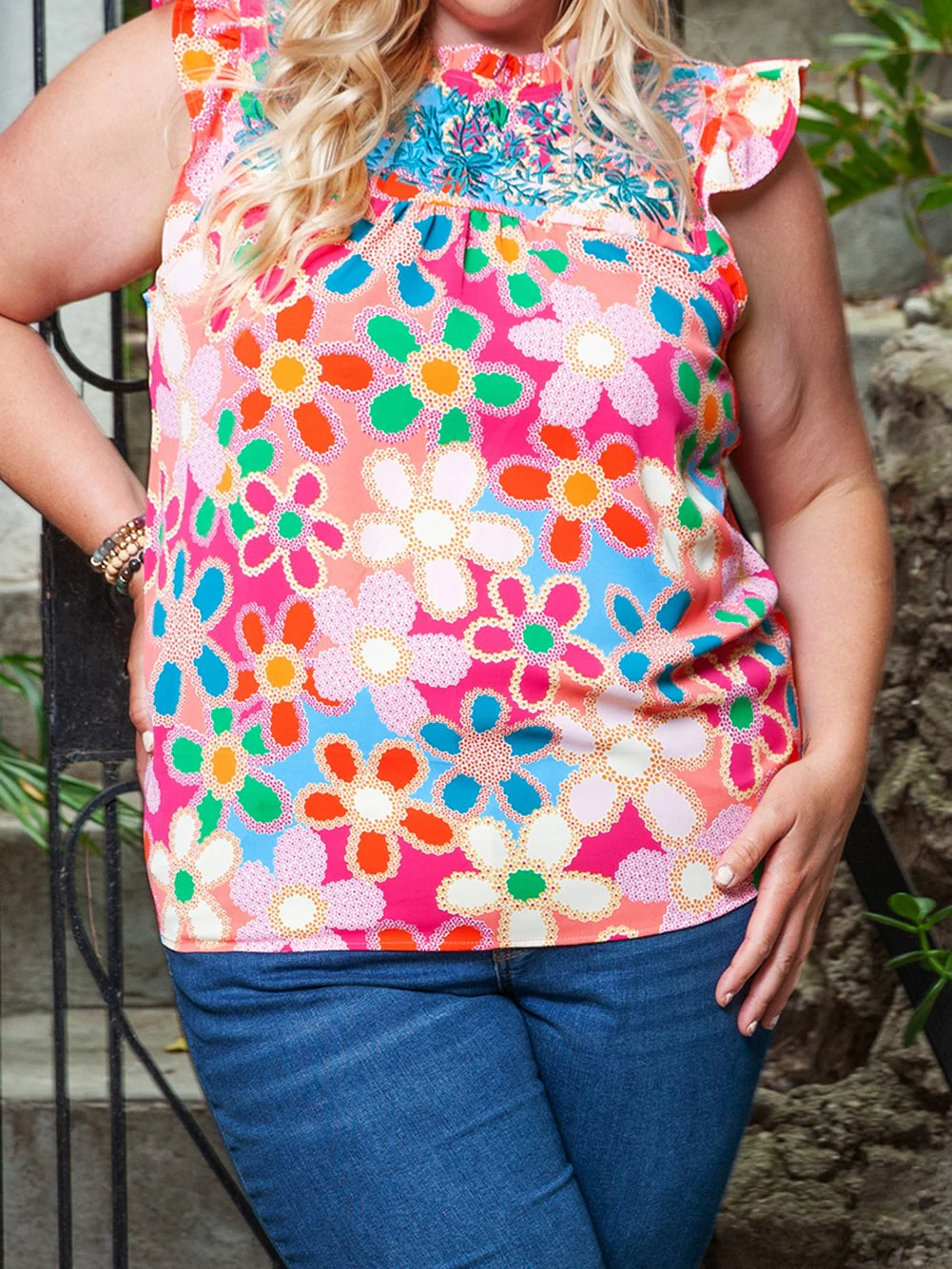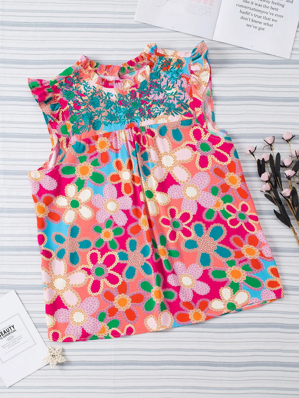 Multicolor Plus Size Floral Embroidered Flutter Sleeve Tank Top