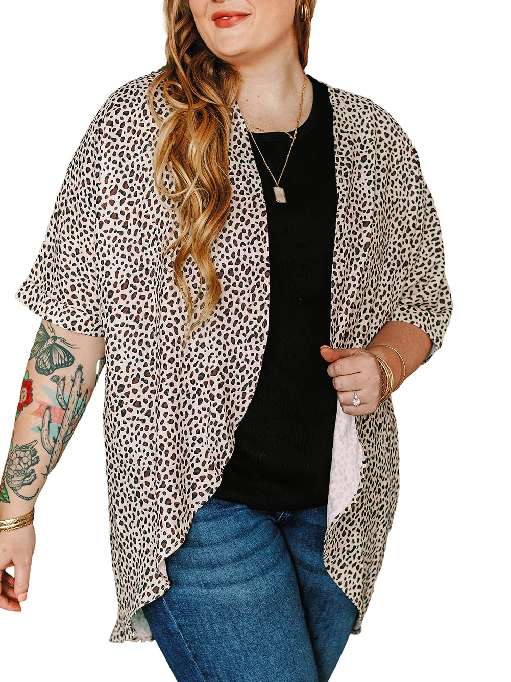 Leopard Print Khaki Plus Size Open Front Cardigan with Half Sleeves