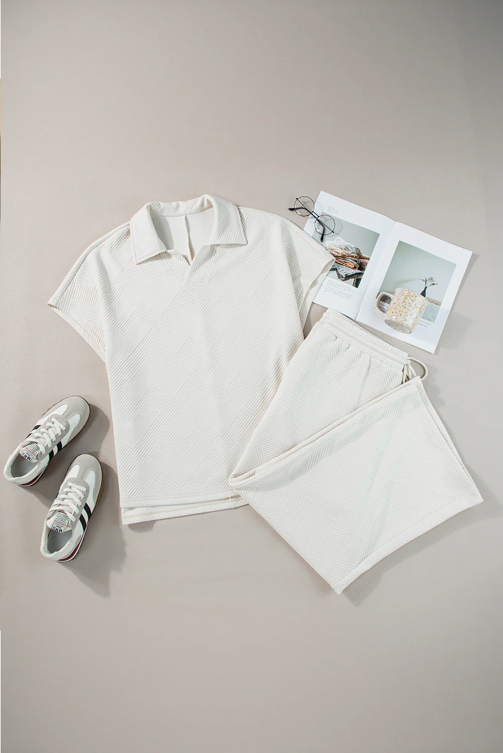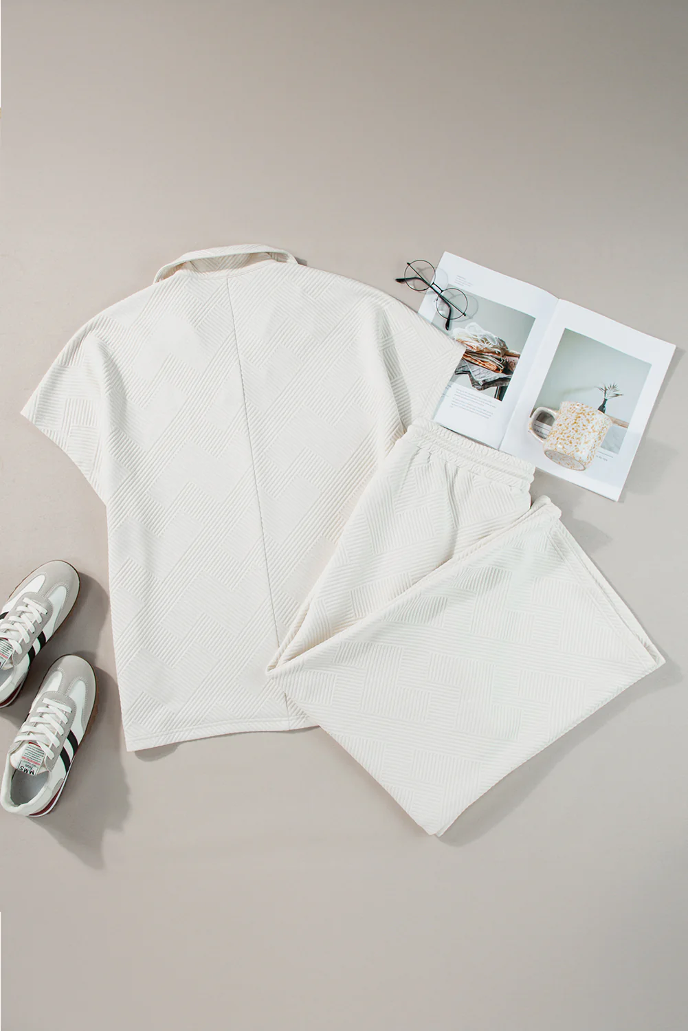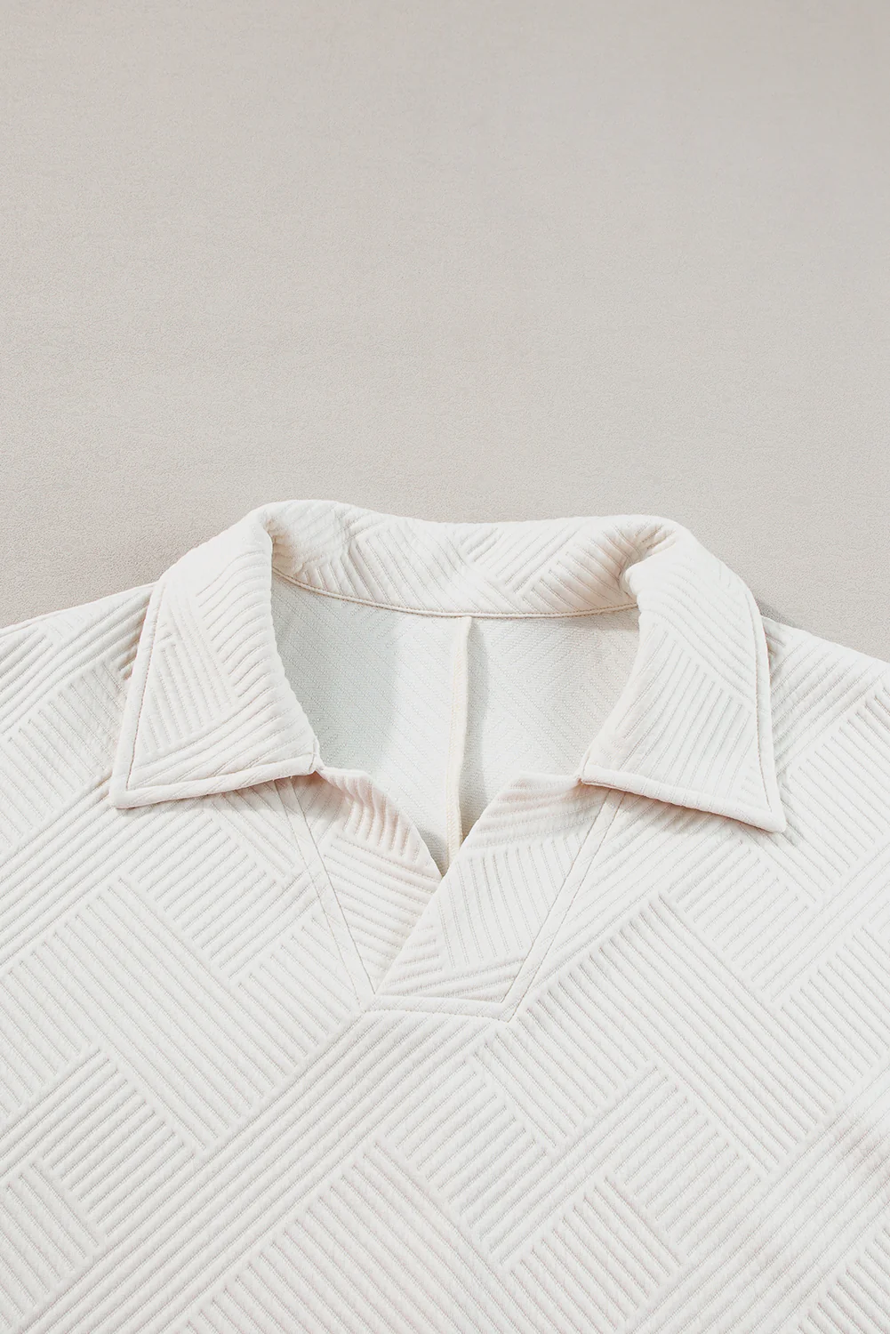Beige Plus Size Textured Collared Top and Pants Set
