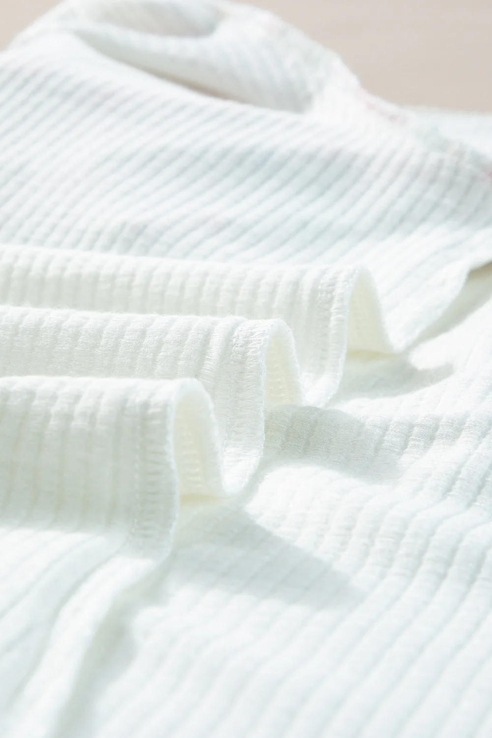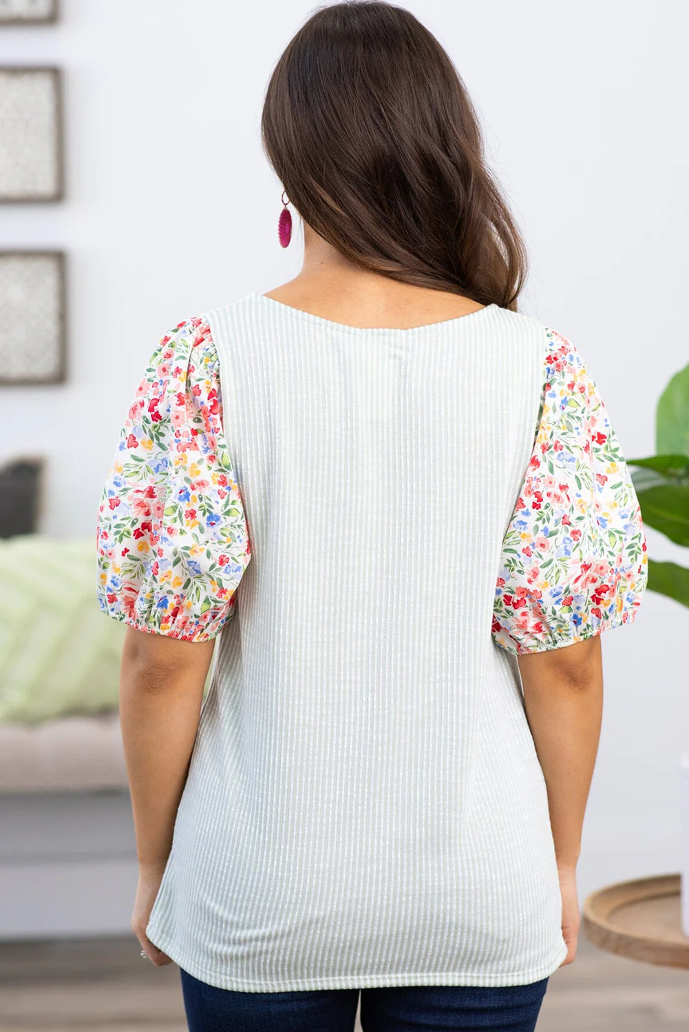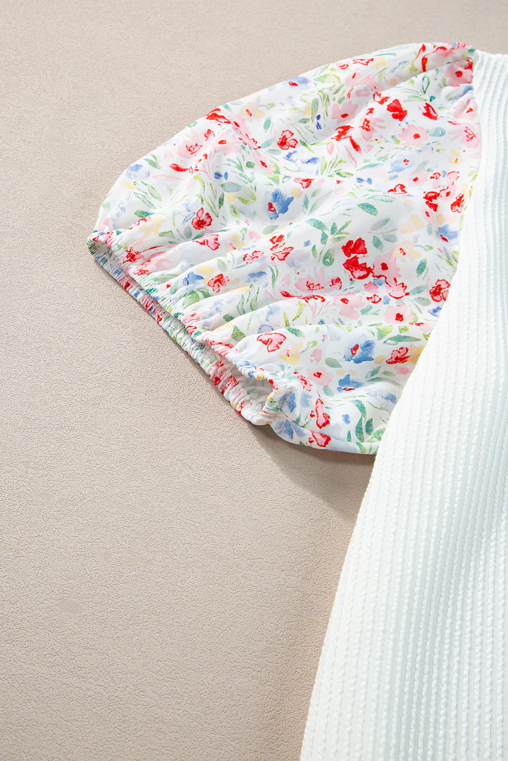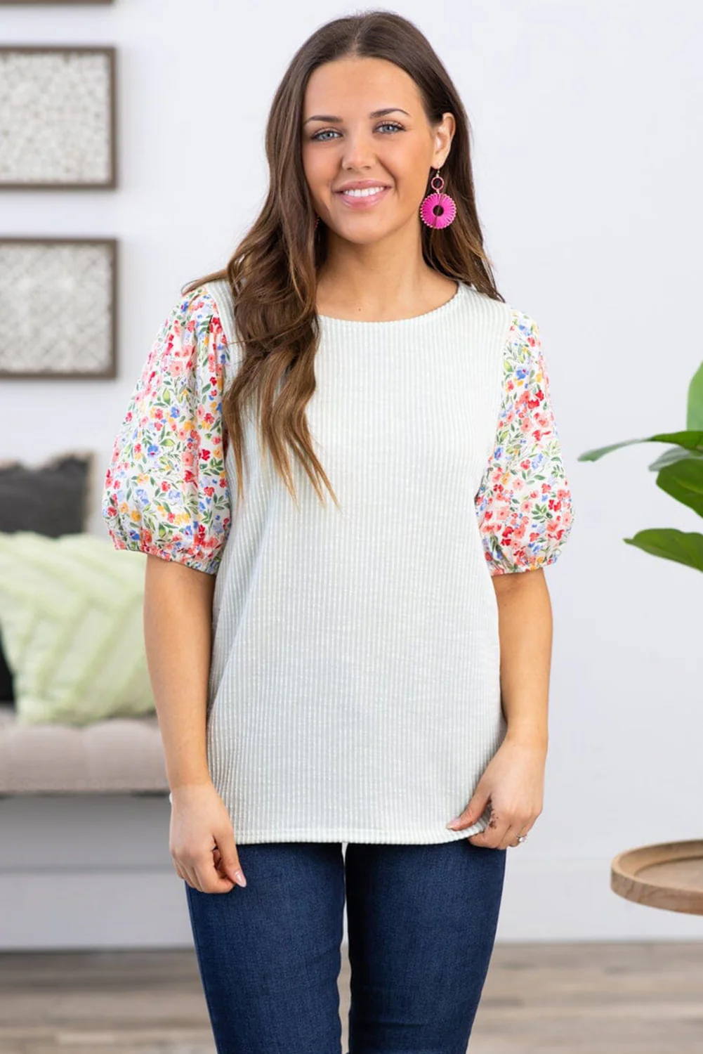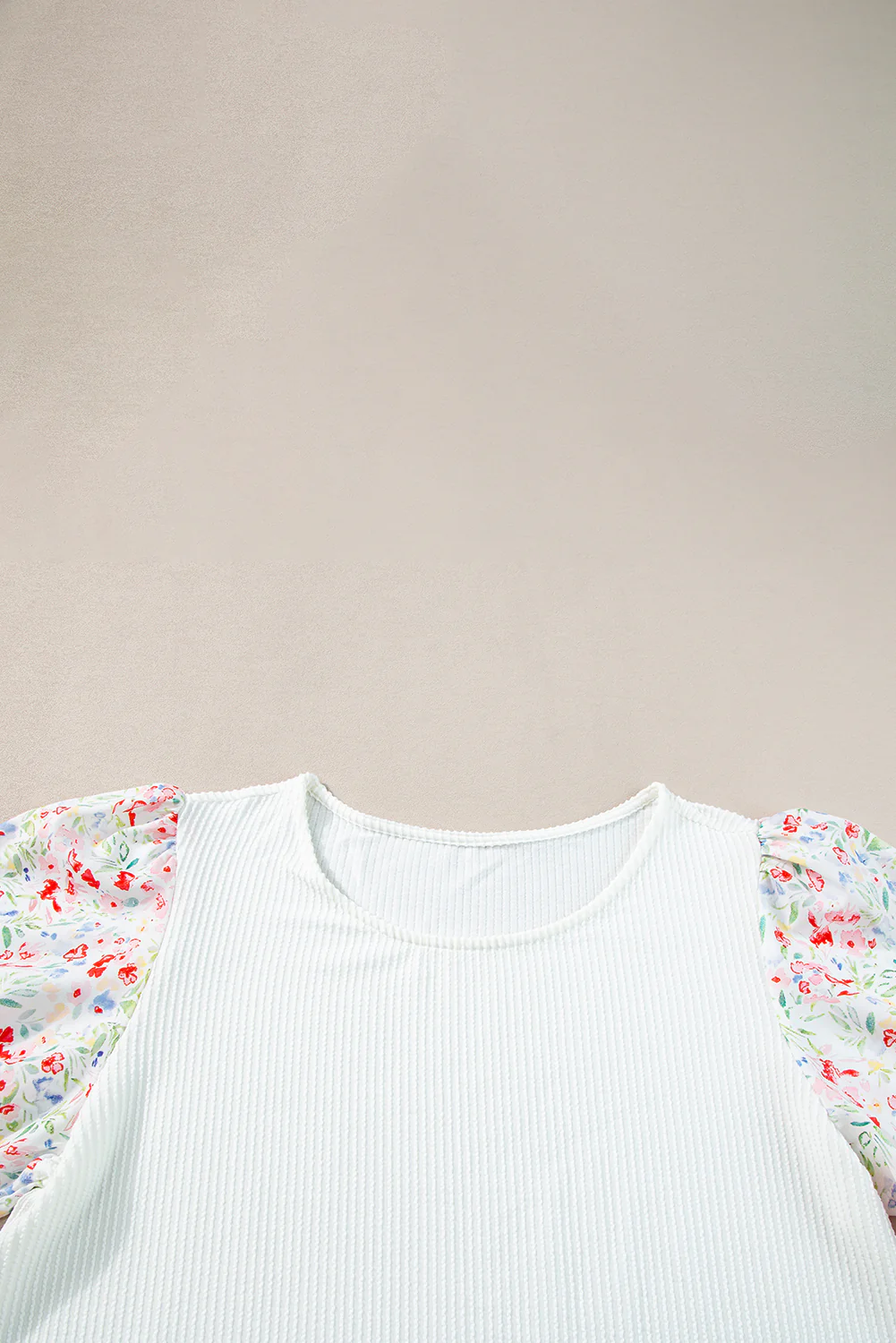 White Contrast Floral Puff Sleeve Ribbed Knit Plus Size Blouse