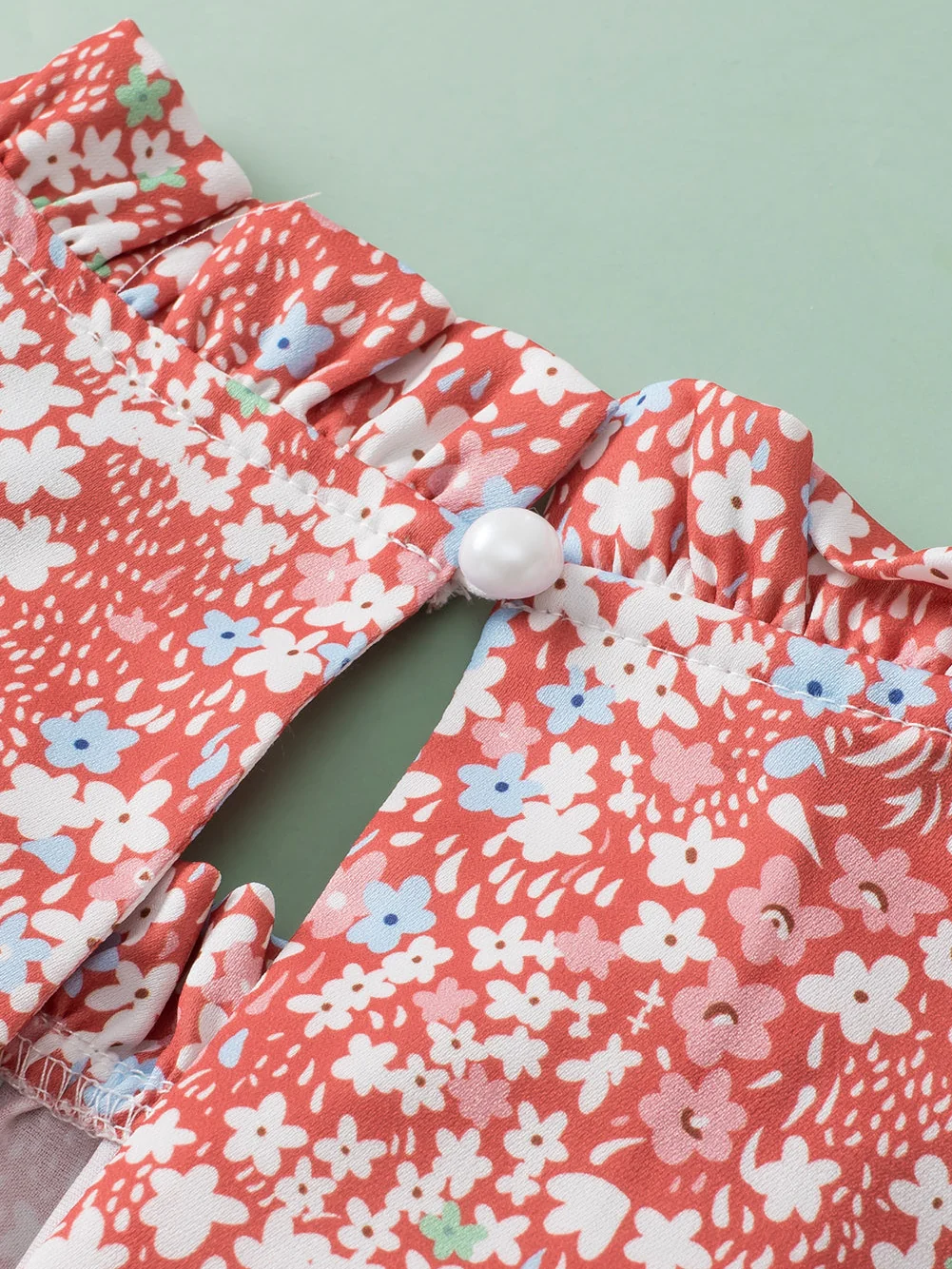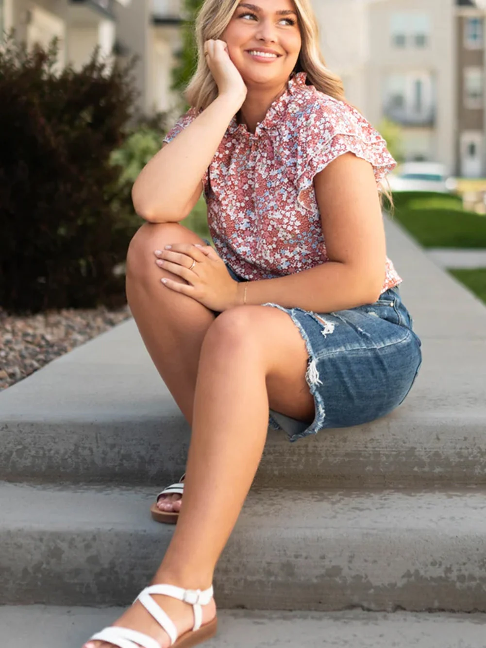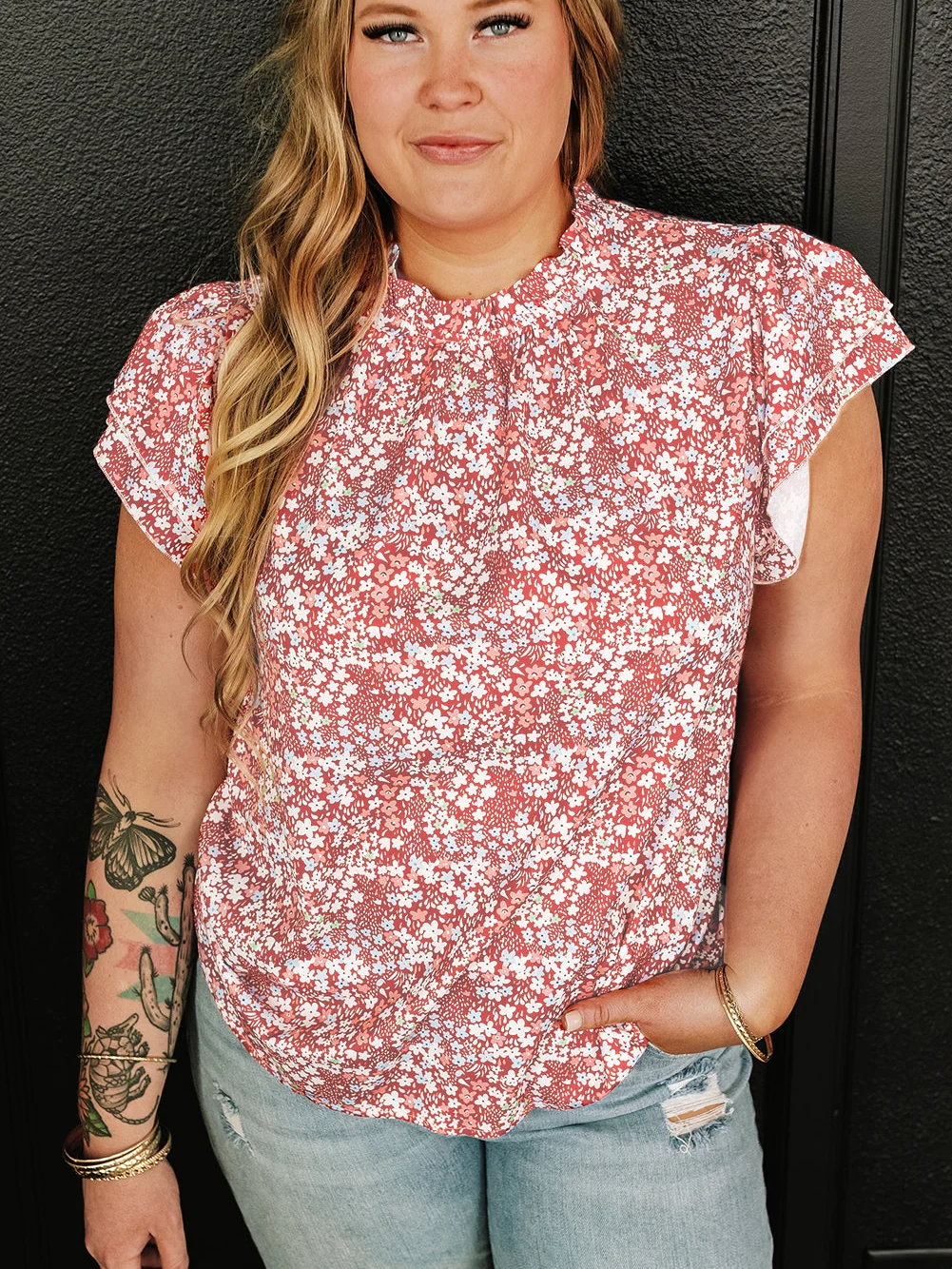 Pink Plus Size Floral Print Ruffled Sleeve Frilled Neck Blouse