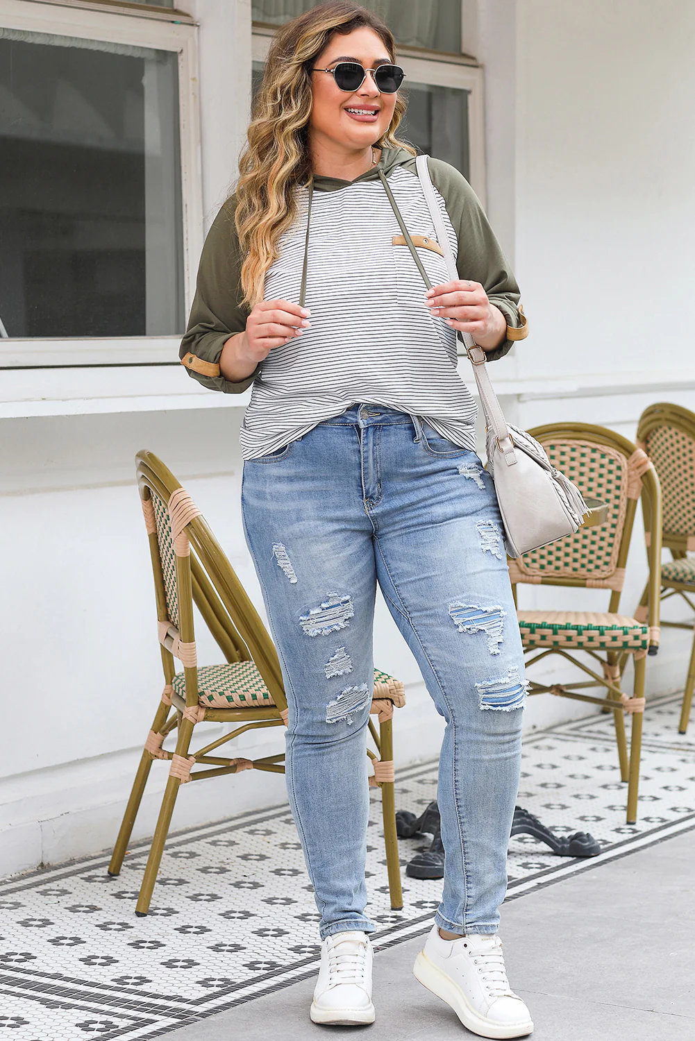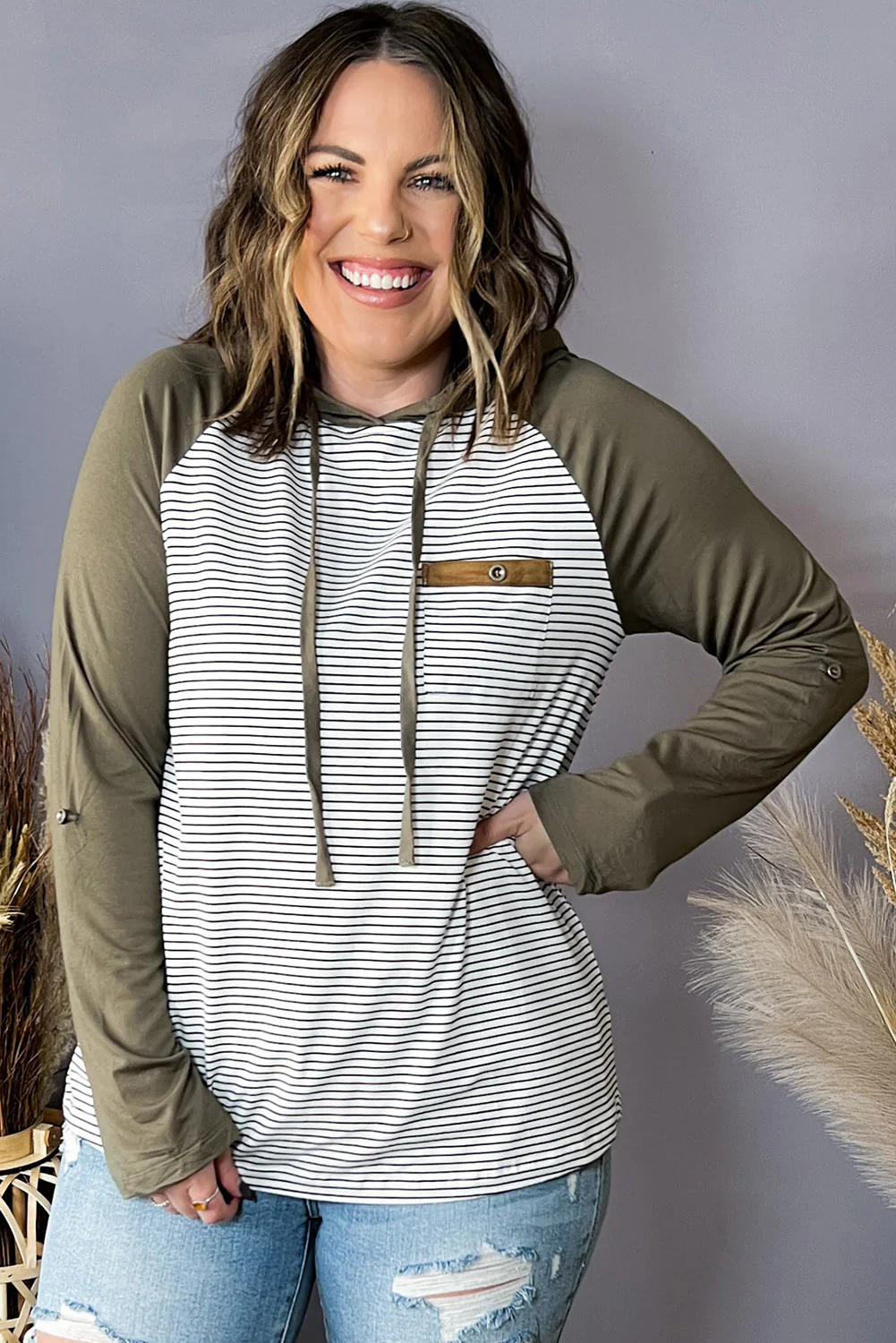 Green Striped Plus Size Hoodie with Raglan Sleeves and Buttoned Pocket