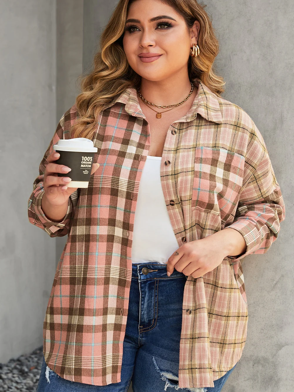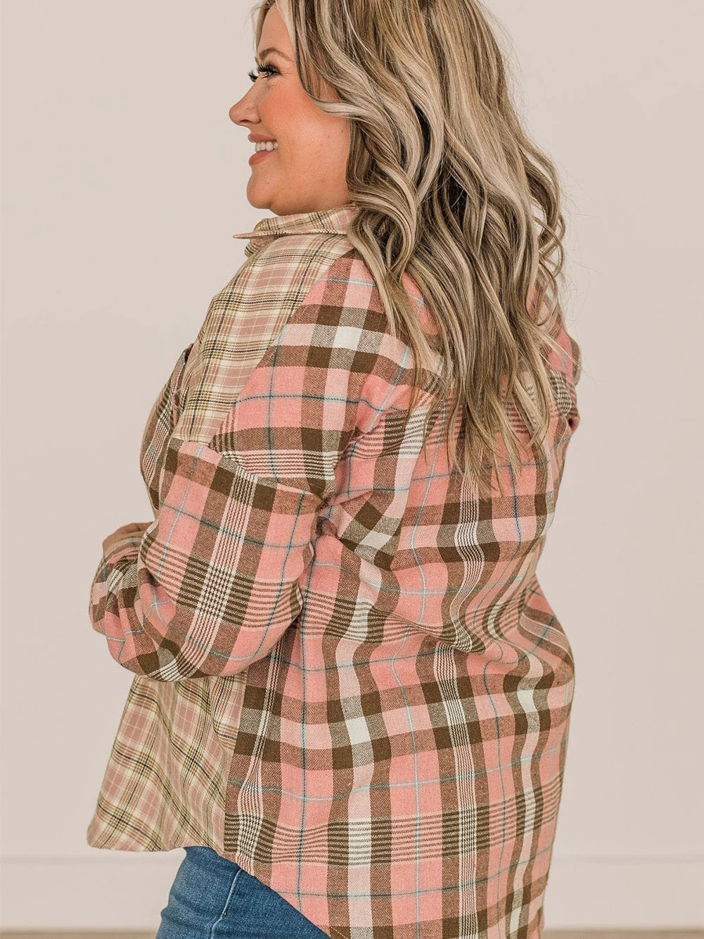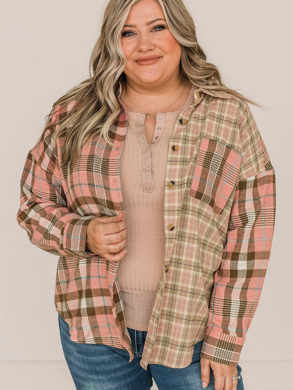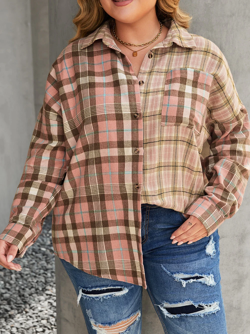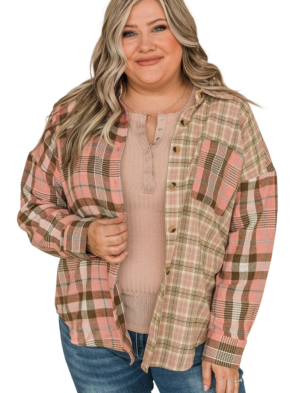 Pink Plaid Pocketed Plus Size Shirt With Long Sleeves