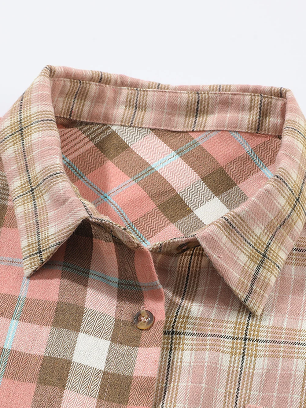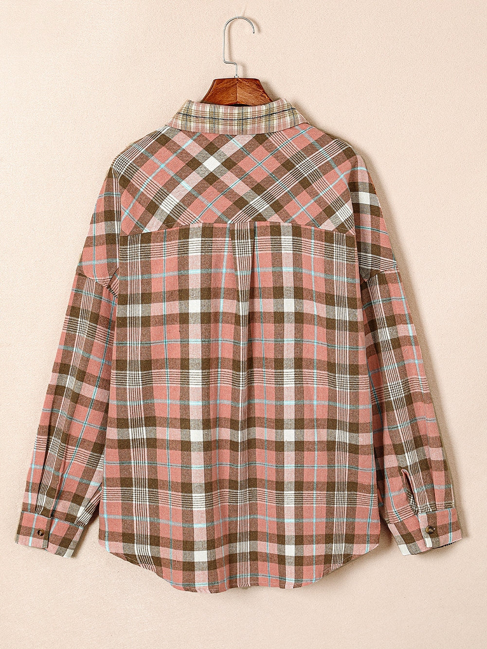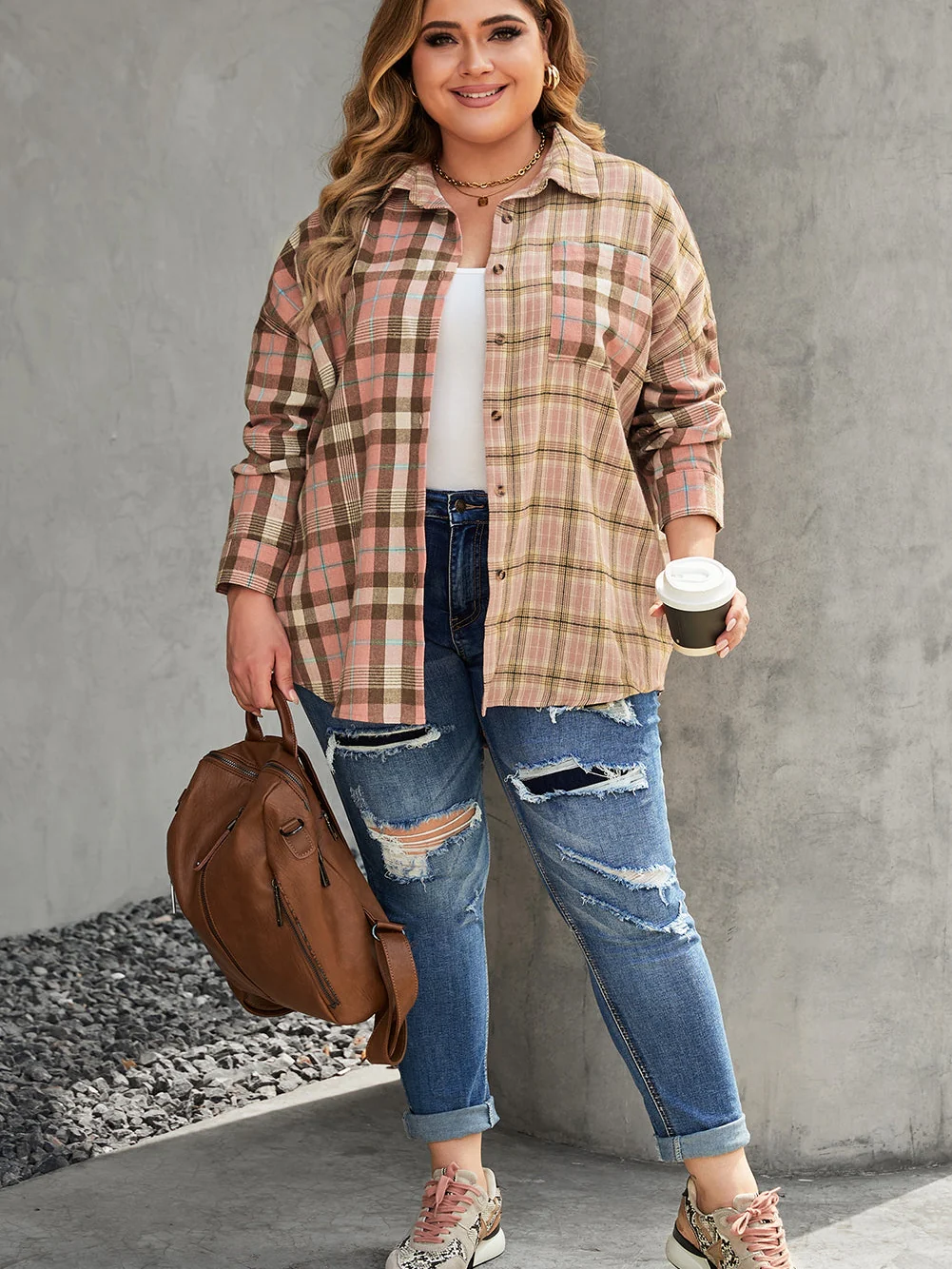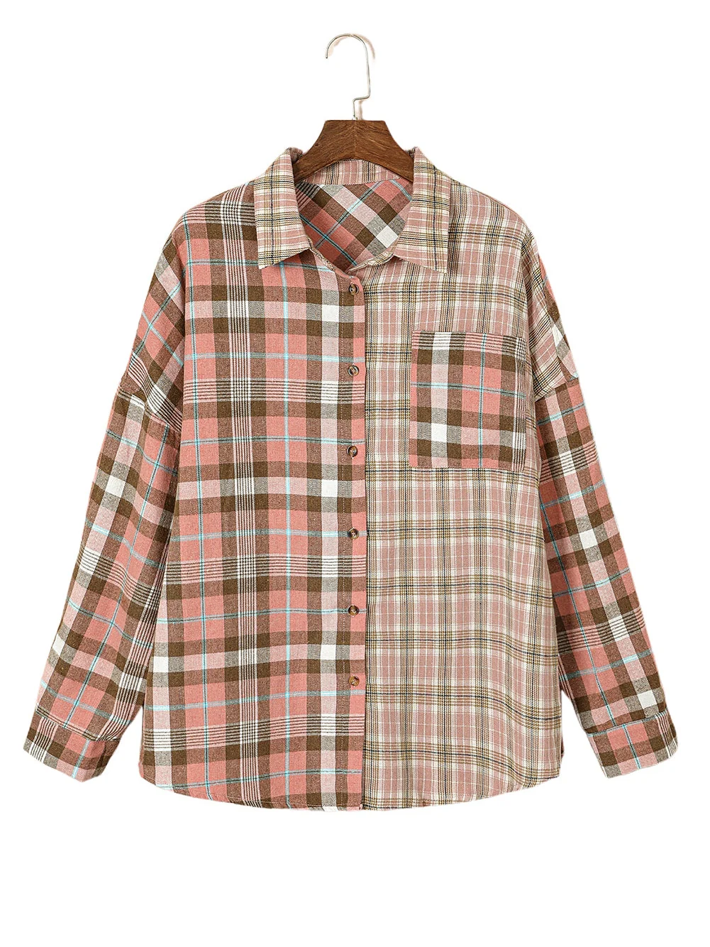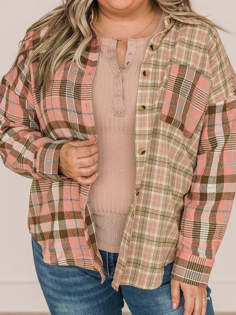 Pink Plaid Pocketed Plus Size Shirt With Long Sleeves