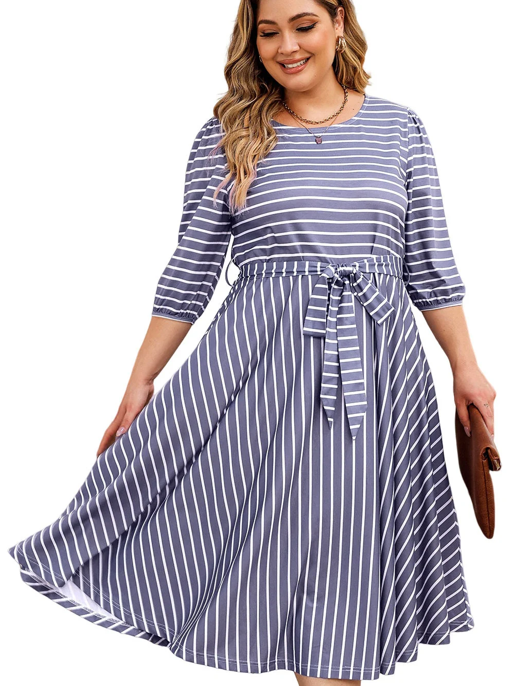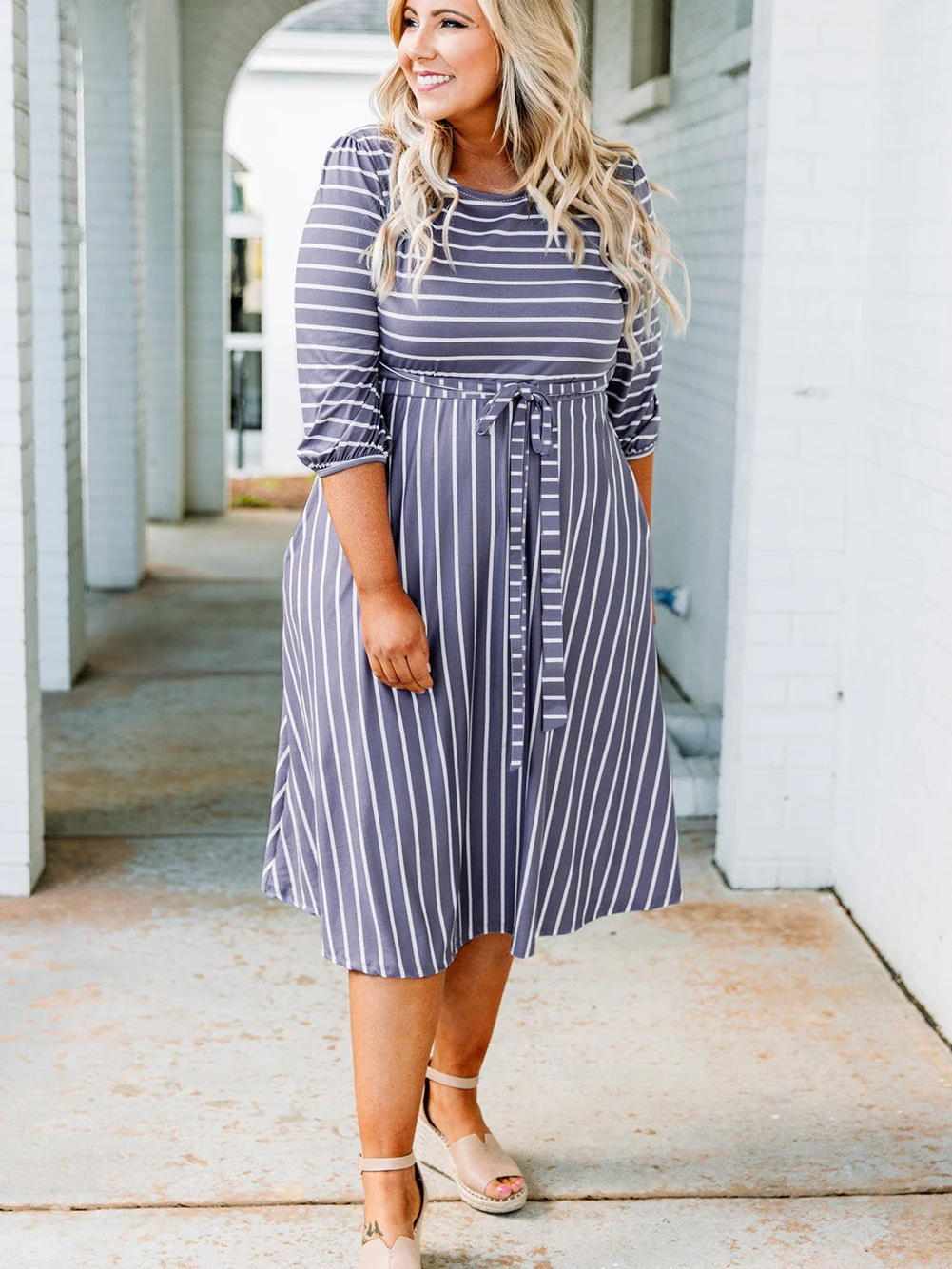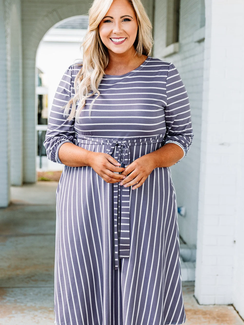 Elegant Gray Striped Tie Waist Midi Dress for Plus Size Women